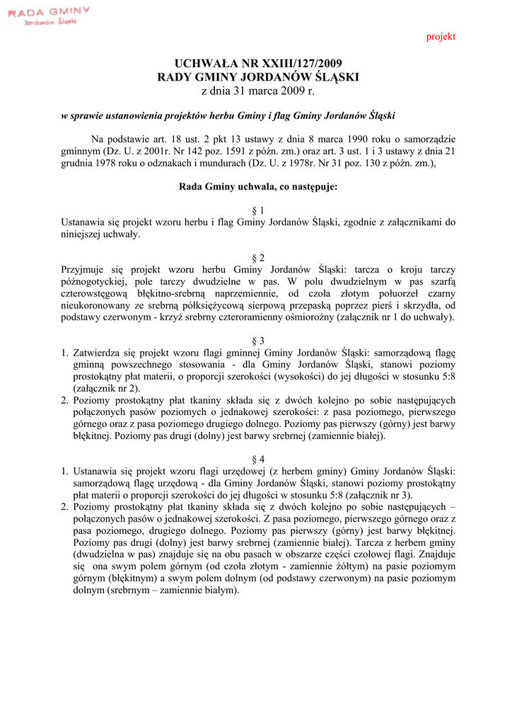 projekt UCHWAŁA NR XXIII/127/2009 RADY GMINY JORDANÓW ŚLĄSKI z dnia 31 marca 2009 r. w sprawie ustanowienia projektów herbu Gminy i flag Gminy Jordanów Śląski Na podstawie art. 18 ust. 2 pkt 13 ustawy z dnia 8 marca 1990 roku o samorządzie gminnym (Dz. U. z 2001r. Nr 142 poz. 1591 z późn. zm.) oraz art. 3 ust. 1 i 3 ustawy z dnia 21 grudnia 1978 roku o odznakach i mundurach (Dz. U. z 1978r. Nr 31 poz. 130 z późn. zm.), Rada Gminy uchwala, co następuje: §1 Ustanawia się projekt wzoru herbu i flag Gminy Jordanów Śląski, zgodnie z załącznikami do niniejszej uchwały. §2 Przyjmuje się projekt wzoru herbu Gminy Jordanów Śląski: tarcza o kroju tarczy późnogotyckiej, pole tarczy dwudzielne w pas. W polu dwudzielnym w pas szarfą czterowstęgową błękitno-srebrną naprzemiennie, od czoła złotym połuorzeł czarny nieukoronowany ze srebrną półksiężycową sierpową przepaską poprzez pierś i skrzydła, od podstawy czerwonym - krzyż srebrny czteroramienny ośmiorożny (załącznik nr 1 do uchwały). §3 1. Zatwierdza się projekt wzoru flagi gminnej Gminy Jordanów Śląski: samorządową flagę gminną powszechnego stosowania - dla Gminy Jordanów Śląski, stanowi poziomy prostokątny płat materii, o proporcji szerokości (wysokości) do jej długości w stosunku 5:8 (załącznik nr 2). 2. Poziomy prostokątny płat tkaniny składa się z dwóch kolejno po sobie następujących połączonych pasów poziomych o jednakowej szerokości: z pasa poziomego, pierwszego górnego oraz z pasa poziomego drugiego dolnego. Poziomy pas pierwszy (górny) jest barwy błękitnej. Poziomy pas drugi (dolny) jest barwy srebrnej (zamiennie białej). §4 1. Ustanawia się projekt wzoru flagi urzędowej (z herbem gminy) Gminy Jordanów Śląski: samorządową flagę urzędową - dla Gminy Jordanów Śląski, stanowi poziomy prostokątny płat materii o proporcji szerokości do jej długości w stosunku 5:8 (załącznik nr 3). 2. Poziomy prostokątny płat tkaniny składa się z dwóch kolejno po sobie następujących – połączonych pasów o jednakowej szerokości. Z pasa poziomego, pierwszego górnego oraz z pasa poziomego, drugiego dolnego. Poziomy pas pierwszy (górny) jest barwy błękitnej. Poziomy pas drugi (dolny) jest barwy srebrnej (zamiennie białej). Tarcza z herbem gminy (dwudzielna w pas) znajduje się na obu pasach w obszarze części czołowej flagi. Znajduje się ona swym polem górnym (od czoła złotym - zamiennie żółtym) na pasie poziomym górnym (błękitnym) a swym polem dolnym (od podstawy czerwonym) na pasie poziomym dolnym (srebrnym – zamiennie białym). projekt §5 1. Barwę złota i srebra używa się w odwzorowaniach unikatowych, realizowanych pojedynczo dla celów specjalnie reprezentacyjnych, stosując materiały srebrne i złote (jak również na drukach specjalnych). 2. W materiałach wykonywanych seryjnie barwę złotą zastępuje barwa żółta a barwę srebrną zastępuje barwa biała. §6 Barwami Gminy Jordanów Śląski są barwy: błękitna i srebrna (zamiennie biała). §7 Wizerunek projektu herbu Gminy Jordanów Śląski oraz projekty weksykologiczne (projekty flag) Gminy Jordanów Śląski chronione są uchwałą Rady Gminy oraz prawem autorskim autora projektów plastycznych herbu i flag Gminy Jordanów Śląski. §8 Wykonanie uchwały powierza się Wójtowi Gminy Jordanów Śląski. §9 Uchwała wchodzi w życie z dniem podjęcia. §7 Traci moc uchwała Nr XVI/121/93 w sprawie nadania herbu Gminie Jordanów Śląski z dnia 02 kwietnia 1993 roku. projekt UZASADNIENIE Wskazana w uchwale podstawa prawna umożliwia tworzenie współczesnych znaków samorządowych: herbów, flag, chorągwi, pieczęci oraz atrybutów władzy. Podstawowymi ustawami regulującymi kreowanie własnych znaków są: Ustawa o odznakach i mundurach z 21 grudnia 1978 roku, wraz z późniejszymi zmianami wprowadzonymi na mocy Ustawy z 29 grudnia 1998 roku o zmianie niektórych ustaw w związku z wdrożeniem reformy ustrojowej państwa oraz Ustawa o samorządzie gminnym z 8 marca 1990 roku. Wymienić również należy Rozporządzenie Rady Ministrów z 27 lipca 1999 roku w sprawie Komisji Heraldycznej i Rozporządzenie Ministra Spraw Wewnętrznych i Administracji z 20 stycznia 2000 roku w sprawie powołania Komisji Heraldycznej, której głównym zadaniem jest opiniowanie i przygotowywanie wzorcowych aktów prawnych w sprawach dotyczących szeroko pojętych insygniów i symboli samorządowych. Powyższa delegacja daje jednostkom samorządu terytorialnego możliwość ustanawiania w drodze uchwały organu stanowiącego danej jednostki własnych herbów, flag, emblematów, insygniów i innych symboli. Zauważmy, że Ustawa z 8 marca 1990 roku o samorządzie gminnym, w rozdziale 3, art. 18, punkt 13 przekazuje w wyłączne kompetencje rady gminy „podejmowanie uchwał w sprawie herbu gminy”, nowych symboli samorządowych III Rzeczypospolitej. Wypełniając swoje kompetencje 2 kwietnia 1993 roku Rada Gminy przyjęła uchwałę w Nr XVI/121/93 w sprawie nadania herbu Gminie Jordanów Śląski. Działo się to po roku 1989, kiedy to po transformacji ustrojowej i utworzeniu gmin jako podstawowych jednostek samorządu terytorialnego problem tożsamości zaczął być dla nich istotny. Jednakże, nie zdając sobie w pełni sprawy z założeń jakie określają konstruowanie takiego symbolu, szukano jakiegoś akcentu wyróżniającego Gminę. W tej sytuacji sięgnięto do czasów prehistorycznych - do młodej epoki kamienia (neolitu). Jako godło w herbie gminy przyjęto niezwykle pięknie wykonaną figurę ceramiczną – stojącego barana, zabytek archeologiczny z epoki zwanej także „kulturą jordanowską”, równoległą do kultury pucharów lejkowatych (4100-3000 lat p.n.e.). Ta unikatowa figura (realizowana w technice ceramicznej zwanej sznurkową) wydobyta została ze stanowiska archeologicznego (grodziska), które znajdowało się w obszarze samego Jordanowa i z