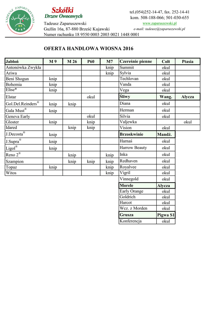 tel.(054)252-14-47, fax. 252-14-41 kom. 508-188-066; 501-030-655 www.zaparuszewski.pl Tadeusz Zaparuszewski e-mail: [email protected] Guźlin 16a, 87-880 Brześć Kujawski Numer rachunku 18 9550 0003 2003 0021 1448 0001 OFERTA HANDLOWA WIOSNA 2016 Jabłoń Antonówka Zwykła Ariwa Beni Shogun Bohemia Elise® M9 M 26 M7 knip knip knip knip knip Elstar Gol.Del.Reinders P60 okul ® knip knip Czereśnie pienne Summit Sylvia Techlovan Vanda Vega Śliwy Colt okul okul okul okul okul Wang. Diana okul okul okul Gala Must® Geneva Early Gloster Idared J.Decosta® knip knip Herman Silvia Valjewka Vision Brzoskwinie J.Supra® knip Harnaś okul knip Harrow Beauty okul Inka Redhaven Royalvee Vigril Vinnegold Morele Early Orange Goldrich Harcot Wcz. z Morden Grusza Konferencja okul okul okul okul okul Ałycza okul okul okul okul Pigwa S1 okul Ligol ® Reno 2® Szampion Topaz Witos knip knip knip knip knip okul knip knip knip knip knip knip knip Ptasia Ałycza okul okul Mandż.