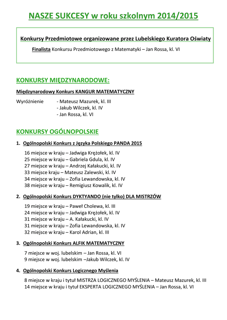 Konkursy Przedmiotowe organizowane przez Lubelskiego Kuratora Oświaty Finalista Konkursu Przedmiotowego z Matematyki – Jan Rossa, kl. VI KONKURSY MIĘDZYNARODOWE: Międzynarodowy Konkurs KANGUR MATEMATYCZNY Wyróżnienie - Mateusz Mazurek, kl. III - Jakub Wilczek, kl. IV - Jan Rossa, kl. VI KONKURSY OGÓLNOPOLSKIE 1. Ogólnopolski Konkurs z Języka Polskiego PANDA 2015 16 miejsce w kraju – Jadwiga Krężołek, kl. IV 25 miejsce w kraju – Gabriela Gdula, kl. IV 27 miejsce w kraju – Andrzej Kałakucki, kl. IV 33 miejsce kraju – Mateusz Zalewski, kl. IV 34 miejsce w kraju – Zofia Lewandowska, kl. IV 38 miejsce w kraju – Remigiusz Kowalik, kl. IV 2. Ogólnopolski Konkurs DYKTYANDO (nie tylko) DLA MISTRZÓW 19 miejsce w kraju – Paweł Cholewa, kl. III 24 miejsce w kraju – Jadwiga Krężołek, kl. IV 31 miejsce w kraju – A. Kałakucki, kl. IV 31 miejsce w kraju – Zofia Lewandowska, kl. IV 32 miejsce w kraju – Karol Adrian, kl. III 3. Ogólnopolski Konkurs ALFIK MATEMATYCZNY 7 miejsce w woj. lubelskim – Jan Rossa, kl. VI 9 miejsce w woj. lubelskim –Jakub Wilczek, kl. IV 4. Ogólnopolski Konkurs Logicznego Myślenia 8 miejsce w kraju i tytuł MISTRZA LOGICZNEGO MYŚLENIA – Mateusz Mazurek, kl. III 14 miejsce w kraju i tytuł EKSPERTA LOGICZNEGO MYŚLENIA – Jan Rossa, kl. VI 5. Ogólnopolski Konkurs Języka Angielskiego OLIMPUSEK (sesja wiosenna) 4 miejsce w kraju i tytuł LAUREATA – Amelia Tomczewska, kl. I 7 miejsce w kraju i tytuł LAUREATA – Amelia Jakubowska, kl. I 14 miejsce w kraju – Blanka Krojec, kl. I 14 miejsce w kraju – Magdalena Rzeczycka, kl. I 6. Ogólnopolski Konkurs Języka Angielskiego dla klas I – III OLIMPUSEK (sesja zimowa) 11 miejsce w kraju i tytuł LAUREATA – Amelia Tomczewska, kl. I 7. Ogólnopolski Konkurs z Języka Angielskiego OLIMPUS (sesja wiosenna) 13 miejsce w kraju i tytuł LAUREATA – Andrzej Kałakucki, kl. IV 8. Ogólnopolski Konkurs z Języka Angielskiego GALILEO 7 miejsce w kraju i tytuł LAUREATA – Andrzej Kałakucki, kl. IV 9. Ogólnopolski Konkurs z Języka Angielskiego OLIMPUS (sesja zimowa) 11 miejsce w kraju – Andrzej Kałakucki, kl. IV 10. Ogólnopolski Konkurs z Języka Angielskiego MULTITEST 26 miejsce w kraju – A. Kałakucki, kl. IV 11. Ogólnopolski Konkurs z Języka Angielskiego PANDA 7 miejsce w kraju – Andrzej Kałakucki, kl. IV 9 miejsce w kraju – Karol Rutkowski, kl. V 12. Ogólnopolski Konkurs z Języka Angielskiego ALBUS 7 miejsce w kraju i tytuł LAUREATA – Andrzej Kałakucki, kl. IV 8 miejsce w kraju i tytuł LAUREATA – Aleksander Kałakucki, kl. IV 13 miejsce w kraju i WYRÓŻNIENIE – Remigiusz Kowalik, kl. IV 13 miejsce w kraju i WYRÓŻNIENIE – Zofia Lewandowska, kl. IV 14 miejsce w kraju i WYRÓŻNIENIE – Jakub Wilczek, kl. IV 13. Ogólnopolski Konkurs Języka Niemieckiego GALILEO 11 miejsce w kraju, wyróżnienie - Andrzej Kałakucki, kl. IV 14. Ogólnopolski Konkurs Języka Niemieckiego SPRACHDOKTOR LAUREAT – Andrzej Kałakucki, kl. IV Dyplom za bardzo dobry wynik w kraju – Karol Rutkowski, kl. V Dyplom za dobry wynik w kraju – Aleksander Kałakucki, kl. IV 15. Ogólnopolski Konkurs Języka Niemieckiego DEUTSCHFREUND 3 miejsce w woj. lubelskim – Karol Rutkowski, kl. V 11 miejsce w woj. lubelskim – Aleksandra Kwiecień, kl. VI 16. Ogólnopolska Olimpiada z Języka Niemieckiego OLIMPUS (sesja jesienna) LAUREAT – Aleksander Kałakucki, kl. IV LAUREAT – Karol Rutkowski, kl. V 17. Ogólnopolski Konkurs z Języka Niemieckiego MULTITEST 18 miejsce w kraju – Andrzej Kałakucki, kl. IV 28 miejsce w kraju – Mateusz Zalewski, kl. IV 35 miejsce w kraju – Aleksandra Kwiecień, kl. VI 18. Ogólnopolski Konkurs Biblijny „Biblia i przypowieści Biblijne” WYRÓŻNIENIE – Paweł Cholewa, kl. III 19. Ogólnopolski Konkurs Plastyczny „Dzień bez samochodu” I miejsce w kraju – Magdalena Medyńska, oddział zerowy KONKURSY WOJEWÓDZKIE 1. Wojewódzki Konkurs Plastyczny KOTY TRZPIOTY II miejsce i SPECJALNE WYRÓŻNIENIE – Helena Krężołek, kl. I Wyróżnienie – Magdalena Medyńska, oddział zerowy, Wyróżnienie – Jadwiga Krężołek, kl. IV 2. Wojewódzki Konkurs Wiedzy o Krajach Unii Europejskiej Wyróżnienie –Paweł Cholewa, kl. III Wyróżnienie – Kacper Dzioba, kl. III