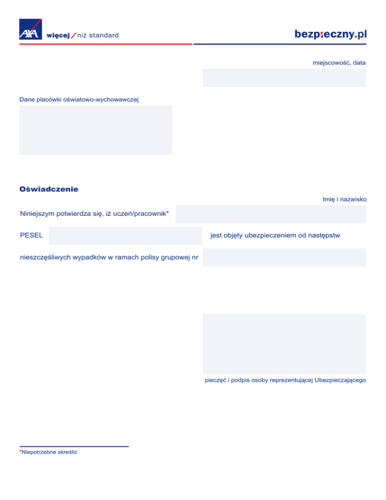 miejscowość, data Dane placówki oświatowo-wychowawczej Oświadczenie Imię i nazwisko Niniejszym potwierdza się, iż uczeń/pracownik* PESEL jest objęty ubezpieczeniem od następstw nieszczęśliwych wypadków w ramach polisy grupowej nr pieczęć i podpis osoby reprezentującej Ubezpieczającego *Niepotrzebne skreślić