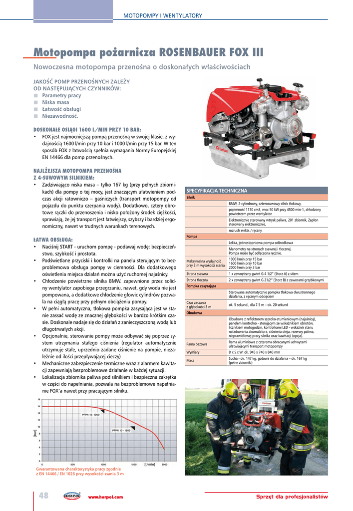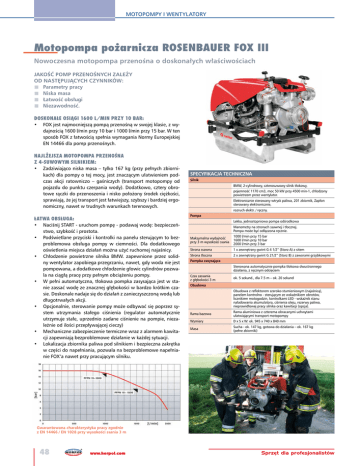 MOTOPOMPY I WENTYLATORY Motopompa pożarnicza ROSENBAUER FOX III Nowoczesna motopompa przenośna o doskonałych właściwościach JAKOŚĆ POMP PRZENOŚNYCH ZALEŻY OD NASTĘPUJĄCYCH CZYNNIKÓW: Parametry pracy Niska masa Łatwość obsługi Niezawodność. DOSKONAŁE OSIĄGI 1600 L/MIN PRZY 10 BAR: • FOX jest najmocniejszą pompą przenośną w swojej klasie, z wydajnością 1600 l/min przy 10 bar i 1000 l/min przy 15 bar. W ten sposób FOX z łatwością spełnia wymagania Normy Europejskiej EN 14466 dla pomp przenośnych. NAJLŻEJSZA MOTOPOMPA PRZENOŚNA Z 4-SUWOWYM SILNIKIEM: • Zadziwiająco niska masa – tylko 167 kg (przy pełnych zbiornikach) dla pompy o tej mocy, jest znaczącym ułatwieniem podczas akcji ratowniczo – gaśniczych (transport motopompy od pojazdu do punktu czerpania wody). Dodatkowo, cztery obrotowe rączki do przenoszenia i nisko położony środek ciężkości, sprawiają, że jej transport jest łatwiejszy, szybszy i bardziej ergonomiczny, nawet w trudnych warunkach terenowych. ŁATWA OBSŁUGA: • • • • • • • Naciśnij START - uruchom pompę - podawaj wodę: bezpieczeństwo, szybkość i prostota. Podświetlane przyciski i kontrolki na panelu sterującym to bezproblemowa obsługa pompy w ciemności. Dla dodatkowego oświetlenia miejsca działań można użyć ruchomej najaśnicy. Chłodzenie powietrzne silnika BMW. zapewnione przez solidny wentylator zapobiega przegrzaniu, nawet, gdy woda nie jest pompowana, a dodatkowe chłodzenie głowic cylindrów pozwala na ciągłą pracę przy pełnym obciążeniu pompy. W pełni automatyczna, tłokowa pompka zasysająca jest w stanie zassać wodę ze znacznej głębokości w bardzo krótkim czasie. Doskonale nadaje się do działań z zanieczyszczoną wodą lub długotrwałych akcji. Opcjonalnie, sterowanie pompy może odbywać się poprzez system utrzymania stałego ciśnienia (regulator automatycznie utrzymuje stałe, uprzednio zadane ciśnienie na pompie, niezależnie od ilości przepływającej cieczy) Mechaniczne zabezpieczenie termiczne wraz z alarmem kawitacji zapewniają bezproblemowe działanie w każdej sytuacji. Lokalizacja zbiornika paliwa pod silnikiem i bezpieczna zakrętka w części do napełniania, pozwala na bezproblemowe napełnianie FOX’a nawet przy pracującym silniku. Gwarantowana charakterystyka pracy zgodnie z EN 14466 / EN 1028 przy wysokości ssania 3 m 48 SPECYFIKACJA TECHNICZNA Silnik BMW, 2-cylindrowy, czterosuwowy silnik tłokowy, pojemność 1170 cm3, moc 50 kW przy 4500 min-1, chłodzony powietrzem przez wentylator. Elektronicznie sterowany wtrysk paliwa, 201 zbiornik, Zapłon sterowany elektronicznie, rozruch elektr. / ręczny. Pompa Lekka, jednostopniowa pompa odśrodkowa Manometry na stronach ssawnej i tłocznej. Pompa może być odłączona ręcznie. Maksymalna wydajność przy 3 m wysokości ssania 1000 l/min przy 15 bar 1600 l/min przy 10 bar 2000 l/min przy 3 bar Strona ssawna 1 x zewnętrzny gwint G 4 1/2” (Storz A) z sitem Strona tłoczna 2 x zewnętrzny gwint G 21/2” (Storz B) z zaworami grzybkowymi Pompka zasysająca Sterowana automatycznie pompka tłokowa dwustronnego działania, z ręcznym odcięciem Czas zassania z głębokości 3 m ok. 5 sekund., dla 7.5 m – ok. 20 sekund Obudowa Obudowa z reflektorem szeroko-stumieniowym (najaśnicą), panelem kontrolno - sterującym ze wskaźnikiem obrotów, licznikiem motogodzin, kontrolkami LED - wskaźnik stanu naładowania akumulatora, ciśnienia oleju, rezerwy paliwa, nieprawidłowej pracy silnika oraz kawitacji (opcja). Rama bazowa Rama aluminiowa z czterema obracanymi uchwytami ułatwiającymi transport motopompy Wymiary D x S x W: ok. 945 x 740 x 840 mm Masa Sucha - ok. 147 kg, gotowa do działania – ok. 167 kg (pełne zbiorniki)