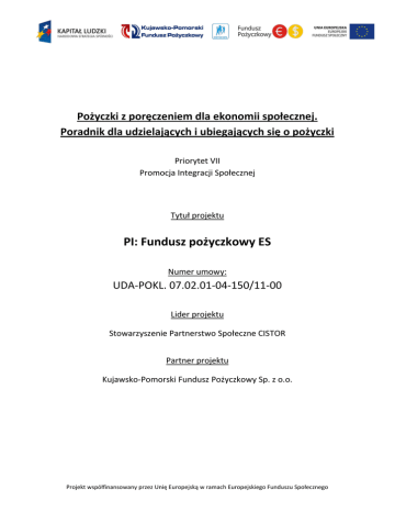 Pożyczki z poręczeniem dla ekonomii społecznej. Poradnik dla udzielających i ubiegających się o pożyczki Priorytet VII Promocja Integracji Społecznej Tytuł projektu PI: Fundusz pożyczkowy ES Numer umowy: UDA-POKL. 07.02.01-04-150/11-00 Lider projektu Stowarzyszenie Partnerstwo Społeczne CISTOR Partner projektu Kujawsko-Pomorski Fundusz Pożyczkowy Sp. z o.o. Projekt współfinansowany przez Unię Europejską w ramach Europejskiego Funduszu Społecznego SPIS TREŚCI Wstęp ..…………………………………………………………………….……………………………….….….…. str. 3 Słownik pojęć ..………………………………………………………………...…………………………..….…. str. 4 Struktura produktu …………………………………………………………….…………………….….……… str. 6 Dlaczego i jak powstały pożyczki dla ekonomii społecznej i co je wyróżnia …….……. str. 8 Instrukcja stosowania produktu ……………………………………….…..………………………….…. str. 13 str. 13 Umowy …………………………………..………………………………………………..…………………….……... str. 17 Formularze ……………………………………………………………………………………………….….……..…. str.25 Poradnik dla Podmiotów Ekonomii Społecznej ubiegających się o pożyczkę …….… str. 29 Załączniki ………………………..…………………………………………..……………………………………… str. 37 Strona 2 Regulaminy i procedury ……………………………………………………….….…………….……….…….… Projekt współfinansowany przez Unię Europejską w ramach Europejskiego Funduszu Społecznego WSTĘP Poradnik „Pożyczki z poręczeniem dla ekonomii społecznej” w prosty sposób opisuje wypracowany w województwie kujawsko-pomorskim, w projekcie „PI: Fundusz Pożyczkowy ES” model pożyczek dla podmiotów ekonomii społecznej. Pożyczek, które mają wyjątkowy charakter, bowiem zostały opracowane specjalnie dla podmiotów ekonomii społecznej i z udziałem tych podmiotów w przygotowaniu oferty pożyczkowej (zostały „skrojone na miarę”). Co więcej, pożyczki te zostały przetestowane, tzn. pięć różnych podmiotów ekonomii społecznej (stowarzyszenia, fundacje, podmioty kościelne) skorzystało z oferty opisanej w poradniku i dzięki ich zaangażowaniu możliwe było sprawdzenie w praktyce koncepcji „pożyczek dla PES”. Możliwa była weryfikacja które z rozwiązań są praktyczne, zgodne z oczekiwaniami podmiotów ekonomii społecznej i wpisujące się w ich potrzeby. Opis procedur udzielania pożyczek, a także wzory stosowanych w tej procedurze dokumentów to rozwiązania sprawdzone przez podmioty ekonomii społecznej o różnym zakresie działalności i o różnej kondycji finansowej Opracowanie zawiera strukturę produktu, jego ewolucję w trakcie fazy testowania wraz z opisem czynników które wpłynęły na pierwotny kształt produktu oraz jego zmiany. W opracowaniu zamieszczono również definicje pojęć, które w trakcie realizacji projektu wymagały dokładniejszego wyjaśnienia odbiorcom produktu. Opracowanie to jest skierowane do Podmiotów Ekonomii Społecznej, które będą korzystać z pożyczek oraz Jednostek Samorządu Terytorialnego, Funduszy Pożyczkowych i Poręczeniowych, które zamierzają wdrażać finansowanie zwrotne dla PES. Osoby zaineresowane sposobem wypełniania formularzy podczas wnioskowania o pożyczkę zapraszam do lektury części przeznaczonej dla Podmiotów Ekonomii Społecznej (str. 29 niniejszego opracowania). Strona 3 Instrukcja wdrażania procedur oraz opis dokumentów dla Funduszy oraz Jednostek Samorządu Terytorialnego zaczyna się od strony 13. Projekt współfinansowany przez Unię Europejską w ramach Europejskiego Funduszu Społecznego Słownik pojęć Produkt – Pożyczka z poręczeniem dla Podmiotów Ekonomii Społecznej, na którą składają się procedury oraz dokumenty opisywane szczegółowo w niniejszej Instrukcji. Odbiorca – Podmiot Ekonomii Społecznej posiadający siedzibę oraz działający na terenie danego województwa. Użytkownik – to Fundusz Pożyczkowy lub Poręczeniowy posiadający doświadczenie w wspieraniu małych i średnich przedsiębiorstw oraz gotowy na udzielanie wsparcia finansowego dla PES. PES – Podmioty Ekonomii Społecznej (według definicji POKL) do których zaliczone zostały: spółdzielnie pracy, spółdzielnie inwalidów i niewidomych, organizacje pozarządowe oraz podmioty wymienione w art. 3 ust. 3 ustawy z dnia 24 kwietnia 2003 r. o pożytku publicznym i wolontariacie (Dz. U. z dnia 29 maja 2003 r. z późn. zm.) FPK – Fundusz Poręczeń Kredytowych FP – Fundusz Pożyczkowy MŚP – (Zgodnie z art. 1 załącznika I do Rozporządzenia Komisji (WE) nr 800/2008 z dnia 6 sierpnia 2008 r. uznające niektóre rodzaje pomocy za zgodne ze wspólnym rynkiem w zastosowaniu art. 87 i 88 Traktatu (ogólne rozporządzenie w sprawie wyłączeń blokowych) (Dz. Urz. UE L 214 z 9.08.2008, str. 3) wyodrębnia się następujące kategorie przedsiębiorstw: średnie przedsiębiorstwo: •zatrudnia mniej niż 250 pracowników oraz •jego roczny obrót nie przekracza 50 milionów euro lub roczna suma bilansowa nie przekracza 43 milionów euro; małe przedsiębiorstwo: •zatrudnia mniej niż 50 pracowników oraz •jego roczny obrót nie przekracza 10 milionów euro lub roczna suma bilansowa nie przekracza 10 milionów euro; mikroprzedsiębiorstwo: •zatrudnia mniej niż 10 pracowników oraz •jego roczny obrót nie przekracza 2 milionów euro lub roczna suma bilansowa nie przekracza 2 milionów euro. Projekt współfinansowany przez Unię Europejską w ramach Europejskiego Funduszu Społecznego Strona - za m