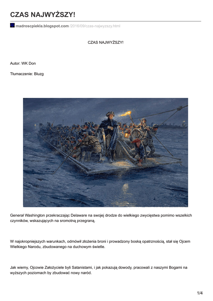 CZAS NAJWYŻSZY! madroscpiekla.blogspot.com /2016/09/czas-najwyzszy.html CZAS NAJWYŻSZY! Autor: WK Don Tłumaczenie: Bluzg Generał Washington przekraczając Delaware na swojej drodze do wielkiego zwycięstwa pomimo wszelkich czynników, wskazujących na sromotną przegraną. W najokropniejszych warunkach, odmówił złożenia broni i prowadzony boską opatrznością, stał się Ojcem Wielkiego Narodu, zbudowanego na duchowym świetle. Jak wiemy, Ojcowie Założyciele byli Satanistami, i jak pokazują dowody, pracowali z naszymi Bogami na wyższych poziomach by zbudować nowy naród. 1/4 Wielu z Założycieli byli oryginalnymi(prawdziwymi) i niesplugawionymi Masonami, nadal znającymi duchowe nauki które pozwalały otworzyć im ośrodki jasnowidzenia, co umożliwiało komunikacje z Bogami. Franklin wspominał o tym w swoich wypowiedziach. Faktem jest że sytuacja w naszych czasach jest dla nas tak samo straszna jak w tamtych. Wielu jest zdemoralizowanych; wielu się poddało i wybrało apatię na żydowską tyranię, która zagraża ludzkości. Jeszcze więcej, przez ignorancję czy zdradę, stało się aktywnymi agentami tej tyrani. W związku z powyższym, NIE ma teraz czasu na bycie leniwym czy słabym duchem. Teraz, bardziej niż kiedykolwiek, jest czas na walkę, jak Washington, kiedy większość się poddała. Walka z przeciwnościami, które są nieludzkie i złe, jest cechą ludzkiej duszy. Ludzkość to w duszy rasa Bohaterów, i nadal mamy to w sercu. To ciemność przed świtem. W starciu z taką rzeczywistością, co zamierzacie zrobić? Poddacie się wyparciu i apatii? Czy heroicznie powstaniecie i zrobicie swoje, jak wielu przed wami? Bogowie w was wierzą, Szatan ufa wam całkowicie. Nie popsujcie tego. Pokolenia naszych Przodków walczyły za naszą prawdziwą wolność, podając wam pomocną dłoń. Nie bójcie się jej złapać. Nie pozwólcie, by uświęcone przez nich sztandary upadły przed wrogami ludzkości, gdyż są one także waszymi sztandarami. To czas by się sprawdzić, i użyć własnych środków. Co robimy by pomóc? Co jeszcze możemy zrobić żeby pomóc mocniej? 2/4 - Używać run by wznieść energie i dawać ją Lilith codziennie - Edukować ludzi przez aktywność internetową - Brać udział w duchowej wojnie przeciwko wrogom Szatana i ludzkości - Wzmacniać siebie codziennie przez medytacje - Kształcić się na przywódców jutra - Pytać Bogów o to, jak najlepiej możesz codziennie trwać w walce o Wolność W jakim świecie ty i przyszłe pokolenia chcecie żyć? Jeśli to świat prawdy i wiecznej wolności, nigdy niekończącego się światła, to musisz zacząć działać by tak się stało, jak bohaterowie naszej przeszłości. Wolność, i Wieczna Prawda musi być obroniona i wywalczona! Wybierz światło, weź udział w walce. Decyzje które podejmujesz, określają naszą przyszłość. Washington w Bitwie pod Princeton prowadzący jego siły do zwycięstwa nad największym supermocarstwem wszech czasów. Brytanią, kontrolowaną przez żydowskich Rothschildów. 3/4 PRAWDA JEST SILNIEJSZA OD KŁAMSTW! WOLNOŚĆ JEST SILNIEJSZA OD TYRANI! CZAS NAJWYŻSZY! 4/4