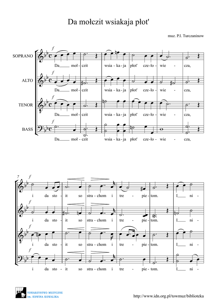 Da mołczit wsiakaja płot' muz. P.I. Turczaninow ° b f œ œ œ SOPRANO & b c œ Da ˙™ moł - czit Œ œ œ œ œ ˙ b œ & b c œ œ œ ˙™ ‹ Da moł - czit Œ Da moł - czit f TENOR ? bc ˙™ BASS ¢ b f 7 f i b &b ˙ f i da sto - it f ?bœ œ œ œ ¢ b i #˙ ™ da sto - it b œ & b œ nœ œ ‹ i da sto f moł - czit œ œ œ ˙™ œ œ ˙™ ˙™ œ Da ° b˙ &b wsia - ka - ja płot' b & b c œ œ œ œ #˙ ™ f ALTO nœ Œ œ œ œ ˙ ˙™ - it ˙™ da sto - it œ ˙ so so ˙ Œ ˙ œ œ n˙ œ œ wsia - ka - ja płot' r œ ™™ œ œ ˙ i tre r œ™™ œ ˙™ i tre i tre r ™ ˙ ™™ œ œ stra - chom - œ œ ˙ - - - cze - ło - wie œ cze - ło - wie #œ ˙ ™ pie - tom. œœ ˙˙ ™™ pie - tom. i tre - œ - ˙™ pie - tom. Œ Œ œ œ ˙ I ni - ˙ ni - œ œ ˙ I Œ ˙™ cza, Œ n˙ pie - tom. Œ ˙™ ˙™ I Œ ˙™ cza, - Œ Œ cza, - œ w ˙™ cza, #˙ cze - ło - wie œ ™™ œ œ œ ™ œ œ œ ˙ ™ R stra - chom œ ˙ cze - ło - wie œ œ œ œ œ œ œ ˙™ wsia - ka - ja płot' stra - chom œ ˙ so n˙ stra - chom nœ ˙ so wsia - ka - ja płot' œ œ œ ˙™ ˙ ˙ I ni - œ œ ni - http://www.idn.org.pl/towmuz/biblioteka ° b˙ &b 2 13 ˙ czto - że b &b ˙ ˙ czto - że b˙ ˙ b & ‹ czto - że ?b˙ ¢ b ˙ czto - że ° b &b œ œ ˙ 19 czto - że b & b œ #œ ˙ czto - że b˙ ˙ &b ‹ czto - że ?b˙ ¢ b ˙ czto - że subito p œ œ œ œ œ> œ œ œ œ w f ziem- no - je w sie - bie - da po - my - szla subito p œ œ œ œ - œ œ œ œ w ziem- no - je w sie - bie - da po - my - szla œ œ œ œ subito p œ œ œ œ ˙ œ œ œ œ œ œ œ w œ w ziem- no - je w sie - bie - da po - my - szla œ œ œ œ œ œ œ œ ziem- no - je w sie - bie da po - my - œ œ œ œ œ œ œ œ ziem- no - je w sie - bie da po - my - œ nœ œ œ œ #œ œ œ ziem- no - je w sie - bie da po - my - i ni - ˙™ œ i ni - œ œ œ œ œ œ œ œ - - ˙ - - jet, i ˙™ œ Œ Ó jet, ˙™ ˙™ szla - w - f ni - Œ w w Car' bo Œ w w Car' bo jet. œ ˙™ w Œ w jet. Car' ˙™ w Œ w jet. œ i jet. ˙™ ni - f f - szla f jet, ˙ szla szla jet, f œ œ œ œ œ ˙ #˙ ziem- no - je w sie - bie da po - my - œ nœ œ œ ˙ - œ Œ Ó - ziem- no - je w sie - bie - da po - my - szla subito p œ œ œ œ œ œ œ œ f f Car' w ww bo w w bo http://www.idn.org.pl/towmuz/biblioteka ° b &b ˙ œ œ ˙™ b &b ˙ œ œ #˙ ™ 26 3 car - stwu -jusz - czich, car - stwu - jusz - czich, Œ œ œœ œ w œ œ ˙ Œ ˙™ œ œ ˙ i gos- pod', œ #w i gos- pod', b ˙ œ œ ˙™ Œ œ œ œ œ w b & ‹ car - stwu -jusz - czich, i gos- pod', ?b˙ ¢ b ˙ œ œ ˙™ ° b &b ˙™ > œ ˙ Œ ˙™ car - stwu -jusz - czich, 33 czich, b &b ˙™ czich, czich, nœ ˙ nœ ˙ gos- pod', œ œ ˙™ œ œ ˙™ pri - cho - dit za - kła b ˙ ™ nœ ˙ b & ‹ czich, pri - cho ? b ˙™ ¢ b ˙™ i pri - cho - dit za - kła œ ˙ œ w - - œ œ ˙™ - dit za - kła ˙™ œ œ pri - cho - dit za - kła - - i ˙ ˙ œ œ gos - pod' gos - pod - stwu - jusz - i ˙ ˙ œ #œ œ œ gos - pod' gos - pod - stwu - jusz - œ nœ ˙ i ˙ ˙ ˙ œ œ gos - pod' gos - pod - stwu - jusz - œ nœ i ˙ ˙ ˙ ˙ ˙ œ œ gos - pod' gos - pod - stwu- jusz - U j œ œ œ œ œ œ œ œ œ œ™ œ ˙ ti - sia œ ˙ i Ó w ti - sia i ti - sia i œ ˙™ da - ti - sia, U j #œ ™ œ œ nœ da - ti - sia, U œ œ ™ œ œ œ œ œ œ œ œ œ œ œ J ˙ ti - sia Ó i da - ti - sia, U œ œ™ œ œ œ J da - ti - sia, http://www.idn.org.pl/towmuz/biblioteka ° bp œ ˙ &b œ 4 39 i bp b & w i p bœ œ ˙ &b ‹ i ?b ¢ b w p i œ™ œ œ J œ w da - ti - sia w snied' wier j œ™ #œ œ œ œ #˙ ™ œ™ œ œ J œ ˙ da - ti - sia w snied' wier da - ti - sia w snied' wier j œ™ œ œ œ - - ˙ - w da - ti - sia w snied' wier - U w nym. U w nym. ˙ ˙ U w A - min'. #˙ ˙ U w A nym. A - min'. nym. w w - min'. U w w - U #w w A min'. U w U w w http://www.idn.org.pl/towmuz/biblioteka