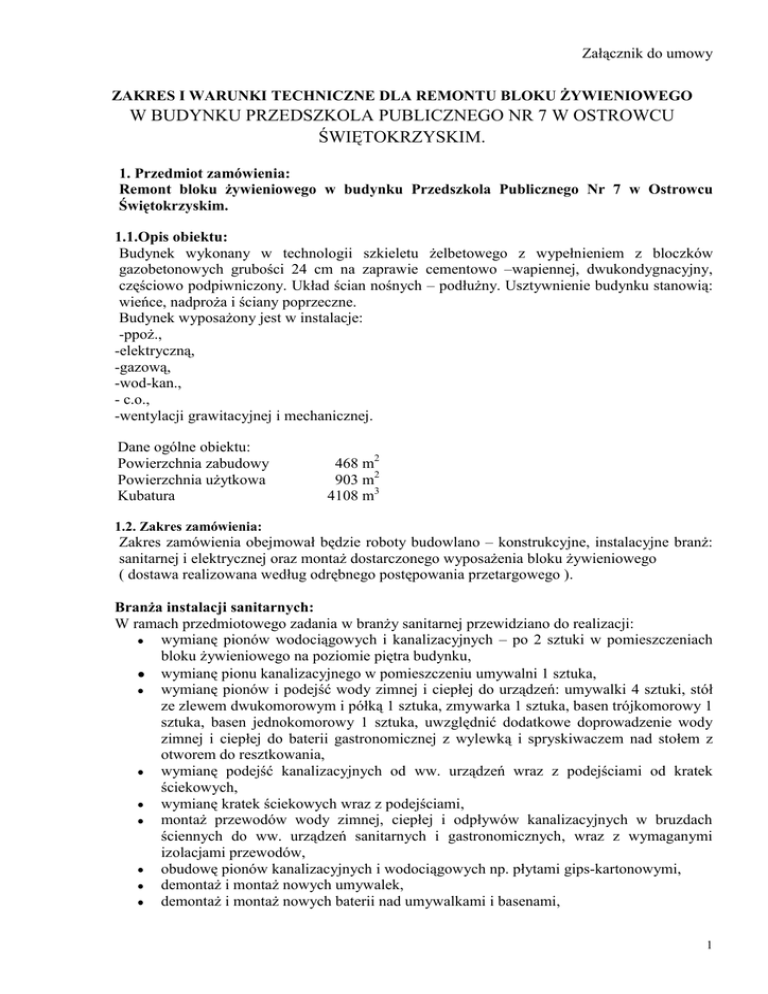 Załącznik do umowy ZAKRES I WARUNKI TECHNICZNE DLA REMONTU BLOKU ŻYWIENIOWEGO W BUDYNKU PRZEDSZKOLA PUBLICZNEGO NR 7 W OSTROWCU ŚWIĘTOKRZYSKIM. 1. Przedmiot zamówienia: Remont bloku żywieniowego w budynku Przedszkola Publicznego Nr 7 w Ostrowcu Świętokrzyskim. 1.1.Opis obiektu: Budynek wykonany w technologii szkieletu żelbetowego z wypełnieniem z bloczków gazobetonowych grubości 24 cm na zaprawie cementowo –wapiennej, dwukondygnacyjny, częściowo podpiwniczony. Układ ścian nośnych – podłużny. Usztywnienie budynku stanowią: wieńce, nadproża i ściany poprzeczne. Budynek wyposażony jest w instalacje: -ppoż., -elektryczną, -gazową, -wod-kan., - c.o., -wentylacji grawitacyjnej i mechanicznej. Dane ogólne obiektu: Powierzchnia zabudowy Powierzchnia użytkowa Kubatura 468 m2 903 m2 4108 m3 1.2. Zakres zamówienia: Zakres zamówienia obejmował będzie roboty budowlano – konstrukcyjne, instalacyjne branż: sanitarnej i elektrycznej oraz montaż dostarczonego wyposażenia bloku żywieniowego ( dostawa realizowana według odrębnego postępowania przetargowego ). Branża instalacji sanitarnych: W ramach przedmiotowego zadania w branży sanitarnej przewidziano do realizacji: wymianę pionów wodociągowych i kanalizacyjnych – po 2 sztuki w pomieszczeniach bloku żywieniowego na poziomie piętra budynku, wymianę pionu kanalizacyjnego w pomieszczeniu umywalni 1 sztuka, wymianę pionów i podejść wody zimnej i ciepłej do urządzeń: umywalki 4 sztuki, stół ze zlewem dwukomorowym i półką 1 sztuka, zmywarka 1 sztuka, basen trójkomorowy 1 sztuka, basen jednokomorowy 1 sztuka, uwzględnić dodatkowe doprowadzenie wody zimnej i ciepłej do baterii gastronomicznej z wylewką i spryskiwaczem nad stołem z otworem do resztkowania, wymianę podejść kanalizacyjnych od ww. urządzeń wraz z podejściami od kratek ściekowych, wymianę kratek ściekowych wraz z podejściami, montaż przewodów wody zimnej, ciepłej i odpływów kanalizacyjnych w bruzdach ściennych do ww. urządzeń sanitarnych i gastronomicznych, wraz z wymaganymi izolacjami przewodów, obudowę pionów kanalizacyjnych i wodociągowych np. płytami gips-kartonowymi, demontaż i montaż nowych umywalek, demontaż i montaż nowych baterii nad umywalkami i basenami, 1 montaż baterii gastronomicznej z wylewką i spryskiwaczem do lokalizacji nad stołem z otworem do resztkowania, wykonanie prób szczelności instalacji wodnej i kanalizacyjnej, materiały: rury, umywalki, baterie, kratki ściekowe – materiał Wykonawcy. Wszystkie zastosowane materiały winny być w gatunku I oraz posiadać stosowne atesty, certyfikaty, dopuszczenia do obrotu na materiały stosowane do budowy. Przed wbudowaniem Wykonawca winien przekazać przedstawicielowi Zamawiającego atesty, certyfikaty, dopuszczenia do obrotu na materiały stosowane do budowy. Uwaga! W ofercie należy uwzględnić montaż urządzeń bloku żywieniowego: stołu ze zlewem dwukomorowym i półką, stołu z otworem do resztkowania, basenu jednokomorowego ( dostawa realizowana według odrębnego postępowania przetargowego. Planowany termin dostawy wyposażenia ok. 14.08.2013 roku.). Uwaga! Przedmiar robót nie stanowi podstawy do wyceny robót, jest tylko elementem pomocniczym Oferentowi przy sporządzaniu oferty. Pomieszczenie zmywalni: 1. Demontaż umywalki 1 kpl., 2. Demontaż basenu trójkomorowego 1 kpl., 3. Demontaż podejścia odpływowego z rur żeliwnych o śr. 50 80 mm ( umywalka, zlew – basen trójkomorowy, zmywarka ) 5 szt., 4. Demontaż rurociągu żeliwnego kanalizacyjnego o śr. 50 – 100 mm na ścianach budynku 6,5 m, 5. Demontaż rurociągów stalowych o połączeniach spawanych o śr. 10-20 mm 5,5 m, 6. Przeczyszczenie rurociągu żeliwnego kanalizacyjno, pionowego o śr. 100 mm 1 msc, 7. Przeczyszczenie rurociągu żeliwnego kanalizacyjno, poziomego o śr. 100 mm krotność 3 razy 1 msc, 8. Wykucie bruzd poziomych 1 /2x1/2 ceg. w ścianach z cegieł na zaprawie wapiennej – dla krycia rur 8 m, 9. Rurociągi w instalacjach wodociągowych o śr. nom. 15 mm stalowe, ocynkowane o połączeniach gwintowanych , na ścianach w budynkach niemieszkalnych 4 m, 10. Dodatkowe nakłady na wykonanie podejść dopływowych od zaworów wypływowych , baterii, hydrantów, mieszaczy itp. ośr. nominalnej 15 mm 4 szt, 11. Montaż rurociągów z PVC o śr. 50 mm na ścianach z łączeniem metodą wciskową 4 m, 12. Dodatek za wykonanie podejść odpływowych z rur i kształtek z nieplastyfikowanego PVC o śr. 50 mm – umywalka, zmywarka, zlew dwukomorowy z półką, stół z otworem do resztkowania 5 szt., 13. Montaż umywalki pojedynczej, porcelanowej z syfonem gruszkowym 1 szt., 14. Montaż zlewu dwukomorowego z syfonem 1 szt., 15. Montaż zmywarki 1 szt., 16. Montaż stołu z otworem do resztkowania 1 szt., 17. Baterie umywalkowe lub zmywakowe ścienne o śr. nom.15 mm – 2 szt., 18. Bateria gastronomiczna z wylewką i spryskiwaczem o śr. nom.15 mm 1 szt., 19. Wykucie bruzd poziomych w podłodze – wymiana podejścia do kratki ściekowej 1,5 m, 20. Demontaż istniejącej kratki ściekowej wraz z podejściem do pionu 1 szt, 21. Montaż rurociągów z PVC o śr. 50 mm w podłodze z łączeniem metodą wciskową 1,5 m, 22. Dodatek za wykonanie podejść odpływowych z rur i kształtek z nieplastyfikowanego PVC o śr. 50 mm 1 szt, 23. Montaż kratki ściekowej 1 kpl., 24. Zamurowanie bruzd poziomych o szerokości 1,2 cegły z przewodami instalacyjnymi w ścianach z cegieł 8m 25. Zamurowanie bruzd poziomych w podłodze z przewodem instalacyjnym 1,5 m 2 Pomieszczenie kuchni: 1. Demontaż umywalki 1 kpl., 2. Demontaż basenu trójkomorowego 1 kpl., 3. Demontaż podejścia odpływowego z rur żeliwnych o śr. 50 80 mm ( umywalka, zlew – basen trójkomorowy ) 4 szt., 4. Demontaż rurociągu żeliwnego kanalizacyjnego o śr. 50 – 100 mm na ścianach budynku 12 m, 5. Demontaż rurociągów stalowych o połączeniach spawanych o śr. 10-20 mm 12 m,