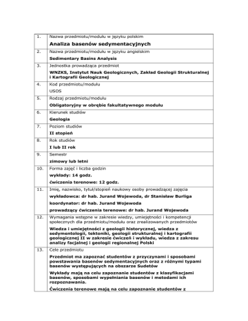 1. Nazwa przedmiotu/modułu w języku polskim Analiza basenów sedymentacyjnych 2. Nazwa przedmiotu/modułu w języku angielskim Sedimentary Basins Analysis 3. Jednostka prowadząca przedmiot WNZKS, Instytut Nauk Geologicznych, Zakład Geologii Strukturalnej i Kartografii Geologicznej 4. Kod przedmiotu/modułu USOS 5. Rodzaj przedmiotu/modułu Obligatoryjny w obrębie fakultatywnego modułu 6. Kierunek studiów Geologia 7. Poziom studiów II stopień 8. Rok studiów I lub II rok 9. Semestr zimowy lub letni 10. Forma zajęć i liczba godzin wykłady: 14 godz. ćwiczenia terenowe: 12 godz. 11. Imię, nazwisko, tytuł/stopień naukowy osoby prowadzącej zajęcia wykładowca: dr hab. Jurand Wojewoda, dr Stanisław Burliga koordynator: dr hab. Jurand Wojewoda prowadzący ćwiczenia terenowe: dr hab. Jurand Wojewoda 12. Wymagania wstępne w zakresie wiedzy, umiejętności i kompetencji społecznych dla przedmiotu/modułu oraz zrealizowanych przedmiotów Wiedza i umiejętności z geologii historycznej, wiedza z sedymentologii, tektoniki, geologii strukturalnej i kartografii geologicznej II w zakresie ćwiczeń i wykładu, wiedza z zakresu analizy facjalnej i geologii regionalnej Polski 13. Cele przedmiotu Przedmiot ma zapoznać studentów z przyczynami i sposobami powstawania basenów sedymentacyjnych oraz z różnymi typami basenów występujących na obszarze Sudetów Wykłady mają na celu zapoznanie studentów z klasyfikacjami basenów, sposobami wypełniania basenów i metodami ich rozpoznawania. Ćwiczenia terenowe mają na celu zapoznanie studentów z architekturą wybranych basenów sudeckich i z postwaryscyjską ewolucją strukturalną i paleogeograficzną Sudetów 14. Zakładane efekty kształcenia (W_1) Zna sposoby identyfikacji elementów składowych architektury basenowej. (W_2) Zna geotektoniczny i geodynamiczny kontekst powstawania basenów sedymentacyjnych. (W_3) Zna postwaryscyjską ewolucję strukturalną i paleogeograficzną obszaru Sudetów, zna najważniejsze elementy strukturalne Sudetów. (W_4) Zna główne tendencje geodynamiki i geokinematyki Sudetów, zna potencjalne przyczyny i miejsca geozagrożeń na obszarze Sudetów 15. Symbole kierunkowych efektów kształcenia K2_W01, K2_W04, K2_W07, K2_W09 K2_W01, K2_W04, K2_W07, K2_W09 K2_W01, K2_W04, K2_W07, K2_W09 K2_W01, K2_W04, K2_W07, K2_W09 Treści programowe 1) Definicje i klasyfikacja basenów sedymentacyjnych (historia badań basenowych, definicja basenu (ramy basenu, jednostka basenowa), geotektoniczna klasyfikacja basenów sedymentacyjnych, strukturalna klasyfikacja basenów sedymentacyjnych, środowiskowa klasyfikacja basenów sedymentacyjnych); 2) Modele ewolucyjne basenów (termiczna historia basenu, potencjał akumulacyjny basenu, akomodacja, cykliczność ewolucji basenu, subsydencja w basenie, baseny a regionalne jednostki strukturalne, inwersja basenowa (kinematyczna, stratygraficzna, środowiskowa); 3) Baseny ewaporatowe (geneza i ewolucja basenów ewaporatowych; cykl ewaporacyjny; środowiska sedymentacji ewaporatów; kopalne i współczesne baseny ewaporatowe; rola ewaporatów w kształtowaniu architektury basenów sedymentacyjnych; tektonika solna; ewaporaty a sedymentacja i tektonika basenu); 4) Baseny sudeckie – ujęcie ewolucyjne (baseny przedorogeniczne, baseny synorogeniczne (basen świebodzki, basen bardzki, basen kaczawski, basen wschodnio-sudecki), baseny postorogeniczne (basen śródsudecki, basen północnosudecki, basen Vrchlabi, basen Trutnova, basen Nachodu, basen Nysy Kłodzkiej, basen Mokrzeszowa, basen Kędzierzyna-Koźla, basen wrocławski), strefy ścinania i uskoki w Sudetach (uskoki Odry, południowosudecka strefa ścinania, uskoki Łaby, uskok śródsudecki, uskok sudecki brzeżny, uskok śnieżnicki brzeżny); 16. Zalecana literatura (podręczniki) Literatura podstawowa: Allen, P.A., Allen, J.R.L., 1990. Basin Analysis: Pronciples & Applications. Blackwell Science, Oxford, 451 pp. Kleinspehn, K.L. & Paola, C., 1988. New Perspectives in Basin Analysis. 453 pp, Springer-Verlag. Miall, D.M., 1990. Principles of Sedimentary Basin Analysis., Springer-Verlag. 668 pp. Reading, H.G., [Ed.] 1996. Sedimentary Environments: Processes, Facies and Stratigraphy., Blackwell Sciences, Oxford. 688 pp. Warren, J. 1999. Evaporites. Their evolution and economics. Blackwell Science Ltd. Oxford. 438 pp. Literatura uzupełniająca: Gradziński, R., Kostecka, A., Radomski, A., Unrug, R., 1986. Zarys sedymentologii. Wyd. Geol., Warszawawa. Allen, P.A., 1997. Earth Surface Processes., Blackwell Science, Oxford, 404 pp. Tucker, M.E., 2000. Sedimentary petrology: An introduction to the Origin of Sedimentary Rocks. Blackwell Science, 260 pp. Mann, P., Hempton, M.R., Bradley, D.C. & Burke, K., 1983. Development of pull-apart basins. Journal Geol. Chicago, 91: 529554. Nichols, G., 1999. Sedimentology & Stratigraphy. Blackwell Science, 356 pp. 17. Forma zaliczenia poszczególnych komponentów przedmiotu/modułu, sposób sprawdzenia osiągnięcia zamierzonych efektów kształcenia: Zaliczenie na podstawie pisemnego raportu z zajęć kameralnych i ćwiczeń terenowych Elementy i wagi mające wpływ na ocenę końcową: zaliczenie wykładów 50 %, ćwiczenia 50%. 18. Język wykładowy polski 19. Obciążenie pracą studenta: Forma aktywności studenta Godziny zajęć (wg planu studiów) z nauczycielem: Średnia liczba godzin na zrealizowanie aktywności 26 - wykład: 14 - ćwiczenia terenowe: 12 Praca własna studenta np.: 20 - przygotowanie do zajęć: - opracowanie wyników: 4 - czytanie wskazanej literatury: 6 - napisanie raportu z zajęć: 10 - przygotowanie do egzaminu: Suma godzin Liczba punktów ECTS 46 2 ECTS