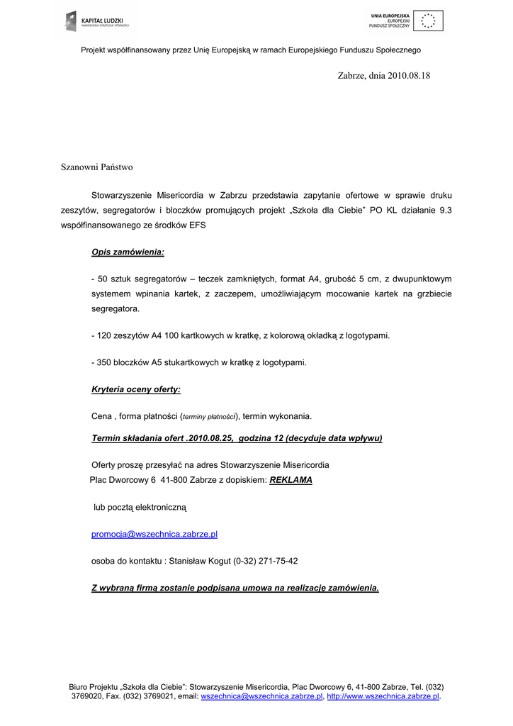 Projekt współfinansowany przez Unię Europejską w ramach Europejskiego Funduszu Społecznego Zabrze, dnia 2010.08.18 Szanowni Państwo Stowarzyszenie Misericordia w Zabrzu przedstawia zapytanie ofertowe w sprawie druku zeszytów, segregatorów i bloczków promujących projekt „Szkoła dla Ciebie” PO KL działanie 9.3 współfinansowanego ze środków EFS Opis zamówienia: - 50 sztuk segregatorów – teczek zamkniętych, format A4, grubość 5 cm, z dwupunktowym systemem wpinania kartek, z zaczepem, umoŜliwiającym mocowanie kartek na grzbiecie segregatora. - 120 zeszytów A4 100 kartkowych w kratkę, z kolorową okładką z logotypami. - 350 bloczków A5 stukartkowych w kratkę z logotypami. Kryteria oceny oferty: Cena , forma płatności (terminy płatności), termin wykonania. Termin składania ofert .2010.08.25, godzina 12 (decyduje data wpływu) Oferty proszę przesyłać na adres Stowarzyszenie Misericordia Plac Dworcowy 6 41-800 Zabrze z dopiskiem: REKLAMA lub pocztą elektroniczną [email protected] osoba do kontaktu : Stanisław Kogut (0-32) 271-75-42 Z wybraną firmą zostanie podpisana umowa na realizację zamówienia. Biuro Projektu „Szkoła dla Ciebie”: Stowarzyszenie Misericordia, Plac Dworcowy 6, 41-800 Zabrze, Tel. (032) 3769020, Fax. (032) 3769021, email: [email protected], http://www.wszechnica.zabrze.pl.
