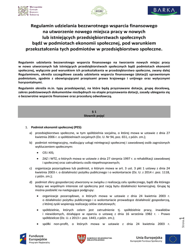 Regulamin udzielania bezzwrotnego wsparcia finansowego na utworzenie nowego miejsca pracy w nowych lub istniejących przedsiębiorstwach społecznych bądź w podmiotach ekonomii społecznej, pod warunkiem przekształcenia tych podmiotów w przedsiębiorstwo społeczne. Regulamin udzielania bezzwrotnego wsparcia finansowego na tworzenie nowych miejsc pracy w nowo utworzonych lub istniejących przedsiębiorstwach społecznych bądź podmiotach ekonomii społecznej, wyłącznie pod warunkiem ich przekształcenia w przedsiębiorstwo społeczne, zwany dalej Regulaminem, określa szczegółowe zasady udzielania wsparcia finansowego (dotacji) uprawnionym podmiotom, zgodnie z obowiązującymi przepisami prawa krajowego i unijnego oraz wytycznymi horyzontalnymi. Regulamin określa m.in. typy przedsięwzięć, na które będą przyznawane dotacje, grupę docelową, zakres podstawowych dokumentów niezbędnych na etapie przyznawania dotacji, zasady ubiegania się o bezzwrotne wsparcie finansowe oraz procedurę odwoławczą. §1 Słownik pojęć 1. Podmiot ekonomii społecznej (PES): a) przedsiębiorstwo społeczne, w tym spółdzielnia socjalna, o której mowa w ustawie z dnia 27 kwietnia 2006 r. o spółdzielniach socjalnych (Dz. U. Nr 94, poz. 651, z późn. zm.); b) podmiot reintegracyjny, realizujący usługi reintegracji społecznej i zawodowej osób zagrożonych wykluczeniem społecznym: CIS i KIS; ZAZ i WTZ, o których mowa w ustawie z dnia 27 sierpnia 1997 r. o rehabilitacji zawodowej i społecznej oraz zatrudnianiu osób niepełnosprawnych; c) organizacja pozarządowa lub podmiot, o którym mowa w art. 3 ust. 3 pkt 1 ustawy z dnia 24 kwietnia 2003 r. o działalności pożytku publicznego i o wolontariacie (Dz. U. z 2014 r. poz. 1118, z późn. zm.); organizacje pozarządowe, o których mowa w ustawie z dnia 24 kwietnia 2003 r. o działalności pożytku publicznego i o wolontariacie prowadzące działalność gospodarczą, z której zyski wspierają realizację celów statutowych; spółdzielnie, których celem jest zatrudnienie tj. spółdzielnie pracy, inwalidów i niewidomych, działające w oparciu o ustawę z dnia 16 września 1982 r. - Prawo spółdzielcze (Dz. U. z 2013 r. poz. 1443, z późn. zm.); spółki non-profit, o których mowa w ustawie z dnia 24 kwietnia 2003 r. Strona 1 d) podmiot sfery gospodarczej utworzony w związku z realizacją celu społecznego, bądź dla którego leżący we wspólnym interesie cel społeczny jest racją bytu działalności komercyjnej. Grupę tę można podzielić na następujące podgrupy: o działalności pożytku publicznego i o wolontariacie, o ile udział sektora publicznego w spółce wynosi nie więcej niż 50%. 2. Przedsiębiorstwo społeczne (PS): Podmiot, który spełnia łącznie poniższe warunki: a) jest podmiotem prowadzącym zarejestrowaną w Krajowym Rejestrze Sądowym działalność gospodarczą (wyodrębnioną pod względem organizacyjnym i rachunkowym), której celem jest: integracja społeczna i zawodowa określonych kategorii osób wyrażona poziomem zatrudnienia tych osób: zatrudnienie co najmniej 50% osób bezrobotnych, w rozumieniu art. 2 ust. 1 pkt 2 ustawy z dnia 20 kwietnia 2004 r. o promocji zatrudnienia i instrumentach rynku pracy lub osób, o których mowa w art. 1 ust. 2 ustawy z dnia 13 czerwca 2003 r. o zatrudnieniu socjalnym lub zatrudnienie co najmniej 30% osób o umiarkowanym lub znacznym stopniu niepełnosprawności; lub realizacja usług społecznych świadczonych w interesie ogólnym, usług opieki nad dzieckiem w wieku do lat 3 zgodnie z ustawą z dnia 4 lutego 2011 r. o opiece nad dziećmi w wieku do lat 3 (Dz. U. 2013 r. poz. 1457) lub usług wychowania przedszkolnego w przedszkolach lub w innych formach wychowania przedszkolnego zgodnie z ustawą z dnia 7 września 1991 r. o systemie oświaty, przy jednoczesnej realizacji celów prozatrudnieniowych: zatrudnienie co najmniej 20% osób, o których mowa powyżej. b) jest podmiotem, który nie dystrybuuje zysku lub nadwyżki bilansowej pomiędzy udziałowców, akcjonariuszy lub pracowników, ale przeznacza go na wzmocnienie potencjału przedsiębiorstwa jako kapitał niepodzielny oraz w określonej części na reintegrację zawodową i społeczną (w przypadku przedsiębiorstw o charakterze zatrudnieniowym) lub na działalność pożytku publicznego prowadzoną na rzecz społeczności lokalnej, w której działa przedsiębiorstwo; c) jest zarządzany na zasadach demokratycznych (w przypadku spółdzielni) albo co najmniej posiada ciało konsultacyjno-doradcze z udziałem pracowników lub innych interesariuszy, zaś wynagrodzenia kadry zarządzającej są ograniczone limitami. Definicja przedsiębiorstwa społecznego wskazana w niniejszym Regulaminie tożsama jest z definicją wskazaną w rozdziale 3 pkt. 20 Wytycznych w zakresie realizacji przedsięwzięć w obszarze włączenia społecznego i zwalczania ubóstwa z wykorzystaniem środków Europejskiego Funduszu Społecznego i Europejskiego Funduszu Rozwoju Regionalnego na lata 2014-2020. 3. Zakres podmiotowy wsparcia: Strona a) bezrobotnych, w rozumieniu art. 2 ust. 1 pkt 2 ustawy z dnia 20 kwietnia 2004 r. o promocji zatrudnienia i instytucjach rynku pracy, najbardziej oddalonych od rynku pracy, tj. takich, które oprócz bezrobocia doświadczają wykluczenia na podstawie innych przesłanek wykluczających i wpisujących się w definicję osób zagrożonych ubóstwem i wykluczeniem społecznym (zgodnie z rozdziałem III pkt 11 Wytycznych w zakresie realizacji przedsięwzięć w obszarze włączenia społecznego i zwalczania ubóstwa z wykorzystaniem środków Europejskiego Funduszu Społecznego i Europejskiego Funduszu Rozwoju Regionalnego na lata 2014-2020). 2 Bezzwrotne wsparcie finansowe (dotacje) na utworzenie nowych miejsc pracy w przedsiębiorstwie społecznym bądź podmiocie ekonomii społecznej, wyłącznie pod warunkiem przekształcenia tego podmiotu w przedsiębiorstwo społeczne, może zosta