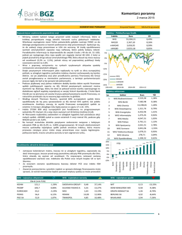Komentarz poranny 2 marca 2015 KOMENTARZ PORANNY • • • 5% 0% -5% -10% -15% WIG WIG20 -20% mWIG40 sWIG80 2014-06 -25% 2014-03 Sektor Kurs 1D 1 WIG Budownictowo 2,523,30 1,28% 2 WIG Banki 7,582,98 0,18% WIG Chemia 13,248,81 1,20% WIG Deweloperzy 1,321,76 0,79% WIG Energetyka 4,452,96 1,41% 6 WIG Informatyka 1,475,45 0,93% 7 WIG Media 4,047,31 1,03% 8 WIG Paliwa 3,761,11 1,13% 9 WIG Spożywczy 2,641,31 2,78% 10 WIG Surowce 3,841,06 -1,55% 11 WIG Telekomunikacja 1,070,21 0,93% 12 WIG Ukraina 278,71 3,04% 13 WIG Dywidendowy 1,200,32 Lp. 3 4 5 YTD 15% WIG - najwyższa aktywność WIG - największe wzrosty 5% 7% 4% 6% 4% Energetyka Media Informatyka Spożywczy • 5% 0% -5% -5% -1% Banki -10% Deweloperzy • Jutrzejsze kalendarium makro, inaczej niż w ubiegłym tygodniu, zapowiada się dość interesująco. Jeszcze przed sesją poznaliśmy odczyty PMI przemysłu dla Chin, które okazały się wyższe od oczekiwań. Po rozpoczęciu notowań zostaną opublikowane wartości ww. indeksów dla Polski oraz innych krajów UE w tym Niemiec. Za oceanem zostanie opublikowany bazowy delator PCE oraz indeks ISM przemysłu. Zawarcie porozumienia z greckim rządem w sprawie dalszego finansowania może sprawić, że wśród inwestorów będzie panował większy spokój co może prowadzić 14% 0,63% 16% 16% 18% 10% 11% Dywidendowy 10% • 2014-12 Indeksy sektorowe 20% Oczekiwania odnośnie dzisiejszej sesji 2014-09 Chemia • 1D 0,49% 0,26% 0,99% 0,85% Budownictowo • Kurs 53,304,21 2,367,10 3,656,95 13253,18 Telekomunikacja • Indeks WIG WIG20 mWIG40 sWIG80 Paliwa • Indeksy – Polska/Europa Środk. Miniony, ostatni tydzień lutego przyniósł wiele nowych informacji, które w krótkiej perspektywie mogą określić kierunek ruchu globalnych indeksów. Wtorkowe wystąpienie Janet Yellen potwierdziło gołębie nastroje FOMC co do dalszego postępowania w kwestii podnoszenia stóp procentowych. Spekuluje się, że do wakacji stopy procentowe w USA nie wzrosną. W środę opublikowano wartość amerykańskich zapasów ropy naftowej, które pobiły kolejny rekord. Paradoksalnie informacja ta doprowadziła do zwyżek Crude z 49 do ok. 51 USD, jednak już następnego dnia ropa spadki cen sięgnęły niemal 48 USD. Z kolei w piątek poznaliśmy drugi odczyt amerykańskiego PKB, który okazał się nieco wyższy od oczekiwań (2,2% vs. 2,1%), jednak niższy od poprzedniej publikacji kiedy szacowano wzrost na 2,6%. Wraz z poprawą sentymentu na rynkach ryzykownych aktywów spadały rentowności amerykańskich obligacji. Dzięki pozytywnym informacjom jakie napływały na rynki ze sfery europejskiej polityki, w ubiegłym tygodniu zachodnie indeksy również zachowywały się bardzo dobrze. Już po piątkowej sesji plan przedłużenia pomocy finansowej dla Grecji został przegłosowany w niemieckim parlamencie, a tamtejsi parlamentarzyści jeszcze nigdy nie byli w tej sprawie tak jednomyślni. Podczas piątkowej sesji paliwa indeksom dodały bardzo dobre wyniki finansowe spółek publikujących raporty na 4Q. Wśród pozytywnych zaskoczeń można wymienić np. Boeinga, który nie dość że pokazał wzrost wyniku operacyjnego to dodatkowo ogłosił wypłatę największej w swojej historii dywidendy. Z kolei Bank Irlandii po raz pierwszy od czasów kryzysu pokazał pozytywny wynik finansowy, co naturalnie przełożyło się na wycenę jego walorów na giełdzie. Według danych Thomson Reuters, spośród 60% europejskich spółek które opublikowały do tej pory sprawozdanie za 4Q niemal 55% spełnił, lub pobiło oczekiwania. Analitycy szacują, że wyniki finansowe europejskich spółek za ostatnie 3 miesiące ubiegłego roku będą wyższe w ujęciu r/r o ok. 15%. Indeks STOXX 600 akcji europejskich jest handlowany na prognozowanym wskaźniku PE równym 16 a więc dużo wyższym od 10-letniej średniej (11,8). W Warszawie najbardziej zadowoleni w ubiegłym tygodniu byli posiadacze akcji małych spółek. sWIG80 zyskał w czasie ostatnich 5 sesji niemal 3%, podczas gdy WIG20 wzrósł o ok. 0,4%. Na korzyść maluchów działało pozytywne zaskoczenie związane z kolejnym odczytem PKB za 4Q (3,2% vs. 3,00% prognozowane). W innych okolicznościach mocno zyskiwałby największe spółki jednak struktura indeksu, która mocno przeważa cierpiące przez niskie stopy procentowe oraz ryzyko legislacyjnopolityczne banki, mocno utrudnia wzrosty w tym segmencie rynku. Ukraina • Michał Krajczewski Surowce Najważniejsze wydarzenia poprzedniej sesji Krzysztof Kozieł, WIG - największe spadki Obrót (mln PLN) KGHM 121,1 -1,39% SADOVAYA GROUP S 0,48 37,14% MIT 0,13 -13,33% PKOBP 105,7 0,00% SILVANO FASHIO-A 5,55 13,27% DOM MAKLERSKI WD 0,58 -9,38% EUROCASH 63,2 -3,19% MOJ 1,63 13,19% GRUPA NOKAUT SA 1,26 -8,70% PGNIG 56,4 6,12% REMAK 14,00 12,90% BERLING SA 4,02 -8,64% PGE SA 52,9 1,07% TRANSPOL 4,85 10,48% MILKILAND 2,94 -7,26% 1 Komentarz poranny 2 marca 2015 NOTOWANIA Z DNIA Indeksy – Europa 27.02.2015 źródło: Bloomberg Indeksy – Świat Euro Stoxx 50 DAX FTSE 250 CAC40 RTS XU100 Europa Niemcy Wlk. Brytania Francja Rosja Turcja 3574,94 11327,19 17249,8 4910,62 911,98 85915,36 0,94% 1,04% 0,36% 0,58% 3,18% -0,94% S&P500 DJI NASDAQ Shanghai B-share Nikkei 225 Bovespa USA USA USA Chiny Japonia Brazylia -0,30% -0,45% -0,49% 0,78% 0,15% -0,10% 2,110,74 18,214,42 4,987,89 3,336,29 18,826,88 51,760,54 70% 40% 60% 50% 20% 40% 30% 0% 20% -20% -40% -60% 2014-03 10% 0% DAX XU100 2014-06 CAC40 RTS FTSE250 2014-09 -10% -20% 2014-03 2014-12 Surowce / Metale S&P500 DJIA Shanghai 2014-05 2014-07 Nikkei 2014-09 NASDAQ 2014-11 BOVESPA 2015-01 Surowce / Towary Ropa Crude $/bbl. Miedź $/t Złoto $/t oz. Srebro $/t oz. Aluminium $/t 62,58 5895,00 1213,18 16,60 1815,00 4,21% 0,12% 0,31% 0,19% 0,50% Kukurydza Future Pszenica Future Soja Future Cukier Future Kawa Future 388,50 500,50 1026,50 13,99 140,55 1,22% 2,50% 0,51% -1,57% -0,04% 30% 20% 20% 10% 0% 10% -10% 0% -20% -30% -10% -40% -50% -60% 2014-03 Ropa Future Złoto Future Al