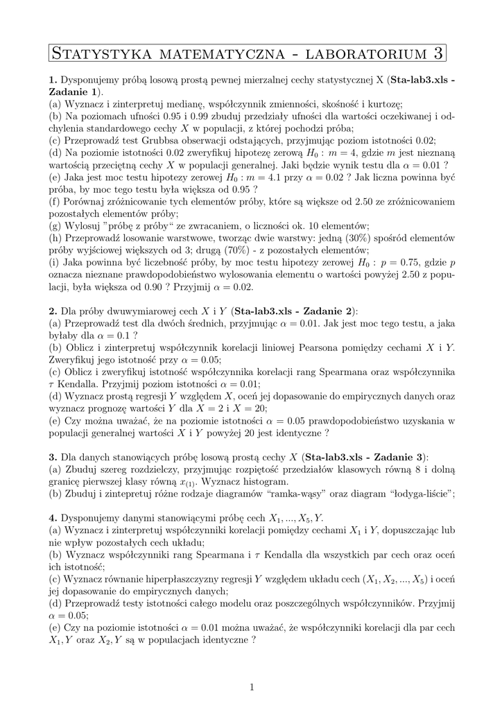 Statystyka matematyczna - laboratorium 3 1. Dysponujemy próbą losową prostą pewnej mierzalnej cechy statystycznej X (Sta-lab3.xls Zadanie 1). (a) Wyznacz i zinterpretuj medianę, współczynnik zmienności, skośność i kurtozę; (b) Na poziomach ufności 0.95 i 0.99 zbuduj przedziały ufności dla wartości oczekiwanej i odchylenia standardowego cechy X w populacji, z której pochodzi próba; (c) Przeprowadź test Grubbsa obserwacji odstających, przyjmując poziom istotności 0.02; (d) Na poziomie istotności 0.02 zweryfikuj hipotezę zerową H0 : m = 4, gdzie m jest nieznaną wartością przeciętną cechy X w populacji generalnej. Jaki będzie wynik testu dla α = 0.01 ? (e) Jaka jest moc testu hipotezy zerowej H0 : m = 4.1 przy α = 0.02 ? Jak liczna powinna być próba, by moc tego testu była większa od 0.95 ? (f) Porównaj zróżnicowanie tych elementów próby, które są większe od 2.50 ze zróżnicowaniem pozostałych elementów próby; (g) Wylosuj ”próbę z próby“ ze zwracaniem, o liczności ok. 10 elementów; (h) Przeprowadź losowanie warstwowe, tworząc dwie warstwy: jedną (30%) spośród elementów próby wyjściowej większych od 3; drugą (70%) - z pozostałych elementów; (i) Jaka powinna być liczebność próby, by moc testu hipotezy zerowej H0 : p = 0.75, gdzie p oznacza nieznane prawdopodobieństwo wylosowania elementu o wartości powyżej 2.50 z populacji, była większa od 0.90 ? Przyjmij α = 0.02. 2. Dla próby dwuwymiarowej cech X i Y (Sta-lab3.xls - Zadanie 2): (a) Przeprowadź test dla dwóch średnich, przyjmując α = 0.01. Jak jest moc tego testu, a jaka byłaby dla α = 0.1 ? (b) Oblicz i zinterpretuj współczynnik korelacji liniowej Pearsona pomiędzy cechami X i Y. Zweryfikuj jego istotność przy α = 0.05; (c) Oblicz i zweryfikuj istotność współczynnika korelacji rang Spearmana oraz współczynnika τ Kendalla. Przyjmij poziom istotności α = 0.01; (d) Wyznacz prostą regresji Y względem X, oceń jej dopasowanie do empirycznych danych oraz wyznacz prognozę wartości Y dla X = 2 i X = 20; (e) Czy można uważać, że na poziomie istotności α = 0.05 prawdopodobieństwo uzyskania w populacji generalnej wartości X i Y powyżej 20 jest identyczne ? 3. Dla danych stanowiących próbę losową prostą cechy X (Sta-lab3.xls - Zadanie 3): (a) Zbuduj szereg rozdzielczy, przyjmując rozpiętość przedziałów klasowych równą 8 i dolną granicę pierwszej klasy równą x(1) . Wyznacz histogram. (b) Zbuduj i zintepretuj różne rodzaje diagramów “ramka-wąsy” oraz diagram “łodyga-liście”; 4. Dysponujemy danymi stanowiącymi próbę cech X1 , ..., X5 , Y. (a) Wyznacz i zinterpretuj współczynniki korelacji pomiędzy cechami X1 i Y, dopuszczając lub nie wpływ pozostałych cech układu; (b) Wyznacz współczynniki rang Spearmana i τ Kendalla dla wszystkich par cech oraz oceń ich istotność; (c) Wyznacz równanie hiperpłaszczyzny regresji Y względem układu cech (X1 , X2 , ..., X5 ) i oceń jej dopasowanie do empirycznych danych; (d) Przeprowadź testy istotności całego modelu oraz poszczególnych współczynników. Przyjmij α = 0.05; (e) Czy na poziomie istotności α = 0.01 można uważać, że współczynniki korelacji dla par cech X1 , Y oraz X2 , Y są w populacjach identyczne ? 1