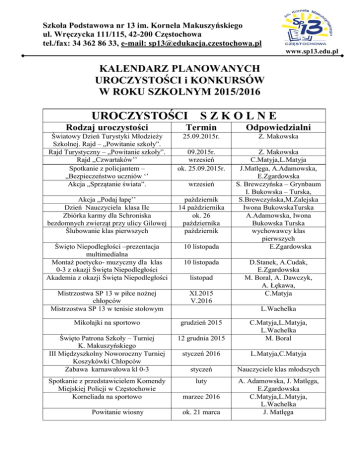 Szkoła Podstawowa nr 13 im. Kornela Makuszyńskiego ul. Wręczycka 111/115, 42-200 Częstochowa tel./fax: 34 362 86 33, e-mail: [email protected] www.sp13.edu.pl KALENDARZ PLANOWANYCH UROCZYSTOŚCI i KONKURSÓW W ROKU SZKOLNYM 2015/2016 UROCZYSTOŚCI S Z K O L N E Rodzaj uroczystości Termin Odpowiedzialni Światowy Dzień Turystyki Młodzieży Szkolnej. Rajd – „Powitanie szkoły”. Rajd Turystyczny – „Powitanie szkoły”. Rajd ,,Czwartaków’’ Spotkanie z policjantem – „Bezpieczeństwo uczniów ‘’ Akcja „Sprzątanie świata”. 25.09.2015r. Z. Makowska 09.2015r. wrzesień ok. 25.09.2015r. Akcja ,,Podaj łapę’’ Dzień Nauczyciela klasa IIc Zbiórka karmy dla Schroniska bezdomnych zwierząt przy ulicy Gilowej Ślubowanie klas pierwszych październik 14 października ok. 26 października październik Święto Niepodległości –prezentacja multimedialna Montaż poetycko- muzyczny dla klas 0-3 z okazji Święta Niepodległości Akademia z okazji Święta Niepodległości 10 listopada Z. Makowska C.Matyja,L.Matyja J.Matlęga, A.Adamowska, E.Zgardowska S. Brewczyńska – Grynbaum I. Bukowska – Turska, S.Brewczyńska,M.Zalejska Iwona BukowskaTurska A.Adamowska, Iwona Bukowska Turska wychowawcy klas pierwszych E.Zgardowska Mistrzostwa SP 13 w piłce nożnej chłopców Mistrzostwa SP 13 w tenisie stołowym XI.2015 V.2016 Mikołajki na sportowo grudzień 2015 Święto Patrona Szkoły – Turniej K. Makuszyńskiego III Międzyszkolny Noworoczny Turniej Koszykówki Chłopców Zabawa karnawałowa kl 0-3 12 grudnia 2015 C.Matyja,L.Matyja, L.Wachelka M. Boral styczeń 2016 L.Matyja,C.Matyja styczeń Nauczyciele klas młodszych Spotkanie z przedstawicielem Komendy Miejskiej Policji w Częstochowie Korneliada na sportowo luty A. Adamowska, J. Matlęga, E.Zgardowska C.Matyja,L.Matyja, L.Wachelka J. Matlęga Powitanie wiosny wrzesień 10 listopada listopad D.Stanek, A.Cudak, E.Zgardowska M. Boral, A. Dawczyk, A. Łękawa, C.Matyja L.Wachelka marzec 2016 ok. 21 marca Szkoła Podstawowa nr 13 im. Kornela Makuszyńskiego ul. Wręczycka 111/115, 42-200 Częstochowa tel./fax: 34 362 86 33, e-mail: [email protected] www.sp13.edu.pl Akcja humanitarna-,,Ziarenko dla Afryki’’ Zielony Tydzień 09.2015r kwiecień 2016 A.Adamowska, S.Brewczyńska S.Brewczyńska,M.Zalejska Dzień Ziemi 22 kwietnia A. Adamowska Pasowanie na czytelnika – przyjęcie uczniów klas II w poczet czytelników Mistrzostwa SP 13 w badmintonie kwiecień M. Krasoń, M. Boral kwiecień 2016 L.Matyja Akcja charytatywna na rzecz Centrum Dziecka Niepełnosprawnego w Częstochowie Dzień Polskiej Niezapominajki 10 maja J.Matlęga, E Zgardowska 13 maja B.Jezierska, D .Morawiec Prezentacja z okazji dnia 3 Maja maj E . Zgardowska Uroczystość z okazji Dnia Dziecka – kl. 0-3 Festiwal sTREET bALL z okazji Dnia Dziecka Zakończenie roku szkolnego i pożegnanie absolwentów 1 czerwca nauczyciele klas młodszych czerwiec 2016 C.Matyja,L.Matyja,L.Wachel ka kl. starsze: Z. Makowska, M. Kubicka, kl. mł.: wychowawcy klas trzecich 27 czerwca 2016 Szkoła Podstawowa nr 13 im. Kornela Makuszyńskiego ul. Wręczycka 111/115, 42-200 Częstochowa tel./fax: 34 362 86 33, e-mail: [email protected] www.sp13.edu.pl KONKURSY Szkolny Konkurs Literacki „Podróż moich marzeń” Konkurs plastyczny „Moje bezpieczeństwo w ruchu drogowym” II Szkolny konkurs czytelniczy dla klas trzecich„ Lektury nie muszą być nudne” Konkurs dla klas V „Umiem przeliczać jednostki” Szkolny Konkurs Wiedzy Historycznej „Drogi do niepodległości” Szkolny Konkurs Wiedzy „OMNIBUS” Konkurs grafiki komputerowej „Moje Boże Narodzenie” Konkursu grafiki komputerowej „Kartka Walentynkowa” Konkurs grafiki komputerowej pt. „Najładniejsza kartka wielkanocna” Szkolny Konkurs Piosenki Ekologicznej „ Bitwa na głosy” Szkolny Konkurs Ortograficzny dla klas młodszych „Święto Książki – W każdej szkole są książkowe mole” - Międzyklasowy konkurs czytelniczy dla klas V SZKOLNE wrzesień Z. Makowska październik E. Białas listopad M. Krasoń listopad nauczyciele matematyki listopad A.Lechowska-Łękawa M. Krasoń A. Adamowska, J. Matlęga nauczyciele informatyki ok.25 listopada grudzień luty marzec 20 kwietnia E. Białas, A. Szyda, A. Chyrzyńska nauczyciele informatyki 10 maja A. Adamowska, J. Matlęga A. Cudak, E. Zgardowska maj M. Krasoń, M. Boral Szkoła Podstawowa nr 13 im. Kornela Makuszyńskiego ul. Wręczycka 111/115, 42-200 Częstochowa tel./fax: 34 362 86 33, e-mail: [email protected] www.sp13.edu.pl KONKURSY Międzyszkolny Konkurs Plastyczny „ Bezpieczna droga do szkoły” Międzyszkolny Konkurs Plastyczny „ Moja ulubiona bajkowa postać” Międzyszkolny Konkurs Krasomówczy „ Moja ulubiona bajka” MIĘDZYSZKOLNE do 20 września E. Zgardowska, J.Matlega do 15 października A. Cudak, E.Zgardowska do 22 października D. Stanek, A. Cudak, E.Zgardowska II Miejski Konkurs Wiedzy "Jak dobrze znasz swoje miasto?" 22 październik XXI Konkurs Wiedzy Biblijnej 22 października - etap szkolny 19.11 - etap rejonowy 31.03 - finał diecezjalny 10 listopada S. Brewczyńska, A. Adamowska, P. Talar. M. Zielińska s. Agnieszka Skup Międzyszkolny Konkurs Literacki „Kiedy myślę, Ojczyzna…” Międzyszkolny Konkurs Wiedzy Historycznej „Drogi do niepodległości” Międzyszkolny Konkurs Plastyczno – Techniczny „ Maska Karnawałowa” Międzyszkolny Konkurs Plastyczny „Kartka Walentynkowa” Konkurs międzyszkolny ,,W poszukiwaniu wiosny’’ Międzyszkolny Konkurs Recytatorski „Dziecko w poezji” Międzyszkolny konkurs multimedialny pn. „Matematycy czasów starożytnych” Międzyszkolny Konkurs Plastyczny „ Wiosna nadchodzi” Międzyszkolny Konkurs Ekologiczno – Plastyczny „ Zrób coś z niczego” II Międzyszkolny Konkurs Recytatorski „Wiersze z humorem” II Międzyszkolny Konkurs Mitologiczny „Spotkanie na Olimpie” Międzyszkolny Konkurs Aktywności Sportowej „ Najmłodsi na s