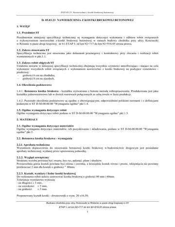 D.05.03.23 Nawierzchnie z kostki brukowej betonowej. D. 05.03.23 NAWIERZCHNIA Z KOSTKI BRUKOWEJ BETONOWEJ 1. WSTĘP 1.1. Przedmiot ST Przedmiotem niniejszej specyfikacji technicznej są wymagania dotyczące wykonania i odbioru robót związanych z wykonywaniem nawierzchni z kostki brukowej betonowej w ramach budowy chodnika przy ulicy Kościuszki w RóŜanie w pasie drogi krajowej nr 61-ETAP I: od km 92+717 do km 92+918.05 strona prawa. 1.2. Zakres stosowania ST Specyfikacja techniczna jest stosowana jako dokument przetargowy i kontraktowy przy zlecaniu i realizacji robót wymienionych w pkt.1.1. 1.3. Zakres robót objętych ST Ustalenia zawarte w niniejszej specyfikacji technicznej obejmują wszystkie czynności umoŜliwiające i mające na celu wykonanie wszystkich robót związanych z wykonaniem nawierzchni z kostki brukowej na podsypce cementowo piaskowej: – grubości 6 cm na chodniku, – grubości 8 cm na zjazdach, 1.4. Określenia podstawowe 1.4.1. Betonowa kostka brukowa - kształtka wytwarzana z betonu metodą wibroprasowania. Produkowana jest jako kształtka jednowarstwowa lub w dwóch warstwach połączonych ze sobą trwale w fazie produkcji. 1.4.2. Pozostałe określenia podstawowe są zgodne z obowiązującymi, odpowiednimi polskimi normami i z definicjami podanymi w ST D-M-00.00.00 "Wymagania ogólne" pkt 1.4. 1.5. Ogólne wymagania dotyczące robót Ogólne wymagania dotyczące robót podano w ST D-M-00.00.00 "Wymagania ogólne" pkt 1.5. 2. MATERIAŁY 2.1. Ogólne wymagania dotyczące materiałów Ogólne wymagania dotyczące materiałów, ich pozyskiwania i składowania, podano w ST D-M-00.00.00 "Wymagania ogólne" pkt 2. 2.2. Betonowa kostka brukowa - wymagania 2.2.l. Aprobata techniczna Warunkiem dopuszczenia do stosowania betonowej kostki brukowej w budownictwie drogowym jest posiadanie aprobaty technicznej, wydanej przez uprawnioną jednostkę. 2.2.2. Wygląd zewnętrzny Struktura wyrobu powinna być zwarta, bez rys, pęknięć, plam i ubytków. Powierzchnia górna kostek powinna być równa i szorstka, a krawędzie kostek równe i proste, wklęśnięcia nie powinny przekraczać 2 mm dla kostek o grubości ≤ 80mm. 2.2.3. Kształt, wymiary i kolor kostki brukowej Do wykonania robót naleŜy zastosować kostkę brukową o grubości 80 mm i 60mm. Tolerancje wymiarowe wynoszą: - na długości ± 3 mm , - na szerokości ± 3 mm, - na grubości ± 5 mm. Proponowany kształt kostki - dwuteownik o wym. 20 x16,50. Budowa chodnika przy ulicy Kościuszki w RóŜanie w pasie drogi krajowej nr 61 ETAP I: od km 92+717 do km 92+918.05 strona prawa 1 D.05.03.23 Nawierzchnie z kostki brukowej betonowej Kolor i kształt kostki powinien być zaakceptowany przez InŜyniera. 2.2.4. Wytrzymałość na ściskanie Wytrzymałość na ściskanie po 28 dniach (średnio z 6-ciu kostek) nie powinna być mniejsza niŜ 60 MPa. Dopuszczalna najniŜsza wytrzymałość pojedynczej kostki nie mniej niŜ 50 MPa (w ocenie statystycznej z co najmniej 10 kostek). 2.2.5. Nasiąkliwość Nasiąkliwość kostek betonowych powinna odpowiadać wymaganiom normy PN-B-06250[2] i wynosić nie więcej niŜ 5 %. 2.2.6. Odporność na działanie mrozu Odporność kostek betonowych na działanie mrozu powinna być badana zgodnie z wymaganiami PN-B-06250[2]. Odporność na działanie mrozu po 50 cyklach zamraŜania i odmraŜania próbek jest wystarczająca, jeŜeli: − próbka nie wykazuje pęknięć, − strata masy nie przekracza 5 % − obniŜenie wytrzymałości na ściskanie w stosunku do wytrzymałości próbek nie zamraŜanych nie jest większe niŜ 20%. 2.2.7. Ścieralność Ścieralność kostek betonowych określona na tarczy Boehmego wg PN-B-04111[1] powinna wynosić nie więcej niŜ 4 mm. 3. SPRZĘT 3.1. Ogólne wymagania dotyczące sprzętu Ogólne wymagania dotyczące sprzętu podano w ST D-M-00.00.00 "Wymagania ogólne" pkt 3. 3.2. Sprzęt do wykonania nawierzchni z kostki brukowej Proponuje się ręczne wykonanie nawierzchni z kostki brukowej z uwagi na zbyt małe powierzchnie. Do zagęszczenia nawierzchni stosuje się wibratory płytowe z osłoną z tworzywa sztucznego. Do wyrównywania podsypki moŜna stosować mechaniczne urządzenie na rolkach, prowadzone linami na szynie lub krawęŜnikach. 4. TRANSPORT 4.1. Ogólne wymagania dotyczące transportu Ogólne wymagania dotyczące transportu podano w ST D-M-00.00.00 "Wymagania ogólne" pkt 4. 4.2. Transport betonowych kostek brukowych Uformowane w czasie produkcji kostki betonowe układane są warstwowo na palecie. Po uzyskaniu wytrzymałości betonu min. 0,7 R, kostki przewoŜone są na stanowisko, gdzie specjalne urządzenie pakuje je w folię i spina taśmą stalową, co gwarantuje transport samochodami w nienaruszonym stanie. Kostki betonowe moŜna równieŜ przewozić samochodami na paletach transportowych producenta. 5. WYKONANIE ROBÓT 5.l. Ogólne zasady wykonania robót Ogólne zasady wykonania robót podano w ST D-00.00.00 "Wymagania ogólne" pkt 5. 5.2. PodłoŜe PodłoŜe gruntowe pod nawierzchnię powinno być przygotowane zgodnie z wymogami określonymi w ST D-04.01.01 "Koryto wraz z profilowaniem i zagęszczeniem podłoŜa". 5.3. Podbudowa Podbudowa pod nawierzchnię z kostki powinna być wykonana zgodnie z wymogami określonymi w ST D-04.05.01 „Podbudowa i ulepszone podłoŜe z gruntów lub kruszyw stabilizowanych cementem”. Budowa chodnika przy ulicy Kościuszki w RóŜanie w pasie drogi krajowej nr 61 ETAP I: od km 92+717 do km 92+918.05 strona prawa 2 D.05.03.23 Nawierzchnie z kostki brukowej betonowej. 5.4. Obramowanie nawierzchni Do obramowania nawierzchni z betonowych kostek brukowych na zjazdach zastosować krawęŜniki uliczne betonowe o wymiarach 15x30 wg BN 80/6775-03/04 [8] i ST D.08.01.01 „KrawęŜniki betonowe”. Do obramowania chodnika naleŜy zastosować obrzeŜa betonowe 8x 25 BN-80/6775-03/04 [8}. 5.5. Podsypka Nawierzchnię z betonowej kostki brukowej naleŜy układać na podsypce cementowo-piaskowej o stosu
