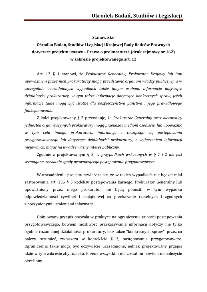 Ośrodek Badań, Studiów i Legislacji Stanowisko Ośrodka Badań, Studiów i Legislacji Krajowej Rady Radców Prawnych dotyczące projektu ustawy – Prawo o prokuraturze (druk sejmowy nr 162) w zakresie projektowanego art. 12 Art. 12 § 1 stanowi, że Prokurator Generalny, Prokurator Krajowy lub inni upoważnieni przez nich prokuratorzy mogą przedstawić organom władzy publicznej, a w szczególnie uzasadnionych wypadkach także innym osobom, informacje dotyczące działalności prokuratury, w tym także informacje dotyczące konkretnych spraw, jeżeli informacje takie mogą być istotne dla bezpieczeństwa państwa i jego prawidłowego funkcjonowania. Z kolei projektowany § 2 przewiduje, że Prokurator Generalny oraz kierownicy jednostek organizacyjnych prokuratury mogą przekazać mediom osobiście, lub upoważnić w tym celu innego prokuratora, informacje z toczącego się postępowania przygotowawczego lub dotyczące działalności prokuratury, z wyłączeniem informacji niejawnych, mając na uwadze ważny interes publiczny. Zgodnie z projektowanym § 3, w przypadkach wskazanych w § 1 i 2 nie jest wymagane uzyskanie zgody prowadzącego postępowanie przygotowawcze. W uzasadnieniu projektu stwierdza się, że w takich wypadkach nie będzie miał zastosowania art. 156 § 5 kodeksu postępowania karnego. Prokurator Generalny lub upoważniony przez niego prokurator nie będą ponosili w tym wypadku odpowiedzialności cywilnej i majątkowej za przekazanie rzetelnych i zgodnych z poczynionymi ustaleniami informacji. Opiniowany przepis pozwala w praktyce na ograniczenie tajności postępowania przygotowawczego, bowiem możliwość przekazywania informacji dotyczy nie tylko ogólnie rozumianej działalności prokuratury, lecz także "konkretnych spraw", przez co należy rozumieć, zwłaszcza w kontekście § 3, postępowania przygotowawcze. Ograniczenia takie mogą być oczywiście uzasadnione, jednak projektowany przepis idzie w tym zakresie zbyt daleko. Przede wszystkim nie został on bowiem nienależycie określony. Ośrodek Badań, Studiów i Legislacji Podstawą ujawnienia informacji na postawie § 1 jest istotność informacji dla bezpieczeństwa państwa i jego prawidłowego funkcjonowania. Pojęcie „bezpieczeństwa państwa” jest pojęciem nieokreślonym w prawie, którego granice wcale nie muszą być ukształtowane stanem, w którym byt państwa jest niezagrożony. Jeszcze trudniejsza jest próba zdefiniowania pojęcia "prawidłowego funkcjonowania państwa". Prawidłowe funkcjonowanie jest pojęciem wieloaspektowym. Zagrożenia dla niego mogą być różnie rozumiane, także dość szeroko. Zapewne intencją autora projektu było ograniczenie możliwości zastosowania przepisu do wypadków szczególnych, jednak obecne sformułowanie pozwala go stosować właściwie dowolnie, tym bardziej, że przepis nie wymaga ustalenia związku informacji z bezpieczeństwem lub prawidłowym funkcjonowaniem państwa, ale potencjalnej możliwości zaistnienia takiego związku. Wydaje się, że takie ustalanie przesłanek udzielania informacji grozi zbytnią dowolnością w udzielaniu informacji. O ile rozsądnie uregulowane upoważnienie do udzielania informacji organom władzy publicznej jest uzasadnione, o tyle udzielanie jej innym osobom może budzić wątpliwości. Nawet jednak jeżeli przyjąć stosunkowo ryzykowane założenie, że w szczególnie uzasadnionych wypadkach rzeczywiście uzasadnione jest przekazywanie ich innym osobom, o tyle wydaje się, że ogólne podstawy udzielania informacji winny być w miarę możliwości precyzyjne, czego nie zapewnia projekt. Co więcej, zgodnie z § 3 nie jest wymagana zgoda prowadzącego postępowanie przygotowawcze. Warto zwrócić uwagę, że w tym ostatnim przepisie winna być mowa raczej o prowadzącym lub nadzorującym postępowanie przygotowawcze. Nie to jest jednak najistotniejsze. Projektowany przepis nie mówi bowiem o tym, czy wymagane jest choćby poinformowanie go o przekazaniu informacji. O ile to, czy powinna być potrzebna zgoda może być dyskutowane, o tyle wydaje się, że poinformowanie prowadzącego lub nadzorującego o udzieleniu informacji jest koniecznością. Projektowany art. 12 § 2 upoważnia do udzielenia informacji z toczącego się postępowania przygotowawczego lub dotyczących działalności prokuratury, z wyłączeniem informacji niejawnych, mediom. Samo pojęcie "mediów" wydaje się niezręczne, jednak da się określić zakres tego pojęcia. W drodze zabiegów wykładniczych da się uzasadnić, iż "media" mogą te wiadomości opublikować, chociaż lepiej byłoby, gdyby wynikało to wprost z przepisu. Jednak możliwość przekazywania mediom tego rodzaju informacji wydaje się być sama w sobie dyskusyjna, tym bardziej, Ośrodek Badań, Studiów i Legislacji że kryterium jest ocenne, gdyż stanowi je "ważny interes publiczny". Także i tu znajduje zastosowanie art. 12 § 3 k.k. W w/w przypadkach mamy do czynienia z przepisami zbyt ogólnikowymi, niejasnymi, operującymi nieostrymi pojęciami. Tak skonstruowany przepis nie może stanowić podstawy do ingerencji w sferę konstytucyjnie zagwarantowanej sfery praw i wolności obywatelskich, gdyż działania oparte na nim będą cechowały się dowolnością ze strony uprawnionego. Daje on także możliwość bezkarnego naruszenia dobrego imienia dowolnie wskazanego człowieka. Biorąc powyższe pod uwagę oraz mając na względzie cel i znaczenie postępowań przygotowawczych postuluje się wykreślenie art. 12 z przedmiotowego projektu, ewentualnie jego gruntowne przeredagowanie z uwzględnieniem powyższych uwag.