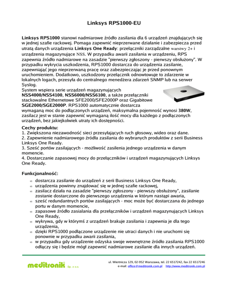 Linksys RPS1000-EU Linksys RPS1000 stanowi nadmiarowe źródło zasilania dla 6 urządzeń znajdujących się w jednej szafie rackowej. Pomaga zapewnić nieprzerwane działanie i zabezpiecza przed utratą danych urządzenia Linksys One Ready: przełączniki zarządzalne warstwy 2+ i urządzenia magazynujące NSS. W przypadku awarii zasilania w urządzeniu, RPS zapewnia źródło nadmiarowe na zasadzie "pierwszy zgłoszony - pierwszy obsłużony". W przypadku wykrycia uszkodzenia, RPS1000 dostarcza do urządzenia zasilanie, zapewniająć jego nieprzerwaną pracę oraz zabezpieczając je przed ponownym uruchomieniem. Dodatkowo, uszkodzony przełącznik odnowtowuje to zdarzenie w lokalnych logach, przesyła do centralnego menedżera zdarzeń SNMP lub na serwer Syslog. System wspiera serie urządzeń magazynujących NSS4000/NSS4100, NSS6000/NSS6100, a także przełączniki stackowalne Ethernetowe SFE2000/SFE2000P oraz Gigabitowe SGE2000/SGE2000P. RPS1000 automatycznie dostarcza wymaganą moc do podłączonych urządzeń, maksymalna pojemność wynosi 380W, zasilacz jest w stanie zapewnić wymaganą ilość mocy dla każdego z podłączonych urządzeń, bez jakiejkolwiek utraty ich dostępności. Cechy produktu: 1. Zwiększona niezawodność sieci przesyłających ruch głosowy, wideo oraz dane. 2. Zapewnienie nadmiarowego źródła zasilania do wybranych produktów z serii Business Linksys One Ready. 3. Sześć portów zasilających - możliwość zasilenia jednego urządzenia w danym momencie. 4. Dostarczanie zapasowej mocy do przełączników i urządzeń magazynujących Linksys One Ready. Funkcjonalność: • • • • • • • • dostarcza zasilanie do urządzeń z serii Business Linksys One Ready, urządzenia powinny znajdować się w jednej szafie rackowej, zasilacz działa na zasadzie "pierwszy zgłoszony - pierwszy obsłużony", zasilanie zostanie dostarczone do pierwszego urządzenia w którym nastąpi awaria, sześć redundantnych portów zasilających - moc może być dostarczana do jednego portu w danym momencie, zapasowe źródło zasialania dla przełączników i urządzeń magazynujących Linksys One Ready, wykrywa, gdy w którymś z urządzeń brakuje zasilania i zapewnia je dla tego urządzenia, dzięki RPS1000 podłączone urządzenie nie utraci danych i nie uruchomi się ponownie w przypadku awarii zasilania, w przypadku gdy urządzenie odzyska swoje wewnętrzne źródło zasilania RPS1000 odłączy się i będzie mógł zapewnić nadmiarowe zasilanie dla innych urządzeń. ul. Wiertnicza 129, 02-952 Warszawa, tel. 22 6517242, fax 22 6517246 e-mail: [email protected] http://www.meditronik.com.pl Specyfikacja: • diody: STBY/ACTIVE, DC, TEMP, FAN, CH1, CH2, CH3, CH4, CH5, CH6, maksymalna moc wyjściowa: 380W, napięcie wejściowe AC: 100 do 240V, 6 do 10A, 50 do 60Hz, certyfikaty: FCC, CE, RoHS, WEEE, C-Tick, temperatura pracy: 0-45oC, temperatura przechowywania: -4-149oC, wilgotnośc przy pracy: 10-85% bez kondensacji, wilgotnośc przechowywania: 5-90% bez kondensacji, normy bezpieczeństwa: UL 60950-1,IEC 60950-1 CB/PSB,CSA-C22.2 No. 60950, EN 60950, EMC: FCC Part 15 (CFR 47) Class A, ICES-003 Class 3, EN 55022 Class A, CISPR22 Class A, EN 55024, EN 61000-3-2, EN 61000-3-3, wymiary: 378 x 45 x 445mm, • waga: 5.2 kg • • • • • • • • • • • Zawartość opakowania: zasilacz RPS1000, przewody RPS1000 (1.2 m, kabel połączeniowy 16-pin do 14-pin), dokumentacja na CD-ROM, kabel zasilania AC, przewodnik szybkiej instalacji, zestaw montażowy. ul. Wiertnicza 129, 02-952 Warszawa, tel. 22 6517242, fax 22 6517246 e-mail: [email protected] http://www.meditronik.com.pl