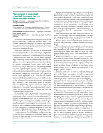 Polski Przegląd Neurologiczny, 2008, tom 4, supl. A Postępowanie w specjalnych sytuacjach życiowych chorych na stwardnienie rozsiane Multiple sclerosis — resolving in special situations during the course of the disease Zdzisław Maciejek Klinika Neurologii 10. Wojskowego Szpitala Klinicznego z Polikliniką — Samodzielny Publiczny Zakład Opieki Zdrowotnej w Bydgoszczy Słowa kluczowe: stwardnienie rozsiane — diagnostyka, jakość życia, trudne sytuacje życiowe Key words: multiple sclerosis — diagnostics, quality of life, difficult situations Stwardnienie rozsiane jest chorobą przewlekłą zapalno-zwyrodnieniową o zmiennym przebiegu. Żaden z dotychczas poznanych wskaźników aktywności procesu chorobowego (biochemicznych, immunologicznych, obrazowania rezonansem magnetycznym) nie pozwala na przewidywanie przebiegu choroby. Stwardnienie rozsiane jest chorobą „z tysiącem twarzy”. Podstawową sprawą jest postawienie rozpoznania oraz poinformowanie o tym chorego i rodziny. Przekazanie pierwszej informacji o chorobie odgrywa ważną rolę, a sposób informacji może być szokiem dla chorego i rodziny. Konieczna jest zatem znajomość kryteriów Mc Donalda i wsp. w dokonaniu rozpoznania. Należy wyjaśnić choremu, z jakiego rodzaju procesem chorobowym mamy do czynienia. Nastawienie chorego jest tak ważne, jak leczenie — nie można mu pomóc bez jego pozytywnego nastawienia. Brak akceptacji choroby czyni niezdolnym do walki z nią. Zatem najistotniejsze to zapoznanie chorego z właściwym sposobem leczenia, zaufanie do sposobu leczenia, siła woli chorego oraz świadomość czasu trwania leczenia. Należy podkreślić, że u 4–30% chorych choroba ma przebieg łagodny. Następstwem odroczenia powiedzenia prawdy może być reakcja depresyjna chorego, trudności we wspólnym planowaniu przyszłości, kontynuacji pracy zawodowej jako odwrócenia uwagi od choroby. Należy uwzględnić fakt, że przewlekle chorzy często wiążą pogorszenie stanu zdrowia z wpływem czynników zewnętrznych, a szczególnie stresem psychicznym. Dlatego zaleca się multidyscyplinarną opiekę nad chorym, uwzględniającą psychoterapię. W sytuacji prawidłowego ustalenia rozpoznania przez lekarza neurologa (nie radiologa, jak się często dzieje) powinno zostać zadane pytanie — w czym mogę pomóc? Dla chorego i rodziny najważniejsze jest, by wiedzieć, co czynić dalej, jak leczyć, mieć możliwość kontaktu z innymi chorymi poprzez Towarzystwo Stwardnienia Rozsianego. Lekarz musi sobie zdawać sprawę z tego, że od tej chwili będzie testowany (egzaminowany) przez chorego ze swej wiedzy na temat stwardnienia rozsianego. Możliwości stwarza także Internet. Niejednokrotnie chorzy dysponują wieloma informacjami, które wymagają wyjaśnienia przez lekarza. Zazwyczaj dobre rokowanie wiąże się z płcią żeńską, wczesnym początkiem choroby, zapaleniem nerwu wzrokowego lub objawami czuciowymi oraz rzutowo-zwalniającym przebiegiem choroby. 74 Kolejnym zagadnieniem, szczególnie ważnym dla osób młodych, jest kwestia ciąży. Z dotychczasowych danych klinicznych wynika, że ciąża, poród i okres połogu nie wpływają na długoletnie rokowanie u kobiet chorych na stwardnienie rozsiane. Macierzyństwo wiąże się natomiast z częstym porodem drogą cięcia cesarskiego i niską masą urodzeniową dziecka. Nie znaleziono czynników odpowiedzialnych za ten stan rzeczy, chociaż zwykle cięcie cesarskie wykonuje się przed planowanym terminem porodu (wcześniejsze doniesienie o konieczności pomocy w czasie porodu u chorych z rozpoznanym stwardnieniem rozsianym). Obecnie stosowane leki immunomodulacyjne nie powinny być stosowane przed planowaniem ciąży, w jej trakcie oraz podczas karmienia piersią. Podobne uwagi dotyczą dużych dawek metyloprednizolonu. Kolejne sprawy związane z przebiegiem choroby to sposób życia, odżywiania się, szczepień ochronnych i rehabilitacji. W dotychczasowych obserwacjach potwierdzono, że wysoka temperatura pogarsza samopoczucie i wydolność fizyczną chorych, tym niemniej samo światło słoneczne i przebywanie na słońcu są dla nich korzystne. Nie znaleziono związku między przebywaniem na słońcu a wystąpieniem rzutu choroby. Podobnie przedstawia się sprawa sposobu odżywiania. Przyjmuje się, że korzystna jest dieta ograniczająca ilość spożywanych tłuszczów. Szczególne znaczenie przypisuje się kwasowi linolenowemu oraz witaminie D, której stosowanie wiąże się z mniejszą zapadalnością na stwardnienie rozsiane. Należy podkreślić, że nie istnieje żadna specjalna dieta lecznicza, która mogłaby wpłynąć na naturalny przebieg choroby. Nadal dyskusyjny pozostaje problem szczepień ochronnych przeciw wirusowemu zapaleniu wątroby typu B oraz grypie, szczególnie u chorych z aktywnym przebiegiem choroby. Dotyczy to nie tylko samego zaostrzenia procesu chorobowego, ale też zwiększenia ryzyka zachowania na stwardnienie rozsiane. Aktualnie przyjmuje się, że szczepienia ochronne przeciw gruźlicy, różyczce i tężcowi mogą być stosowane, chociaż decyzję powinno się podejmować indywidualnie, z uwzględnieniem przebiegu choroby i osobniczej wrażliwości chorego. Nieodłącznym elementem kompleksowego leczenia stwardnienia rozsianego jest również rehabilitacja, uznawana za najlepszy i najbardziej efektywny sposób postępowania objawowego u chorych na stwardnienie rozsiane. Regularny, umiarkowany wysiłek fizyczny pozwala dłużej zachować samodzielność, poprawia jakość życia chorego, pozwala kontrolować masę ciała, poprawia sprawność mięśni i stawów. Ponadto pozwala uwierzyć w siebie, we własne możliwości fizyczne i duchowe, działa protekcyjnie na takie czynniki ryzyka, jak choroba niedokrwienna serca, nadciśnienie, cukrzyca oraz funkcje poznawcze chorego. Zalecane są ćwiczenia wytrzymałościowe 2–3 razy tygodniowo po 20–30 minut z umiarkowanym natężeniem. Jeśli chodzi o ćwi