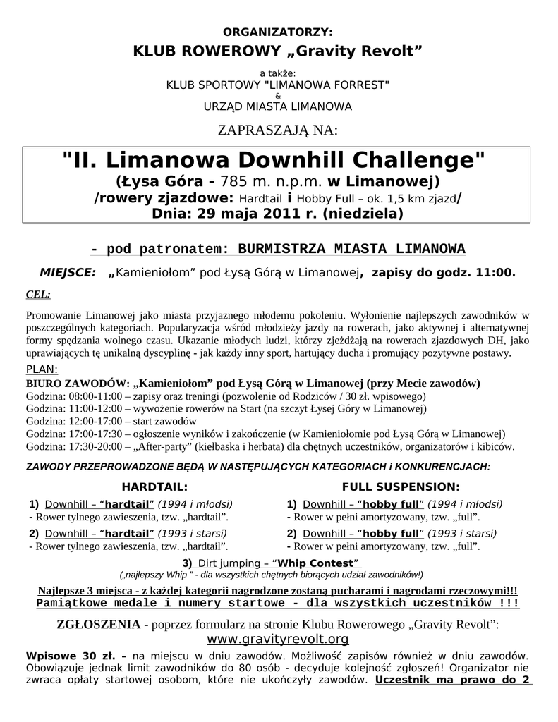 ORGANIZATORZY: KLUB ROWEROWY „Gravity Revolt” a także: KLUB SPORTOWY "LIMANOWA FORREST" & URZĄD MIASTA LIMANOWA ZAPRASZAJĄ NA: "II. Limanowa Downhill Challenge" (Łysa Góra - 785 m. n.p.m. w Limanowej) /rowery zjazdowe: Hardtail i Hobby Full – ok. 1,5 km zjazd/ Dnia: 29 maja 2011 r. (niedziela) - pod patronatem: BURMISTRZA MIASTA LIMANOWA MIEJSCE: „Kamieniołom” pod Łysą Górą w Limanowej, zapisy do godz. 11:00. CEL: Promowanie Limanowej jako miasta przyjaznego młodemu pokoleniu. Wyłonienie najlepszych zawodników w poszczególnych kategoriach. Popularyzacja wśród młodzieży jazdy na rowerach, jako aktywnej i alternatywnej formy spędzania wolnego czasu. Ukazanie młodych ludzi, którzy zjeżdżają na rowerach zjazdowych DH, jako uprawiających tę unikalną dyscyplinę - jak każdy inny sport, hartujący ducha i promujący pozytywne postawy. PLAN: BIURO ZAWODÓW: „Kamieniołom” pod Łysą Górą w Limanowej (przy Mecie zawodów) Godzina: 08:00-11:00 – zapisy oraz treningi (pozwolenie od Rodziców / 30 zł. wpisowego) Godzina: 11:00-12:00 – wywożenie rowerów na Start (na szczyt Łysej Góry w Limanowej) Godzina: 12:00-17:00 – start zawodów Godzina: 17:00-17:30 – ogłoszenie wyników i zakończenie (w Kamieniołomie pod Łysą Górą w Limanowej) Godzina: 17:30-20:00 – „After-party” (kiełbaska i herbata) dla chętnych uczestników, organizatorów i kibiców. ZAWODY PRZEPROWADZONE BĘDĄ W NASTĘPUJĄCYCH KATEGORIACH i KONKURENCJACH: HARDTAIL: FULL SUSPENSION: 1) Downhill – “hardtail” (1994 i młodsi) - Rower tylnego zawieszenia, tzw. „hardtail”. 1) Downhill – “hobby full” (1994 i młodsi) - Rower w pełni amortyzowany, tzw. „full”. 2) Downhill – “hardtail” (1993 i starsi) - Rower tylnego zawieszenia, tzw. „hardtail”. 2) Downhill – “hobby full” (1993 i starsi) - Rower w pełni amortyzowany, tzw. „full”. 3) Dirt jumping – “Whip Contest” („najlepszy Whip ” - dla wszystkich chętnych biorących udział zawodników!) Najlepsze 3 miejsca - z każdej kategorii nagrodzone zostaną pucharami i nagrodami rzeczowymi!!! Pamiątkowe medale i numery startowe - dla wszystkich uczestników !!! ZGŁOSZENIA - poprzez formularz na stronie Klubu Rowerowego „Gravity Revolt”: www.gravityrevolt.org Wpisowe 30 zł. – na miejscu w dniu zawodów. Możliwość zapisów również w dniu zawodów. Obowiązuje jednak limit zawodników do 80 osób - decyduje kolejność zgłoszeń! Organizator nie zwraca opłaty startowej osobom, które nie ukończyły zawodów. Uczestnik ma prawo do 2 wyjazdów na szczyt Łysej Góry wraz z rowerem podczas zawodów. Impreza ma charakter otwarty - zarówno dla zawodników z licencją „PZKol” jak i amatorów. Prawo uczestnictwa - w zawodach mają osoby pełnoletnie oraz poniżej 18 lat, jeśli przedstawią pisemną zgodę rodziców, będą posiadać swój sprzęt, umiejętności i przede wszystkim: OBOWIĄZKOWO! - sprawny rower, kask pełny – integralny, ochraniacze zabezpieczające (nakolanniki, ochraniacze na łokcie, ochraniacz kręgosłupa-żółw) oraz rękawiczki. Wypełniając kartę zgłoszeniową – uczestnik akceptuje poniższą klauzulę: Organizator, wszystkie osoby z nim współpracujące, a także osoby związane z przeprowadzeniem i organizacją zawodów, nie ponoszą odpowiedzialności względem uczestników za szkody osobowe, rzeczowe i majątkowe, które wystąpią przed, w trakcie lub po zawodach. Uczestnicy startują na własną odpowiedzialność. Uczestnicy ponoszą odpowiedzialność cywilną i prawną za wszystkie szkody. Przez akceptację niniejszej deklaracji uczestnicy zrzekają się prawa dochodzenia prawnego lub zdrowotnego od organizatora lub jego zleceniodawców w razie wypadku lub szkody związanej z zawodami. Organizator - dołoży wszelkich starań: w celu zapewnienia bezpieczeństwa na zawodach (jak pomoc medyczna, służby porządkowe, zabezpieczenie trasy przejazdu, wolontariusze, itp.). Przyjmuję do wiadomości, że w razie wypadku nie mogę wnosić żadnych roszczeń w stosunku do organizatora. Przyjmuję do wiadomości, że należy przestrzegać zarządzeń służb porządkowych, sędziów oraz warunków Regulaminu. Zgadzam się z warunkami uczestnictwa w w/w zawodach. Mój stan zdrowia pozwala na uczestnictwo w zawodach „II. Limanowa Downhill Challenge” (29 maja 2011), bez ryzyka utraty zdrowia bądź życia. Zapoznałem się z formułą zawodów i z przeszkodami na trasie. Jestem świadomy zagrożeń wynikających z uczestnictwa w zawodach. Posiadam ważne ubezpieczenie w zakresie następstw nieszczęśliwych wypadków, kosztów leczenia oraz kontuzji sportowych. Nie jestem i nie będę podczas zawodów pod wpływem alkoholu, środków psychoaktywnych, bądź innych substancji wywierających niekorzystny wpływ na zdolność oceny sytuacji i ryzyka związanego w uczestnictwu w zawodach. W przypadku startu młodzieży poniżej 18 lat, wymagana jest zgoda rodzica lub opiekuna prawnego, poprzez złożenie podpisu (pismo to dostępne jest na stronie: www.gravityrevolt.org i www.forrest.limanowa.pl). Zdjęcia, nagrania filmowe oraz wywiady, a także wyniki z moimi danymi osobowymi mogą być wykorzystane przez prasę, radio i telewizję. Swoim podpisem zapewniam, że zapoznałem się z wszystkimi warunkami Regulaminu zawodów i wypełniłem formularz zgłoszeniowy zgodnie z prawdą oraz kompletnie. Wyrażam zgodę na przetwarzanie moich danych osobowych (Dz.U.Nr 133, poz.883). Zasady rozgrywania: Czas mierzony jest w dwóch przejazdach, do klasyfikacji liczy się lepszy czas przejazdu. Zawodnicy startują w odstępach jedno-minutowych. W przypadku dużej ilości uczestników odstęp może ulec skróceniu. Niestawienie się na start grozi dyskwalifikacją. Zawodnicy startują z numerami dostarczonymi przez organizatora, umieszczonymi na kierownicy z przodu roweru. W sprawach nieuregulowanych niniejszym Regulaminem decydują organizatorzy. N