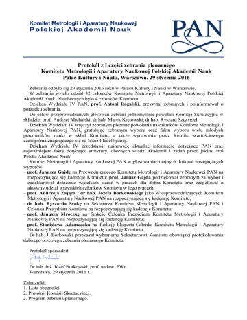 Komitet Metrologii i Aparatury Naukowej Polskiej Akademii Nauk Protokół z I części zebrania plenarnego Komitetu Metrologii i Aparatury Naukowej Polskiej Akademii Nauk Pałac Kultury i Nauki, Warszawa, 29 stycznia 2016 Zebranie odbyło się 29 stycznia 2016 roku w Pałacu Kultury i Nauki w Warszawie. W zebraniu wzięło udział 32 członków Komitetu Metrologii i Aparatury Naukowej Polskiej Akademii Nauk. Nieobecnych było 4 członków Komitetu. Dziekan Wydziału IV PAN, prof. Antoni Rogalski, przywitał zebranych i poinformował o porządku zebrania. Do celów przeprowadzanych głosowań zebrani jednomyślnie powołali Komisję Skrutacyjną w składzie: prof. Andrzej Michalski, dr hab. Marek Krętowski, dr hab. Ryszard Szczygieł. Dziekan Wydziału IV wręczył zebranym pisemne powołania na członków Komitetu Metrologii i Aparatury Naukowej PAN, gratulując zebranym wyboru oraz faktu wyboru wielu młodych pracowników nauki w skład Komitetu, a także wydawania przez Komitet wartościowego czasopisma znajdującego się na liście filadelfijskiej. Dziekan Wydziału IV przedstawił najnowsze aktualne informacje dotyczące PAN oraz najważniejsze fakty dotyczące struktury, obecnych władz Akademii i zadań przed jakimi stoi Polska Akademia Nauk. Komitet Metrologii i Aparatury Naukowej PAN w głosowaniach tajnych dokonał następujących wyborów: – prof. Janusza Gajdę na Przewodniczącego Komitetu Metrologii i Aparatury Naukowej PAN na rozpoczynającą się kadencję Komitetu; prof. Janusz Gajda podziękował zebranym za wybór i zadeklarował dołożenie wszelkich starań w pracach dla dobra Komitetu oraz zaapelował o aktywny udział wszystkich członków Komitetu w jego pracach; – prof. Andrzeja Zająca i dr hab. Józefa Borkowskiego jako Wiceprzewodniczących Komitetu Metrologii i Aparatury Naukowej PAN na rozpoczynającą się kadencję Komitetu; – dr hab. Ryszarda Srokę na Sekretarza Komitetu Metrologii i Aparatury Naukowej PAN i Członka Prezydium Komitetu na rozpoczynającą się kadencję Komitetu; – prof. Janusza Mroczkę na funkcję Członka Prezydium Komitetu Metrologii i Aparatury Naukowej PAN na rozpoczynającą się kadencję Komitetu; – prof. Stanisława Adamczaka na funkcję Eksperta-Członka Komitetu Metrologii i Aparatury Naukowej PAN na rozpoczynającą się kadencję Komitetu. Dr hab. J. Borkowski przekazał wybranemu Sekretarzowi Komitetu obowiązki protokołowania dalszego przebiegu zebrania plenarnego Komitetu. Protokół sporządził Dr hab. inż. Józef Borkowski, prof. nadzw. PWr. Warszawa, 29 stycznia 2016 r. Załączniki: 1. Lista obecności. 2. Protokół Komisji Skrutacyjnej. 3. Program zebrania plenarnego. Komitet Metrologii i Aparatury Naukowej Polskiej Akademii Nauk Protokół z II części zebrania plenarnego Komitetu Metrologii i Aparatury Naukowej Polskiej Akademii Nauk Pałac Kultury i Nauki, Warszawa, 29 stycznia 2016 Po zakończeniu wyborów obowiązki protokołowania przejął nowy sekretarz Komitetu dr hab. inż. Ryszard Sroka. Prof. Antoni Rogalski podziękował za sprawnie przeprowadzone wybory i przedstawił możliwości związane ze strukturą Komitetów PAN (komisje, sekcje) i zasady ich działania. Prof. Janusz Gajda przedstawił propozycję, aby na razie nie powoływać stałych sekcji i komisji, a działać poprzez powoływane doraźnie Zespoły do konkretnych, pojawiających się zadań, np. ekspertyz. Prof. Janusz Mroczka i prof. Antoni Rogalski poparli zamierzenia nowego przewodniczącego Komitetu Metrologii i Aparatury Naukowej PAN prof. Janusza Gajdy. Dziekan Wydziału IV PAN prof. Antoni Rogalski podziękował zebranym członkom Komitetu MiAN i opuścił zebranie. Prof. Janusz Gajda przypomniał o zbliżającym się terminie nadsyłania prac na VII Kongres Metrologii organizowany przez Politechnikę Lubelską (pod patronatem Komitetu Metrologii i Aparatury Naukowej) i zachęcał do rozpowszechniania informacji o Kongresie oraz do zgłaszania prac przez członków Komitetu i ich współpracowników. Zaproponował aby członkowie Komitetu MiAN PAN wyrazili zgodę na pracę w Komitecie Naukowym Kongresu. Zaapelował o obecność wszystkich członków Komitetu MiAN na Kongresie i wyznaczył kolejny termin Zebrania Plenarnego w czasie trwania Kongresu Metrologii w Lublinie-Nałęczowie. Prosił także o przygotowanie spraw do dyskusji na tym spotkaniu i przedstawienie propozycji dodatkowych ekspertów mogących wejść w skład Komitetu Metrologii i Aparatury Naukowej PAN. Następnie poprosił panów profesorów Piotra Kisałę i Waldemara Wójcika o przekazanie informacji nt. organizacji Kongresu. Prof. Piotr Kisała przewodniczący Komitetu Organizacyjnego Kongresu Metrologii przedstawił terminy, sekcje tematyczne i miejsce organizacji Kongresu. Prof. Andrzej Michalski zasygnalizował, że informacja o Kongresie nie dotarła do wielu osób zainteresowanych (potwierdziły to również głosy z sali), a prof. Janusz Mroczka zwrócił się z prośbą do organizatorów o jak najszybsze rozpowszechnienie informacji związanych z Kongresem, szczególnie w środowisku Metrologów. Prof. Waldemar Wójcik zasygnalizował, że do Komitetu Naukowego kongresu zostały wstępnie zaproszone osoby spoza Komitetu Metrologii i Aparatury Naukowej PAN. Prof. Janusz Mroczka przypomniał, że Kongres jest organizowany pod patronatem KMiAN PAN i organizatorzy powinni uzgodnić skład Komitetu Naukowego Kongresu z Komitetem MiAN oraz nowym przewodniczącym, a Komitet MiAN musi zatwierdzić skład Komitetu Naukowego Kongresu Metrologii. Przypomniał również o konieczności przyjęcia nowego regulaminu Komitetu Metrologii i Aparatury Naukowej PAN. Prof. Janusz Gajda stwierdził, że aktualny skład KMiAN jest bardzo mocno zmieniony w stosunku do składu poprzedniego. Regulamin w poprzedniej kadencji był kompromisem w związku ze ścieraniem się poglądów kilku grup w starym składzie Komitetu. Dlatego regulamin prac Komitetu powinien być