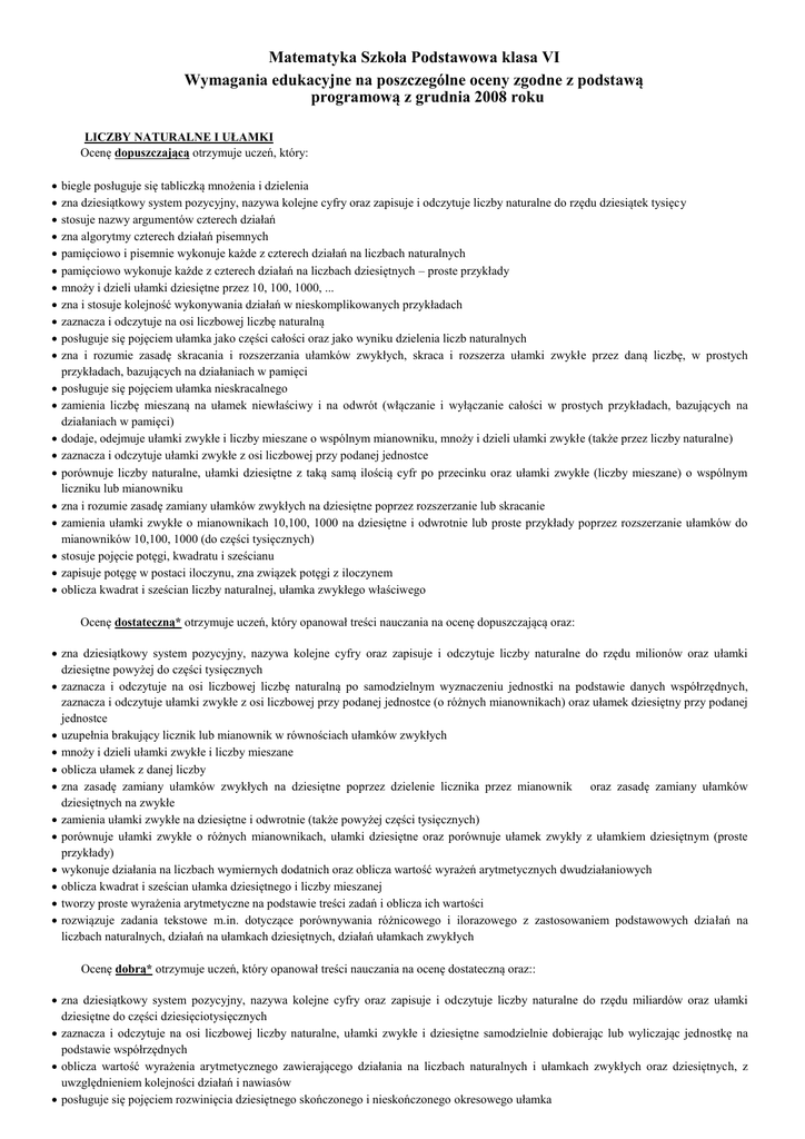 Matematyka Szkoła Podstawowa klasa VI Wymagania edukacyjne na poszczególne oceny zgodne z podstawą programową z grudnia 2008 roku LICZBY NATURALNE I UŁAMKI Ocenę dopuszczającą otrzymuje uczeń, który: biegle posługuje się tabliczką mnożenia i dzielenia zna dziesiątkowy system pozycyjny, nazywa kolejne cyfry oraz zapisuje i odczytuje liczby naturalne do rzędu dziesiątek tysięcy stosuje nazwy argumentów czterech działań zna algorytmy czterech działań pisemnych pamięciowo i pisemnie wykonuje każde z czterech działań na liczbach naturalnych pamięciowo wykonuje każde z czterech działań na liczbach dziesiętnych – proste przykłady mnoży i dzieli ułamki dziesiętne przez 10, 100, 1000, ... zna i stosuje kolejność wykonywania działań w nieskomplikowanych przykładach zaznacza i odczytuje na osi liczbowej liczbę naturalną posługuje się pojęciem ułamka jako części całości oraz jako wyniku dzielenia liczb naturalnych zna i rozumie zasadę skracania i rozszerzania ułamków zwykłych, skraca i rozszerza ułamki zwykłe przez daną liczbę, w prostych przykładach, bazujących na działaniach w pamięci posługuje się pojęciem ułamka nieskracalnego zamienia liczbę mieszaną na ułamek niewłaściwy i na odwrót (włączanie i wyłączanie całości w prostych przykładach, bazujących na działaniach w pamięci) dodaje, odejmuje ułamki zwykłe i liczby mieszane o wspólnym mianowniku, mnoży i dzieli ułamki zwykłe (także przez liczby naturalne) zaznacza i odczytuje ułamki zwykłe z osi liczbowej przy podanej jednostce porównuje liczby naturalne, ułamki dziesiętne z taką samą ilością cyfr po przecinku oraz ułamki zwykłe (liczby mieszane) o wspólnym liczniku lub mianowniku zna i rozumie zasadę zamiany ułamków zwykłych na dziesiętne poprzez rozszerzanie lub skracanie zamienia ułamki zwykłe o mianownikach 10,100, 1000 na dziesiętne i odwrotnie lub proste przykłady poprzez rozszerzanie ułamków do mianowników 10,100, 1000 (do części tysięcznych) stosuje pojęcie potęgi, kwadratu i sześcianu zapisuje potęgę w postaci iloczynu, zna związek potęgi z iloczynem oblicza kwadrat i sześcian liczby naturalnej, ułamka zwykłego właściwego Ocenę dostateczną* otrzymuje uczeń, który opanował treści nauczania na ocenę dopuszczającą oraz: zna dziesiątkowy system pozycyjny, nazywa kolejne cyfry oraz zapisuje i odczytuje liczby naturalne do rzędu milionów oraz ułamki dziesiętne powyżej do części tysięcznych zaznacza i odczytuje na osi liczbowej liczbę naturalną po samodzielnym wyznaczeniu jednostki na podstawie danych współrzędnych, zaznacza i odczytuje ułamki zwykłe z osi liczbowej przy podanej jednostce (o różnych mianownikach) oraz ułamek dziesiętny przy podanej jednostce uzupełnia brakujący licznik lub mianownik w równościach ułamków zwykłych mnoży i dzieli ułamki zwykłe i liczby mieszane oblicza ułamek z danej liczby zna zasadę zamiany ułamków zwykłych na dziesiętne poprzez dzielenie licznika przez mianownik oraz zasadę zamiany ułamków dziesiętnych na zwykłe zamienia ułamki zwykłe na dziesiętne i odwrotnie (także powyżej części tysięcznych) porównuje ułamki zwykłe o różnych mianownikach, ułamki dziesiętne oraz porównuje ułamek zwykły z ułamkiem dziesiętnym (proste przykłady) wykonuje działania na liczbach wymiernych dodatnich oraz oblicza wartość wyrażeń arytmetycznych dwudziałaniowych oblicza kwadrat i sześcian ułamka dziesiętnego i liczby mieszanej tworzy proste wyrażenia arytmetyczne na podstawie treści zadań i oblicza ich wartości rozwiązuje zadania tekstowe m.in. dotyczące porównywania różnicowego i ilorazowego z zastosowaniem podstawowych działań na liczbach naturalnych, działań na ułamkach dziesiętnych, działań ułamkach zwykłych Ocenę dobrą* otrzymuje uczeń, który opanował treści nauczania na ocenę dostateczną oraz:: zna dziesiątkowy system pozycyjny, nazywa kolejne cyfry oraz zapisuje i odczytuje liczby naturalne do rzędu miliardów oraz ułamki dziesiętne do części dziesięciotysięcznych zaznacza i odczytuje na osi liczbowej liczby naturalne, ułamki zwykłe i dziesiętne samodzielnie dobierając lub wyliczając jednostkę na podstawie współrzędnych oblicza wartość wyrażenia arytmetycznego zawierającego działania na liczbach naturalnych i ułamkach zwykłych oraz dziesiętnych, z uwzględnieniem kolejności działań i nawiasów posługuje się pojęciem rozwinięcia dziesiętnego skończonego i nieskończonego okresowego ułamka podaje rozwinięcie dziesiętne ułamka zwykłego, także rozwinięcie nieskończone okresowe w postaci skróconej, określa kolejną cyfrę rozwinięcia dziesiętnego nieskończonego okresowego na podstawie skróconego zapisu porównuje ułamek zwykły z ułamkiem dziesiętnym (trudniejsze przykłady) porównuje rozwinięcia dziesiętne nieskończone okresowe liczb podanych w zapisie skróconym porównuje potęgi o jednakowych podstawach lub jednakowych wykładnikach, jeśli podstawa jest liczbą naturalną, tworzy wyrażenia arytmetyczne na podstawie treści zadań i oblicza ich wartości, rozwiązuje zadania tekstowe m.in. dotyczące porównywania różnicowego i ilorazowego z zastosowaniem działań na liczbach naturalnych, działań na ułamkach dziesiętnych, działań ułamkach zwykłych układa zadania z treścią do podanych prostych (dwudziałaniowych) wyrażeń arytmetycznych Ocenę bardzo dobrą* otrzymuje uczeń, który opanował treści nauczania na ocenę dobrą oraz:: zna dziesiątkowy system pozycyjny, nazywa kolejne cyfry oraz zapisuje i odczytuje liczby naturalne powyżej rzędu miliardów oraz ułamki dziesiętne powyżej do części dziesięciotysięcznych oblicza wartość wyrażeń arytmetycznych wielodziałaniowych zawierających działania na liczbach wymiernych dodatnich (włącznie z potęgowaniem) oraz nawiasy, także w postaci nieskomplikowanych