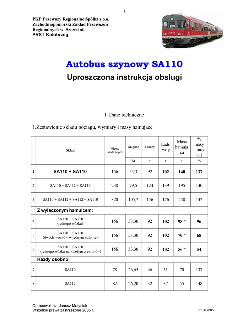1 PKP Przewozy Regionalne Spólka z o.o. Zachodniopomorski Zaklad Przewozów Regionalnych w Szczecinie PRST Kolobrzeg Autobus szynowy SA110 Uproszczona instrukcja obslugi I. Dane techniczne 1.Zestawienie skladu pociagu, wymiary i masy hamujace Sklad Miejsc siedzacych % Masa masy hamuja hamuja ca cej Dlugosc Prózny Lado wny M t t t % 1 SA110 + SA110 156 53,3 92 102 140 137 2 SA110 + SA112 + SA110 238 79,5 124 139 195 140 3 SA110 + SA112 + SA112 + SA110 320 105,7 156 176 250 142 Z wylaczonym hamulcem: 4 SA110 + SA110 (jednego wózka) 156 53,30 92 102 98 * 96 5 SA110 + SA110 (dwóch wózków w jednym czlonie) 156 53,30 92 102 70 * 68 6 SA110 + SA110 (jednego wózka na kazdym z czlonów) 156 53,30 92 102 56 * 54 Kazdy osobno: 7 SA110 78 26,65 46 51 70 137 8 SA112 82 26,20 32 37 55 148 Opracowal inz. Janusz Matysiak Wszelkie prawa zastrzezone 2005 r. 01.06.2005r. 2 * w przypadku usterki wylaczenie hamulca jednego wózka w wagonie powoduje zmniejszenie jego masy hamujacej do 40% wartosci poczatkowej. Wylaczenia dokonujemy zaworem zasilajacym przekladnik RLV. Zawór odcinajacy oznaczony jest na pudle napisem „Hamulec TD” lub „Hamulec LD” 2.Dane ogólne Maksymalna dopuszczalna predkosc - 120 km/h Najmniejszy mozliwy promien luku toru - 125 m Przetaczanie odrzutem oraz staczanie z górki rozrzadowej wzbronion e! Zasieg (planowany) od 600 do 800 km 3.Hamulec Typ hamulca - pneumatyczny hamulec tarczowy Knorr KE-R-A (D) Hamulec zawsze pracuje jako pospieszny. Zmiana intensywnosci ha mowania w zaleznosci od obciazenia (prózny/ladowny) nastepuje automatycznie dzieki zastosowaniu zaworów wazacych powodujacych wzrost cisnienia w cylindrach hamulcowych. hamulec reczny - hamulec srubowy reczny w kazdym wagonie hamulec postojowy - zalaczany elektrycznie 4.Zapasy Silnik spalinowy SA110 - zbiornik oleju napedowe go 650 l Ogrzewanie SA110 - zbiornik oleju opalowego 280 l Ogrzewanie SA112 - zbiornik oleju opalowego 208 l Woda - 200 l w kazdym WC Piasek - 150 kg na wagon silnikowy 5.Czesc elektryczna Sterowanie 24 V= wielok rotne Bateria akumulatorów 24 V/180 Ah Ogrzewanie i oswietlenie napiecie 110 V= Bateria 110 V=/100 Ah mozliwosc ladowania baterii z wlasnego prostownika podlaczanego do sieci lokalnej 230 V~/110 V= II. Tabor odstawiony na postój - hamulec reczny zakrecony w jednej kabinie - bateria 24V odlaczona w obu kabinach maszynisty - sklad stoi zamkniety, - zasilanie 230V podlaczone lub nie do wagonów napedowych, - podgrzewacze wylaczone lub czynne ustawione na podtrzymanie temperatury silnika al bo silnika i przedzialów osobowch. Opracowal inz. Janusz Matysiak Wszelkie prawa zastrzezone 2005 r. 01.06.2005r. 3 III. Przygotowanie do jazdy - czynnosci 1. Wagon sterujacy (przedni) 1.1. Na zewnatrz i w przedsionku wagonu: a. Po otwarciu klap na szafkach 110V i 24 V sprawdzamy polozenie wylaczników - na zalaczeniu b. Sprawdzamy poziom paliwa w zbiorniku silnika i podgrzewacza. c. Sprawdzamy poziom oleju silnikowego na miarce przy wlewie d. Jezeli kabel zasilania 110V jest podlaczony to nalezy go odlaczyc i schowac go szafki e. W przedsionku sprawdzamy poziom plynu w zbiorn iku wyrównawczym silnika. f. Reczna pompka zabudowana na zbiorniku wyrównawczym ukladu podgrzewacza pompujemy plyn ze zbiornika przelewowego az do chwili, kiedy w szkle kontrolnym zauwazymy przelewajacy sie plyn. W tym momencie odczytujemy poziom plynu na miarce zbiornika przelewowego, którego poziom powinien byc zblizony do poziomu wymaganego z uwzglednieniem jego temperatury. 1.2. Sprawdzamy hamulec reczny i gdy jest wyluzowany to go zakrecamy (kabina, z której bedzie prowadzona jazda) 1.3. W kabin ie maszynisty: a. Zalaczmy wylacznik baterii 24V w szafie nad fotelem maszynisty. b. Przez wcisniecie przelacznika na woltomierzu kontrolujemy wartosc napiecia baterii 24V. c. Na wskazniku (nr 73) odczytujemy temperature plynu chlodzacego silnik. Jezeli jest mniej niz 30°C to musimy podgrzac silnik. Grzanie silnika - ustawiamy przelacznik (10) w szafie podgrzewacza na pozycje grzanie wody w silniku (pokretlo na godz.12) a nastepnie wlaczamy podgrzewacz przelacznikiem glównym (48). Reczne dzwignie grzani a przedzialów ustawiamy w pozycje "0". Do czasu podgrzania silnika wagonu sterujacego mozemy wykonac czynnosci przygotowania do uruchomienia silnika w wagonie tylnym. 1.4.Uruchomienie silnika a. W wagonie sterujacym, gdy temperatura wynosi wiecej niz 30°C przystepujemy do czynnosci zwiazanych z uruchomieniem silnika. b. Sprawdzamy ustawienie przelacznika wagonu w szafie w kabinie maszynisty (nad drzwiami) w pozycji "VT". c. Sprawdzamy czy wszystkie wylaczniki mostkowe sa wylaczone (6 szt. w pozycji do góry i 3 szt. wyl. w pozycji w prawo) a wylaczniki automatyczne zasilajace poszczególne obwody sa w stanie zalaczonym. W stanie wylaczonym (w dól) pozostaja tylko przelaczniki: - 503 - przeniesienie 24V na drugi wagon jest wylaczony - EbuLa – zasilanie systemu Rozkladu Jazdy - gdy system jest nieuzywany - Radio DB - gdy jest nieuzywane - Smarowanie obrzezy, – gdy nie uzywamy d. Nastawiamy kierunek ''przód'' -jezeli lampka przekladni swieci (brak zazebienia) zmieniamy kierunek az lampka zgasnie. Nie wolno startowac silnika, gdy nie ma potwierdzenia kierunku. e. Startujemy silnik przelacznikiem 51 grupa I, i kontrolujemy napiecie, prad i obroty silnika. 1 Uwaga: Dla ulatwienia wzbudzenia sie pradnicy 110V, nastawnik jazdy ustawiamy (na chwile) w pozy cje 2-3 aby obroty wzrosly do okolo 1200-1500. Przechodzac pózniej kolo szafy sterowniczej 110 V nalezy koniecznie sprawdzic napiecie, prad ladowania, swiecenie sie lampek R,S,T oraz lampki „ladowanie”. f. Zawór maszynisty ustawiamy w „odciecie” i wyjmujemy kluczyk a nastawnik kierunku ustawiamy w ''0'' i wyjmujemy dzwignie nastawnika. Kluczyk i dzwignia kierunkowa potrzebne beda do uruchomienia drugiego wagonu. 1.5.Wlaczenie podgrzewacza wagonu napedowego (w okresie wystepowania niskich temperatur a. Przelacznik 10 ustawiamy w pozycje - grzanie przedzialów po
