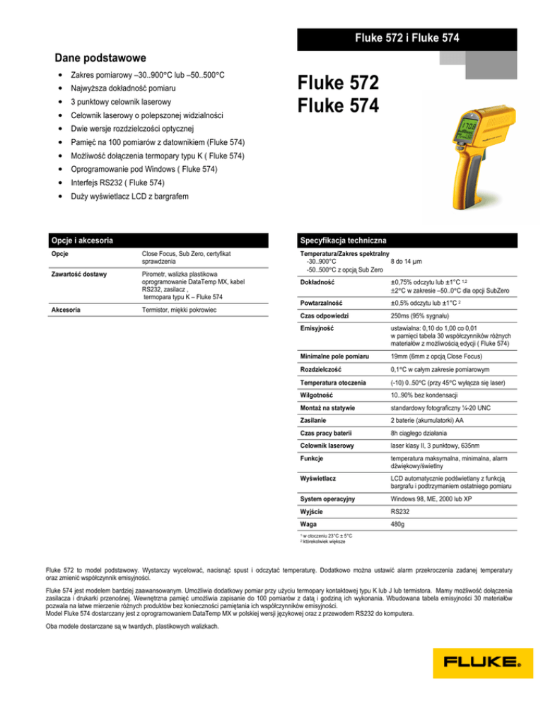 Fluke 572 i Fluke 574 Dane podstawowe • Zakres pomiarowy –30..900°C lub –50..500°C • Najwyższa dokładność pomiaru • 3 punktowy celownik laserowy • Celownik laserowy o polepszonej widzialności Fluke 572 Fluke 574 • Dwie wersje rozdzielczości optycznej • Pamięć na 100 pomiarów z datownikiem (Fluke 574) • Możliwość dołączenia termopary typu K ( Fluke 574) • Oprogramowanie pod Windows ( Fluke 574) • Interfejs RS232 ( Fluke 574) • Duży wyświetlacz LCD z bargrafem Opcje i akcesoria Specyfikacja techniczna Opcje Close Focus, Sub Zero, certyfikat sprawdzenia Zawartość dostawy Pirometr, walizka plastikowa oprogramowanie DataTemp MX, kabel RS232, zasilacz , termopara typu K – Fluke 574 Akcesoria Termistor, miękki pokrowiec Temperatura/Zakres spektralny -30..900°C 8 do 14 µm -50..500°C z opcją Sub Zero Dokładność ±0,75% odczytu lub ±1°C 1,2 ±2°C w zakresie –50..0°C dla opcji SubZero Powtarzalność ±0,5% odczytu lub ±1°C 2 Czas odpowiedzi 250ms (95% sygnału) Emisyjność ustawialna: 0,10 do 1,00 co 0,01 w pamięci tabela 30 współczynników różnych materiałów z możliwością edycji ( Fluke 574) Minimalne pole pomiaru 19mm (6mm z opcją Close Focus) Rozdzielczość 0,1°C w całym zakresie pomiarowym Temperatura otoczenia (-10) 0..50°C (przy 45°C wyłącza się laser) Wilgotność 10..90% bez kondensacji Montaż na statywie standardowy fotograficzny ¼-20 UNC Zasilanie 2 baterie (akumulatorki) AA Czas pracy baterii 8h ciągłego działania Celownik laserowy laser klasy II, 3 punktowy, 635nm Funkcje temperatura maksymalna, minimalna, alarm dźwiękowy/świetlny Wyświetlacz LCD automatycznie podświetlany z funkcją bargrafu i podtrzymaniem ostatniego pomiaru System operacyjny Windows 98, ME, 2000 lub XP Wyjście RS232 Waga 480g 1 2 w otoczeniu 23°C ± 5°C którekolwiek większe Fluke 572 to model podstawowy. Wystarczy wycelować, nacisnąć spust i odczytać temperaturę. Dodatkowo można ustawić alarm przekroczenia zadanej temperatury oraz zmienić współczynnik emisyjności. Fluke 574 jest modelem bardziej zaawansowanym. Umożliwia dodatkowy pomiar przy użyciu termopary kontaktowej typu K lub J lub termistora. Mamy możliwość dołączenia zasilacza i drukarki przenośnej. Wewnętrzna pamięć umożliwia zapisanie do 100 pomiarów z datą i godziną ich wykonania. Wbudowana tabela emisyjności 30 materiałów pozwala na łatwe mierzenie różnych produktów bez konieczności pamiętania ich współczynników emisyjności. Model Fluke 574 dostarczany jest z oprogramowaniem DataTemp MX w polskiej wersji językowej oraz z przewodem RS232 do komputera. Oba modele dostarczane są w twardych, plastikowych walizkach. Oprogramowanie DataTemp MX Model Fluke 574 dostarczany jest wraz z oprogramowaniem pod Windows do wizualizacji i archiwizacji danych pomiarowych. Oprogramowanie umożliwia też eksport danych, zmianę nazw poszczególnych miejsc pomiarowych, edycję materiałów i ich współczynników emisyjności, porównanie kolejnych danych pomiarowych. Wykres przebiegu temperatury Dane w formie tabeli Diagram porównania temperatur 5 punktów w czasie 1 roku IRtech ul. Zakopiańska 73, 30-418 Kraków tel. /12/ 267 37 74, /12/ 266 67 50 fax /12/ 268 11 81 [email protected] www.irtech.pl Specyfikacja optyczna