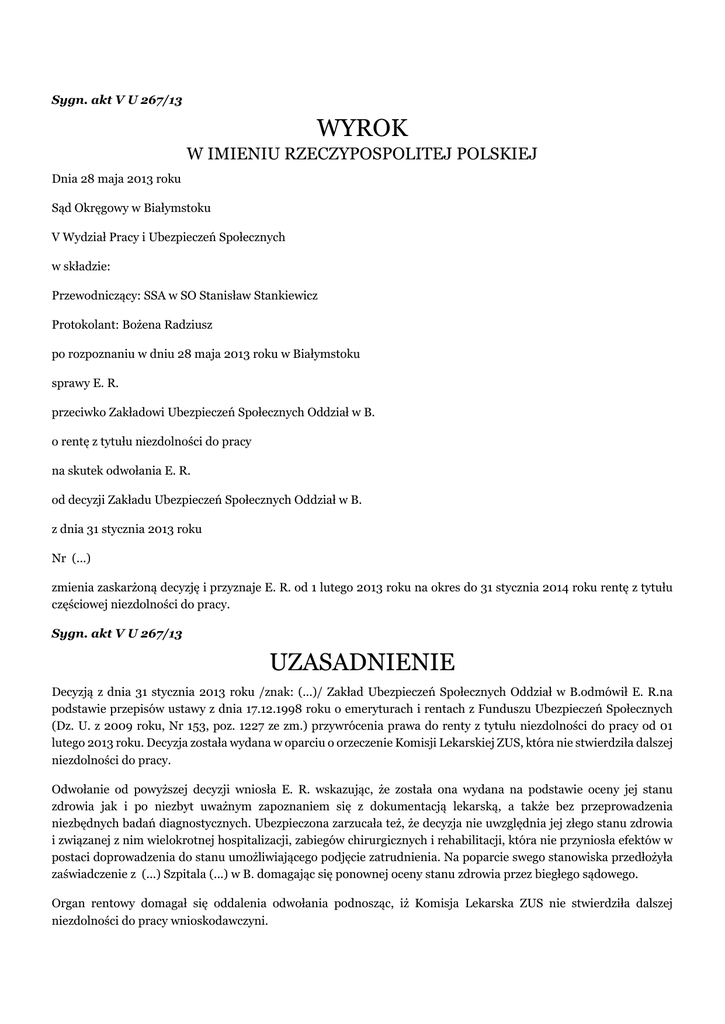 Sygn. akt V U 267/13 WYROK W IMIENIU RZECZYPOSPOLITEJ POLSKIEJ Dnia 28 maja 2013 roku Sąd Okręgowy w Białymstoku V Wydział Pracy i Ubezpieczeń Społecznych w składzie: Przewodniczący: SSA w SO Stanisław Stankiewicz Protokolant: Bożena Radziusz po rozpoznaniu w dniu 28 maja 2013 roku w Białymstoku sprawy E. R. przeciwko Zakładowi Ubezpieczeń Społecznych Oddział w B. o rentę z tytułu niezdolności do pracy na skutek odwołania E. R. od decyzji Zakładu Ubezpieczeń Społecznych Oddział w B. z dnia 31 stycznia 2013 roku Nr (...) zmienia zaskarżoną decyzję i przyznaje E. R. od 1 lutego 2013 roku na okres do 31 stycznia 2014 roku rentę z tytułu częściowej niezdolności do pracy. Sygn. akt V U 267/13 UZASADNIENIE Decyzją z dnia 31 stycznia 2013 roku /znak: (...)/ Zakład Ubezpieczeń Społecznych Oddział w B.odmówił E. R.na podstawie przepisów ustawy z dnia 17.12.1998 roku o emeryturach i rentach z Funduszu Ubezpieczeń Społecznych (Dz. U. z 2009 roku, Nr 153, poz. 1227 ze zm.) przywrócenia prawa do renty z tytułu niezdolności do pracy od 01 lutego 2013 roku. Decyzja została wydana w oparciu o orzeczenie Komisji Lekarskiej ZUS, która nie stwierdziła dalszej niezdolności do pracy. Odwołanie od powyższej decyzji wniosła E. R. wskazując, że została ona wydana na podstawie oceny jej stanu zdrowia jak i po niezbyt uważnym zapoznaniem się z dokumentacją lekarską, a także bez przeprowadzenia niezbędnych badań diagnostycznych. Ubezpieczona zarzucała też, że decyzja nie uwzględnia jej złego stanu zdrowia i związanej z nim wielokrotnej hospitalizacji, zabiegów chirurgicznych i rehabilitacji, która nie przyniosła efektów w postaci doprowadzenia do stanu umożliwiającego podjęcie zatrudnienia. Na poparcie swego stanowiska przedłożyła zaświadczenie z (...) Szpitala (...) w B. domagając się ponownej oceny stanu zdrowia przez biegłego sądowego. Organ rentowy domagał się oddalenia odwołania podnosząc, iż Komisja Lekarska ZUS nie stwierdziła dalszej niezdolności do pracy wnioskodawczyni. Sąd Okręgowy ustalił i zważył, co następuje: Odwołanie E. R. jest zasadne. Zgodnie z art. 57 ustawy z dnia 17.12.1998 r. o emeryturach i rentach z Funduszu Ubezpieczeń Społecznych, renta z tytułu niezdolności do pracy przysługuje ubezpieczonemu, który spełnił łącznie następujące warunki: 1) jest niezdolny do pracy; 2) ma wymagany okres składkowy i nieskładkowy; 3) niezdolność do pracy powstała w okresach, o których mowa w art. 6 ust. 1 pkt 1 i 2, pkt 3 lit. b, pkt 4, 6, 7 i 9, ust. 2 pkt 1, 3-8 i 9 lit. a, pkt 10 lit. a, pkt 11-12, 13 lit. a, pkt 14 lit. a i pkt 15-17 oraz art. 7 pkt 1-4, 5 lit. a, pkt 6 i 12, albo nie później niż w ciągu 18 miesięcy od ustania tych okresów. Po spełnieniu określonych w ustawie warunków organ rentowy przyznaje świadczenie w postaci renty stałej – jeżeli niezdolność do pracy jest trwała lub renty okresowej – jeżeli niezdolność do pracy jest okresowa. Świadczenie to w każdym czasie podlega kontroli organu rentowego. Zgodnie z treścią art. 61 wspomnianej ustawy prawo do renty, które ustało z powodu ustąpienia niezdolności do pracy podlega przywróceniu, jeżeli w ciągu 18 miesięcy od ustania prawa do renty ubezpieczony ponownie stał się niezdolny do pracy. W niniejszej sprawie bezsporny był fakt, iż wnioskodawczyni korzystała ze świadczenia rentowego z tytułu niezdolności do pracy od dnia 07 stycznia 2012 roku do dnia 31 lipca 2012 – na mocy decyzji ZUS z dnia 30 kwietnia 2012 roku, a także od dnia 01 sierpnia 2012 roku do dnia 31 stycznia 2013 roku – na mocy decyzji ZUS z dnia 31 lipca 2012 roku. Kwestią sporną była ocena stanu jej zdrowia w kontekście ewentualnej niezdolności do pracy. Wobec zaistnienia powyższych wątpliwości, Sąd dopuścił dowód z opinii biegłej z zakresu schorzeń, na które cierpi wnioskodawczyni tj. z zakresu neurologii. Biegła sądowa po przeprowadzeniu analizy dokumentacji medycznej, wywiadu i badania lekarskiego rozpoznała u odwołującej dyskopatię wielopoziomową kręgosłupa szyjnego i lędźwiowo – krzyżowego z silnym zespołem bólowym, z dodatnimi objawami korzeniowymi rozciągowymi, z objawową rwą kulszową prawostronną, z istotnym upośledzeniem funkcji układu ruchu, a także stan po leczeniu operacyjnym dyskopatii L4 – L5 w sierpniu 2010 roku. Zgodnie z opinią biegłej, odwołująca nie pracuje od 2010 roku (od operacji wpadniętego dysku na poziomie L4 – L5). Po krótkotrwałej poprawie nastąpił nawrót silnych dolegliwości bólowych ze strony kręgosłupa l-s i prawej kończyny dolnej. Zostały one potwierdzenie w badaniu rezonansu magnetycznego oraz w badaniu przedmiotowym (neurologicznym). Stwierdza się znaczne ograniczenie ruchomości kręgosłupa szyjnego i l-s, silnie wyrażone objawy korzeniowe rozciągowe, zniesienie prawego odruchu skokowego. Opiniowana oczekuje na kolejną operację kręgosłupa z powodu dyskopatii lędźwiowej. Stan zaawansowania choroby czyni E. R. nadal częściowo niezdolną do pracy zarobkowej na okres jednego roku, celem wykonania operacji oraz leczenia rehabilitacyjnego po zabiegu operacyjnym. W konkluzji biegła uznała odwołującą za częściowo niezdolną do pracy zarobkowej od 01 lutego 2013 roku do dnia 31 stycznia 2014 roku /k. 13 – 15/. Do powyższej opinii zastrzeżenia wniósł organ rentowy przedkładając stanowisko Przewodniczącego Komisji Lekarskich ZUS, zgodnie z którym ubezpieczona przebyła operację kręgosłupa w sierpniu 2010 roku /implantacja stabilizatora w przestrzeń międzykręgową L4 – L5/, a w styczniu 2012 roku stabilizator usunięto i wykonano operacyjne odbarczenie kanału kręgowego. Badana od 2010 roku wykorzystała z tego tytułu cały okres zasiłkowy, 12 – miesięczne świadczenie rehabilitacyjne i roczny okres świadczeń rentowych. Była badana przez dwóch specjalistów z zakresu neurologii i nie stwierdzon