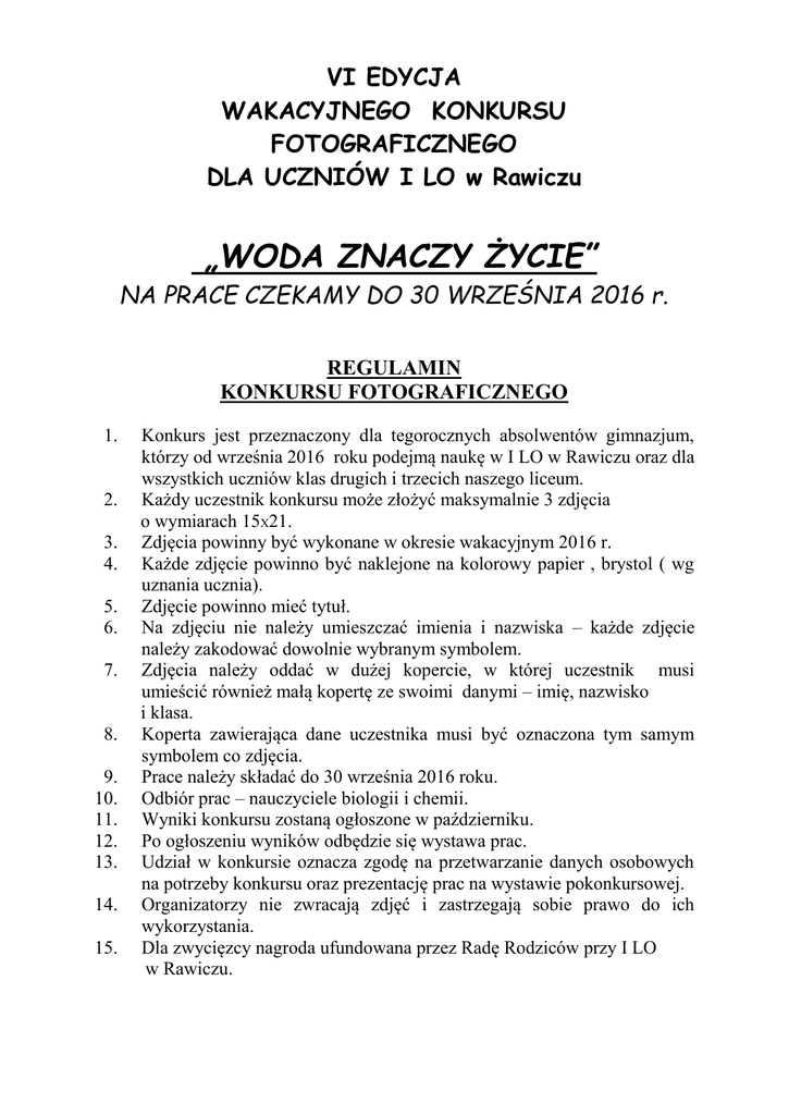 VI EDYCJA WAKACYJNEGO KONKURSU FOTOGRAFICZNEGO DLA UCZNIÓW I LO w Rawiczu „WODA ZNACZY ŻYCIE” NA PRACE CZEKAMY DO 30 WRZEŚNIA 2016 r. REGULAMIN KONKURSU FOTOGRAFICZNEGO 1. 2. 3. 4. 5. 6. 7. 8. 9. 10. 11. 12. 13. 14. 15. Konkurs jest przeznaczony dla tegorocznych absolwentów gimnazjum, którzy od września 2016 roku podejmą naukę w I LO w Rawiczu oraz dla wszystkich uczniów klas drugich i trzecich naszego liceum. Każdy uczestnik konkursu może złożyć maksymalnie 3 zdjęcia o wymiarach 15X21. Zdjęcia powinny być wykonane w okresie wakacyjnym 2016 r. Każde zdjęcie powinno być naklejone na kolorowy papier , brystol ( wg uznania ucznia). Zdjęcie powinno mieć tytuł. Na zdjęciu nie należy umieszczać imienia i nazwiska – każde zdjęcie należy zakodować dowolnie wybranym symbolem. Zdjęcia należy oddać w dużej kopercie, w której uczestnik musi umieścić również małą kopertę ze swoimi danymi – imię, nazwisko i klasa. Koperta zawierająca dane uczestnika musi być oznaczona tym samym symbolem co zdjęcia. Prace należy składać do 30 września 2016 roku. Odbiór prac – nauczyciele biologii i chemii. Wyniki konkursu zostaną ogłoszone w październiku. Po ogłoszeniu wyników odbędzie się wystawa prac. Udział w konkursie oznacza zgodę na przetwarzanie danych osobowych na potrzeby konkursu oraz prezentację prac na wystawie pokonkursowej. Organizatorzy nie zwracają zdjęć i zastrzegają sobie prawo do ich wykorzystania. Dla zwycięzcy nagroda ufundowana przez Radę Rodziców przy I LO w Rawiczu.