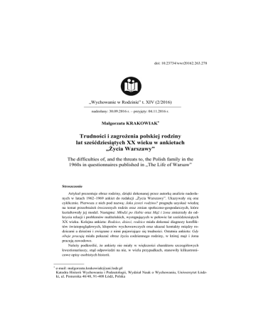 doi: 10.23734/wwr20162.263.278 „Wychowanie w Rodzinie” t. XIV (2/2016) nadesłany: 30.09.2016 r. – przyjęty: 04.11.2016 r. Małgorzata KRAKOWIAK∗ Trudności i zagrożenia polskiej rodziny lat sześćdziesiątych XX wieku w ankietach „Życia Warszawy” The difficulties of, and the threats to, the Polish family in the 1960s in questionnaires published in „The Life of Warsaw” Streszczenie Artykuł prezentuje obraz rodziny, dzięki dokonanej przez autorkę analizie nadesłanych w latach 1962–1969 ankiet do redakcji „Życia Warszawy”. Ukazywały się one cyklicznie. Pierwsza z nich pod nazwą: Jaka jesteś rodzino? pragnęła uzyskać wiedzę na temat przeobrażeń ówczesnych rodzin oraz zmian społeczno-gospodarczych, które kształtowały jej model. Następne: Młodzi po ślubie oraz Mąż i żona zmierzały do odkrycia relacji i problemów małżeńskich, występujących w połowie lat sześćdziesiątych XX wieku. Kolejna ankieta: Rodzice, dzieci, rodzice miała dokonać diagnozy konfliktów światopoglądowych, kłopotów wychowawczych oraz ukazać kontakty między rodzicami a dziećmi i związane z nimi pojawiające się trudności. Ostatnia ankieta: Gdy oboje pracują miała pokazać obraz życia codziennego rodziny, w której mąż i żona pracują zawodowo. Należy podkreślić, że ankiety nie miały w większości charakteru szczegółowych kwestionariuszy, stąd odpowiedzi na nie, w wielu przypadkach, stanowiły kilkustronicowe opisy osobistych historii. ∗ e-mail: [email protected] Katedra Historii Wychowania i Pedeutologii, Wydział Nauk o Wychowaniu, Uniwersytet Łódzki, ul. Pomorska 46/48, 91-408 Łódź, Polska Małgorzata KRAKOWIAK 264 Analiza zebranych przez „Życie Warszawy” materiałów pozwoliła na uzyskanie charakterystycznych i najczęściej występujących problemów rodzin lat sześćdziesiątych ubiegłego wieku. Odpowiedzi udzielone w ankietach można uznać za historyczny głos ludzi żyjących w czasach PRL-u. Słowa kluczowe: „Życie Warszawy”, rodzina, zagrożenia rodziny, Polska Rzeczpospolita Ludowa. Abstract The article presents the picture of a family, based on the analysis of questionnaires devised by the Author. The surveys were sent between 1962–1969 to the editorial office of the „Life of Warsaw”. They appeared periodically. The first of them was entitled „What is you family like?”. The main purpose was to get the knowledge about transformations of contemporary families and social-economic changes which shaped the model of a family. The next two surveys „Young couples” and „Husband and Wife” aimed to discover relationships and marital problems which were appearing in the 1960s. Another questionnaire „Parents, children, parents” was expected to make the diagnosis of ideological conflicts, behavioral problems, as well as relations between parents and children and related problems. The last survey „When they both work” showed a picture of the ordinary family life in which the husband and wife worked professionally. It should be emphasized that the questionnaire did not have the form of detailed surveys. They had an opened-question form which resulted in the collection of multipage descriptions of personal histories. The analysis of materials published in „The Life of Warsaw” enabled the Author to obtain a common characteristic and certain problems of families in the 1960’s. The responses to questionnaires can be regarded as a historical voice of the people living in The Polish People’s Republic. Keywords: „The Life of Warsaw”, family, family problems, The Polish People’s Republic. Od końca lat pięćdziesiątych XX wieku na łamach „Życia Warszawy”1 zainicjowano nową formę kontaktu z czytelnikami. Dziennik ten, jako jedno z pierwszych pism, zastosował metodę sondażu diagnostycznego, aby wsłuchać się w głos czytelników na temat ówczesnych kwestii społecznych. Już pierwszy z nich przyniósł redakcji wiele listów i wypowiedzi. Nadesłane relacje dotyczyły przeróżnych zagadnień: od obrazów wojny widzianych oczami dziecka, przez 1 „Życie Warszawy” ukazywało się w stolicy od 1944 roku. Wydawcą tej gazety w latach 1944– 1947 była Spółdzielnia Dziennikarska, następnie do 1951 roku Spółdzielnia Wydawnicza „Czytelnik”, a w latach 1951–1991 Robotnicza Spółdzielnia Wydawnicza „Prasa – Książka – Ruch”, por. źródło: . http://polskaprasa.cba.pl/tytuly/zycie_warszawy.html [dostęp: 10.04.2016]. r.] Trudności i zagrożenia polskiej rodziny lat sześćdziesiątych... 265 problemy zawodowe pracujących Polaków, w szczególności kobiet, po sprawy związane z problemami dnia powszedniego. Z biegiem czasu ankietowe pytania, ukazujące się na łamach dziennika, przybrały postać konkursów, a nadsyłane prace były oceniane i nagradzane finansowo przez redakcję. Warto zauważyć, że „Życie Warszawy” publikowało na swoich łamach w całości lub we fragmentach najciekawsze relacje czytelników, pozyskane dzięki sondażom. Ze względu na fakt, że redakcja nie wyznaczyła jednoznacznych kryteriów oceny, według których przyznawano nagrody i nie określiła warunków drukowania materiałów, jeden z czytelników zarzucił gazecie brak zasad przyznawania wyróżnień i reguł zamieszczania w niej tekstów. Odpowiadając na tę krytykę informowano, że jury wybierając zwycięzców kierowało się „[...] wartościami merytorycznymi oraz rzeczowością i konkretami w wypowiedzi, które oddają możliwie wierny obraz życia rodziny”2. Ankiety skoncentrowane na tematyce rodzinnej zostały zapoczątkowane przez „Życie Warszawy” sondażem przeprowadzonym w 1957 roku na temat: Czy kryzys rodziny? Od tego czasu pojawiał się stały cykl tematyczny związany z problemami ówczesnej rodziny3. Nadsyłane przez czytelników opracowania najczęściej stanowiły kilkustronicowe opisy osobistych przeżyć i zdarzeń, ukazujące kulisy 