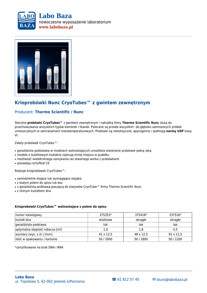 Labo Baza nowoczesne wyposażenie laboratorium www.labobaza.pl Krioprobówki Nunc CryoTubes™ z gwintem zewnętrznym Producent: Thermo Scientific / Nunc Sterylne probówki CryoTubes™ z gwintem zewnętrznym i nakrętką firmy Thermo Scientific Nunc służą do przechowywania wszystkich typów komórek i tkanek. Polecane są przede wszystkim do głęboko zamrożonych próbek umieszczanych w zamrażarkach niskotemperaturowych. Probówki są nietoksyczne, apyrogenne i spełniają normy USP klasy VI. Zalety probówek CryoTubes™: ● ● ● ● gwiaździsta podstawka w modelach wolnostojących umożliwia otwieranie probówek jedną ręką modele o butelkowym kształcie zajmują mniej miejsca w pudełku możliwość wielokrotnego zamykania raz otwartego worka z probówkami posiadają certyfikat CE Rodzaje krioprobówek CryoTubes™: ● ● ● ● samodzielnie stojące lub wymagające stojaka z białym polem do opisu lub bez z gwiaździstą podstawą pasującą do statywów CryoTube™ firmy Thermo Scientific Nunc z różnym kształtem dna Krioprobówki CryoTubes™ wolnostojące z polem do opisu numer katalogowy 375353* 375418* 337516* kształt dna stożkowe okrągłe okrągłe gwiaździsta podstawa tak tak tak optymalna objętość robocza [ml] 1,0 1,8 4,5 wymiary (wys. x śr.) [mm] 41 x 12,5 48 x 12,5 91 x 12,5 ilość w opakowaniu / kartonie 50 / 2000 50 / 1800 50 / 1200 *certyfikowane na brak DNA i RNA Labo Baza ul. Topolowa 5, 62-002 Jelonek k/Poznania ☎ 61 812 57 45 ✉ [email protected] Labo Baza nowoczesne wyposażenie laboratorium www.labobaza.pl Krioprobówki CryoTubes™ wolnostojące bez pola do opisu numer katalogowy 347597* 347627* 347643* kształt dna stożkowe okrągłe okrągłe tak tak tak gwiaździsta podstawa optymalna objętość robocza [ml] 1,0 1,8 4,5 wymiary (wys. x śr.) [mm] 41 x 12,5 48 x 12,5 91 x 12,5 ilość w opakowaniu / kartonie 50 / 2000 50 / 1800 50 / 1200 *certyfikowane na brak DNA i RNA Krioprobówki CryoTubes™ z okrągłym dnem wymagające stojaka numer katalogowy 375299* 340711* kształt dna okrągłe okrągłe gwiaździsta podstawa nie nie optymalna objętość robocza [ml] 1,0 1,8 wymiary (wys. x śr.) [mm] 30 x 12,4 44 x 12,4 ilość w opakowaniu / kartonie 50 / 2000 50 / 2000 *certyfikowane na brak DNA i RNA Kontakt Labo Baza ul. Topolowa 5, 62-002 Jelonek k/Poznania tel: 61 812 57 45 fax: 61 812 57 25 e-mail: [email protected] www.labobaza.pl Źródło: http://www.labobaza.pl/produkt/krioprobowki-nunc-cryotubes-z-gwintem-zewnetrznym/378 Labo Baza ul. Topolowa 5, 62-002 Jelonek k/Poznania ☎ 61 812 57 45 ✉ [email protected]