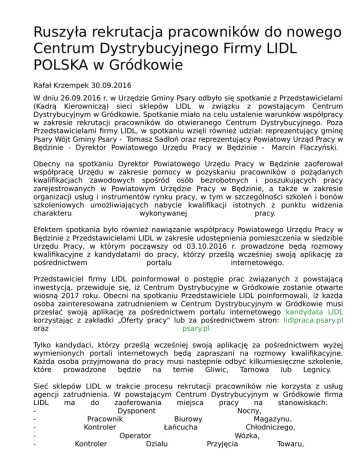 Ruszyła rekrutacja pracowników do nowego Centrum Dystrybucyjnego Firmy LIDL POLSKA w Gródkowie Rafał Krzempek 30.09.2016 W dniu 26.09.2016 r. w Urzędzie Gminy Psary odbyło się spotkanie z Przedstawicielami (Kadrą Kierowniczą) sieci sklepów LIDL w związku z powstającym Centrum Dystrybucyjnym w Gródkowie. Spotkanie miało na celu ustalenie warunków współpracy w zakresie rekrutacji pracowników do otwieranego Centrum Dystrybucyjnego. Poza Przedstawicielami firmy LIDL, w spotkaniu wzięli również udział: reprezentujący gminę Psary Wójt Gminy Psary - Tomasz Sadłoń oraz reprezentujący Powiatowy Urząd Pracy w Będzinie - Dyrektor Powiatowego Urzędu Pracy w Będzinie - Marcin Flaczyński. Obecny na spotkaniu Dyrektor Powiatowego Urzędu Pracy w Będzinie zaoferował współpracę Urzędu w zakresie pomocy w pozyskaniu pracowników o pożądanych kwalifikacjach zawodowych spośród osób bezrobotnych i poszukujących pracy zarejestrowanych w Powiatowym Urzędzie Pracy w Będzinie, a także w zakresie organizacji usług i instrumentów rynku pracy, w tym w szczególności szkoleń i bonów szkoleniowych umożliwiających nabycie kwalifikacji istotnych z punktu widzenia charakteru wykonywanej pracy. Efektem spotkania było również nawiązanie współpracy Powiatowego Urzędu Pracy w Będzinie z Przedstawicielami LIDL w zakresie udostępnienia pomieszczenia w siedzibie Urzędu Pracy, w którym począwszy od 03.10.2016 r. prowadzone będą rozmowy kwalifikacyjne z kandydatami do pracy, którzy prześlą wcześniej swoją aplikację za pośrednictwem portalu internetowego. Przedstawiciel firmy LIDL poinformował o postępie prac związanych z powstającą inwestycją, przewiduje się, iż Centrum Dystrybucyjne w Gródkowie zostanie otwarte wiosną 2017 roku. Obecni na spotkaniu Przedstawiciele LIDL poinformowali, iż każda osoba zainteresowana zatrudnieniem w Centrum Dystrybucyjnym w Gródkowie musi przesłać swoją aplikację za pośrednictwem portalu internetowego kandydata LIDL korzystając z zakładki „Oferty pracy" lub za pośrednictwem stron: lidlpraca.psary.pl oraz psary.pl Tylko kandydaci, którzy prześlą wcześniej swoją aplikację za pośrednictwem wyżej wymienionych portali internetowych będą zapraszani na rozmowy kwalifikacyjne. Każda osoba przyjmowana do pracy musi następnie odbyć kilkumiesięczne szkolenie, które prowadzone będzie na ternie Gliwic, Tarnowa lub Legnicy. Sieć sklepów LIDL w trakcie procesu rekrutacji pracowników nie korzysta z usług agencji zatrudnienia. W powstającym Centrum Dystrybucyjnym w Gródkowie firma LIDL ma do zaoferowania miejsca pracy na stanowiskach: Dysponent Nocny, Pracownik Biurowy Magazynu, Kontroler Łańcucha Chłodniczego, Operator Wózka, Kontroler Działu Przyjęcia Towaru, - Kontroler Pracownik Gospodarki Paletowej, Magazynu. Aktualnie prowadzona jest rekrutacja na stanowiska Kontrolera Gospodarki Paletowej oraz Pracownika Biurowego Magazynu. Na kolejne stanowiska rekrutacja prowadzona będzie sukcesywnie w kolejnych miesiącach. W obiekcie magazynowym o powierzchni 45 tys. m² ma znaleźć zatrudnienie około 220 osób.