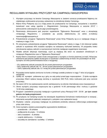 REGULAMIN WYNAJMU PRZYCZEP NA CAMPINGU MASZOPERIA 1. Wynajem przyczepy na terenie Campingu Maszoperia w Jastarni oznacza przekazanie Najemcy do odpłatnego użytkowania przyczepy ustawionej na określonej działce Campingu. 2. Klienci firmy Polsporty sp.z.o.o mają prawo do przebywania na Campingu, korzystania z wszelkich świadczeń oraz usług zgodnie z „Regulaminem Campingu Maszoperia w sezonie 2012” i jednocześnie zobowiązani są do jego przestrzegania. 3. Rezerwacja dokonywana jest poprzez wypełnienie "Zgłoszenia Rezerwacji" wraz z akceptacją niniejszego Regulaminu i przesłanie jej pocztą elektroniczną na adres e-mailowy [email protected]. 4. Potwierdzenie przyjęcia "Zgłoszenia Rezerwacji" przez firmę Polsporty sp.z.o.o następuje drogą emailową w ciągu 3 dni. 5. Po otrzymaniu potwierdzenia przyjęcia "Zgłoszenia Rezerwacji" należy w ciągu 3 dni dokonać wpłaty zaliczki w wysokości 40% kosztów wynajmu na wskazany rachunek bankowy. W przypadku braku odnotowania wpływu zaliczki w wyznaczonym terminie następuje wygaśnięcie rezerwacji. 6. Wpłata zaliczki aktywuje rezerwację, czyni ją wiążącą dla stron na zasadach określonych w niniejszym Regulaminie oraz w "Zgłoszeniu Rezerwacji". 7. Każdy klient w dowolnym czasie może zrezygnować z wynajmu w formie pisemnej (e-mail). Wówczas pobierana jest jedynie opłata anulacyjna w wysokości uzależnionej od ilości dni pozostałych do dnia wynajmu od dnia poinformowania biura o rezygnacji. - 0% wpłaconej zaliczki powyżej 30 dni przed planowanym przyjazdem - 50% wpłaconej zaliczki dla 14 - 29 dni przed planowanym przyjazdem - 100% wpłaconej zaliczki dla 13 i mniej dni przed planowanym przyjazdem 8. Pozostała kwota będzie zwrócona na konto z którego została przelana w ciągu 7 dnia od przyjęcia rezygnacji. 9. Opłaty za wynajem pobierane są z góry za cały pobyt przed jego rozpoczęciem. Z tytułu wynajęcia przyczepy Klient wpłaca kaucję zwrotną w wysokości 500 PLN, która rozliczana jest przy zwrocie przyczepy. 10. Na sezon 2012 ma zastosowanie cennik zamieszczony na stronie internetowej www.maszoperia.pl. 11. Okres wynajmu przyczepy rozpoczyna się o godzinie 14.00 pierwszego dnia i kończy o godzinie 12.00 dnia ostatniego. 12. Przyjazd i zasiedlenie przyczep następuje w godzinach pracy Recepcji 8.00 - 20.00 , po tym czasie goście nie będą przyjmowani. 13. Po przybyciu na Camping turysta ma obowiązek dopełnienia formalności meldunkowych w recepcji , dokonania wszystkich płatności związanych z pobytem oraz wpłacenia kaucji. 14. Wydanie i zdanie przyczepy następuje na podstawie protokołu zdawczo odbiorczego podpisanego przez obie strony. 15. Cena wynajmu zawiera poszczególne wyposażenie dodatkowe : - przedsionek – 25 zł/doba - podłączenie do prądu - 12 zł/doba - stół z krzesłami – 8 zł/doba - czajnik elektryczny – 5 zł/doba - szczotkę do zamiatania i szufelkę – 2 zł/doba Brak z któregokolwiek wyposażenia dodatkowego, nie powoduje rozwiązania umowy. Najemcy przysługuje wyłącznie prawo do obniżenia ceny najmu za każdą dobę braku wyposażenia dodatkowego zgodnie z powyższym cennikiem. 16. W przyczepie Campingowej może mieszkać i ją użytkować wyłącznie taka liczba osób jaka była deklarowana w zgłoszeniu rezerwacji i jest określona dla danego typu przyczepy. Przebywanie w porze nocnej tj. w godzinach 23:00 do 6:00 ponadnormatywnej ilości osób traktowane będzie jako zerwanie umowy i skutkuje koniecznością opuszczenia przyczepy bez zwrotu kosztów 17. UWAGA - Na półwyspie helskim często wyłączany jest prąd oraz odnotowuje się bardzo silne wiatry i ulewne deszcze powodujące uszkodzenia przedsionków (uniemożliwiające ich dalszą eksploatację) oraz okresowe zalanie campingu. Sytuacje te traktowane jako działanie siły wyższej nie mogą być podstawą do anulowania pobytu i ubiegania się o zwrot kosztów . W przypadku braku przedsionka lub prądu koszt pobytu zostanie pomniejszony o wartość określoną w cenniku wyposażenia dodatkowego ( pkt.11). - Wynajmowane przyczepy nie posiadają ogrzewania , gazu , wody , umywalek , prysznicy oraz WC - mycie naczyń , toaleta oraz załatwianie potrzeb fizjologicznych odbywa sie w ogólnie dostępnych sanitariatach na Campingu. - Opcjonalnie do przyczepy można oddzielnie zakupić butlę z gazem a w niektórych przyczepach kasetę WC . - W przyczepie Campingowej kategorycznie zabronione jest palenie tytoniu oraz trzymanie zwierząt. 18. Najemca otrzymuje posprzątaną przyczepę Campingową i zobowiązany jest do jej zwrotu w takim samym stanie. Środki czystości niezbędne do sprzątnięcia przyczepy dostępne są na miejscu u osoby reprezentującej firmę Polsporty sp.z.o.o. W przypadku nie spełnienia tych warunków naliczona zostaje opłata potrącana z kaucji, wynosząca odpowiednio 150 PLN za sprzątanie przyczepy, 50 PLN za sprzątanie przedsionka oraz 300 PLN za opróżnienie . mycie i dezynfekcję kasety WC ( o ile była wynajęta). Prawo do oceny w tym zakresie należy wyłącznie do firmy Polsporty sp.z.o.o. 19. W przypadku zwrotu przyczepy po godzinie określonej w umowie, Klient zobowiązany jest do zapłaty kary wynoszącej 100 PLN za każdą rozpoczętą godzinę spóźnienia. Kara ta potrącana będzie z kaucji. 20. Jeżeli zwrot przyczepy następuje w terminie wcześniejszym niż to ustalono w umowie, kwota za niewykorzystany okres wynajmu nie podlega zwrotowi. 21. Przedłużenie okresu wynajmu może nastąpić wyłącznie po uzyskaniu zgody firmy Polsporty sp.z.o.o. 22. Odpowiedzialność Najemcy i wycena szkód: - Najemca ponosi pełną odpowiedzialność za kradzieże oraz szkody powstałe w przyczepie Campingowej i wyposażeniu dodatkowym w trakcie ich użytkowania. - Najemca zobowiązany jest do pokrycia kosztów związanych z uszkodzeniem przyczepy Campingowej lub jej wyposażenia powstałego w trakcie ich użytkowania. Najemca zobowiązany jest do zachowania sz