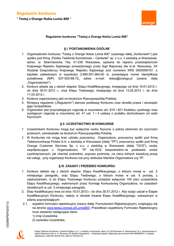 Regulamin konkursu " Testuj z Orange Nokia Lumia 800 ” Regulamin konkursu "Testuj z Orange Nokia Lumia 800” § I. POSTANOWIENIA OGÓLNE 1. Organizatorem konkursu "Testuj z Orange Nokia Lumia 800” (zwanego dalej „Konkursem”) jest spółka pod firmą „Polska Telefonia Komórkowa – Centertel” sp. z o.o. z siedzibą w Warszawie, adres: ul. Skierniewicka 10a, 01-230 Warszawa, wpisana do rejestru przedsiębiorców Krajowego Rejestru Sądowego prowadzonego przez Sąd Rejonowy dla m.st. Warszawy, XII Wydział Gospodarczy Krajowego Rejestru Sądowego pod numerem KRS 0000006107, o kapitale zakładowym w wysokości 2.690.501.964,00 zł, posiadająca numer identyfikacji podatkowej (NIP) 527-020-68-72, adres e-mail: [email protected] (zwana dalej „Organizatorem”) 2. Konkurs składa się z dwóch etapów: Etapu Kwalifikacyjnego, trwającego od dnia 19.01.2012 r. do dnia 30.01.2012 r., oraz Etapu Testowego, trwającego od dnia 13.02.2012 r. do dnia 11.03.2012 r. 3. Konkurs organizowany jest na terytorium Rzeczpospolitej Polskiej. 4. Niniejszy regulamin („Regulamin”) stanowi podstawę Konkursu oraz określa prawa i obowiązki jego Uczestników. 5. Organizator jest przyrzekającym nagrodę w rozumieniu art. 919 i 921 Kodeksu cywilnego oraz wydającym nagrodę w rozumieniu art. 41 ust. 1 i 4 ustawy o podatku dochodowym od osób fizycznych. § II. UCZESTNICTWO W KONKURSIE 1. Uczestnikami Konkursu mogą być wyłącznie osoby fizyczne o pełnej zdolności do czynności prawnych, zamieszkałe na terytorium Rzeczpospolitej Polskiej. 2. W Konkursie nie mogą brać udziału pracownicy Organizatora, pracownicy spółki pod firmą Telekomunikacja Polska S.A. z siedzibą w Warszawie (dalej "TP"), pracownicy spółki pod firmą Orange Customer Services Sp. z o.o. z siedzibą w Warszawie (dalej "OCS"), osoby współpracujące z Organizatorem, TP lub OCS bezpośrednio na podstawie umów cywilnoprawnych, jak również pośrednio, poprzez podmioty, na rzecz których świadczą pracę lub usługi, przy organizacji Konkursu lub przy obsłudze klientów Organizatora czy TP. OGSM/PDF03/0112 § III. ZASADY I PRZEBIEG KONKURSU 1. Konkurs składa się z dwóch etapów: Etapu Kwalifikacyjnego, o którym mowa w ust. 2 niniejszego paragrafu, oraz Etapu Testowego, o którym mowa w ust. 5 poniżej, z zastrzeżeniem, iż do Etapu Testowego Konkursu przejdzie wyłącznie 100 (stu) uczestników Etapu Kwalifikacyjnego, wyłonionych przez Komisję Konkursową Organizatora, na zasadach określonych w ust. 3 niniejszego paragrafu. 2. Etap Kwalifikacyjny trwa od dnia 19.01.2012 r. do dnia 30.01.2012 r. Aby wziąć udział w Etapie Kwalifikacyjnym Konkursu, należy w okresie trwania Etapu Kwalifikacyjnego, wskazanym w zdaniu poprzedzającym: 2.1. wypełnić formularz rejestracyjny (zwany dalej: Formularzem Rejestracyjnym), znajdujący się na stronie www.testuj.orange.pl/Lumia800 .Prawidłowo wypełniony Formularz Rejestracyjny musi zawierać następujące dane: 1) imię Uczestnika 2) nazwisko Uczestnika, Polska Telefonia Komórkowa Centertel Spółka z o.o.” z siedzibą w Warszawie, adres: 01-230 Warszawa ul. Skierniewicka 10 a, zarejestrowana w Sądzie Rejonowym dla m. st. Warszawy XII Wydział Gospodarczy – Krajowego Rejestru Sądowego pod numerem KRS 0000006107, o kapitale zakładowym 2.690.501.964,00 PLN, (NIP 527-020-68-72) OGSM/PDF03/0112 3) numer telefonu 4) adres e-mail, 5) PESEL Uczestnika 6) adres do wysyłki telefonu, w przypadku zakwalifikowania się do Etapu Testowego (miasto, kod pocztowy, ulica, numer domu, numer mieszkania (jeśli jest)), 7) odpowiedź na pytanie: „Jaki system operacyjny zastosowano w telefonie Nokia Lumia 800?” (do wyboru opcje: Android albo Symbian albo Windows Phone, przy czym tylko jedna z ww. odpowiedzi jest prawidłowa), 8) odpowiedź na pytanie „Dlaczego to właśnie Ty powinieneś testować telefon Nokia Lumia 800?” Wypełniając Formularz Rejestracyjny, o którym mowa powyżej, uczestnik ma również możliwość odpowiedzieć na dobrowolne pytanie, które brzmi: „Czy polecił(a)by Pan(i) usługi sieci Orange innej osobie, która dopiero zastanawia się nad wyborem operatora telefonii komórkowej? Proszę skorzystać z ocen od 1 do 5, gdzie 1 oznacza „zdecydowanie odradzał(a)bym” a 5 „zdecydowanie polecał(a)bym””. Udzielenie odpowiedzi na pytanie, o którym mowa w zdaniu poprzednim jest dobrowolne i w żaden sposób nie warunkuje uczestnictwa w Konkursie. 2.2. dokonać akceptacji (poprzez zaznaczenie właściwego checkboxa umieszczonego pod Formularzem Rejestracyjnym na stronie www.testuj.orange.pl/Lumia800) regulaminu Konkursu "Testuj z Orange Nokia Lumia 800”; 2.3. Zadaniem uczestników Etapu Kwalifikacyjnego Konkursu będzie udzielenie prawidlowych odpowiedzi (poprzez dokonanie wyboru jednej z trzech podanych opcji odpowiedzi), na pytanie: a) „Jaki system operacyjny zastosowano w telefonie Nokia Lumia 800?” (do wyboru opcje: Android albo Symbian albo Windows Phone, przy czym tylko jedna z ww. odpowiedzi jest prawidłowa), oraz udzielenie odpowiedzi (poprzez uzupełnienie jednego z pól Formularza Rejstracyjnego), w jak najbardziej oryginalny i kreatywny sposób, na konkursowe pytanie, które brzmi: „Dlaczego to właśnie Ty powinieneś testować telefon Nokia Lumia 800?” 3. Spośród osób, które poprawnie wypełnią Formularz Rejestracyjny, o którym mowa w ust. 2.1 powyżej, Komisja Konkursowa Organizatora wyłoni 100 (stu) Uczestników, którzy udzielili poprawnych odpowiedzi na pytanie wskazane w ust. 2.3 pkt a) powyżej, oraz zdaniem Komisji udzielili najbardziej oryginalnej i kreatywnej odpowiedzi na pytanie konkursowe, które brzmi: „Dlaczego to właśnie Ty powinieneś testować telefon Nokia Lumia 800?”, a którzy to Uczestnicy przejdą do Etapu Testowego Konkursu, o którym mowa w ust. 5 poniżej i staną przed szansą wygrania nagrody, o której mowa w § IV ust. 2 Regulaminu. 4. Osoby, które zostaną zakwalifikowane p