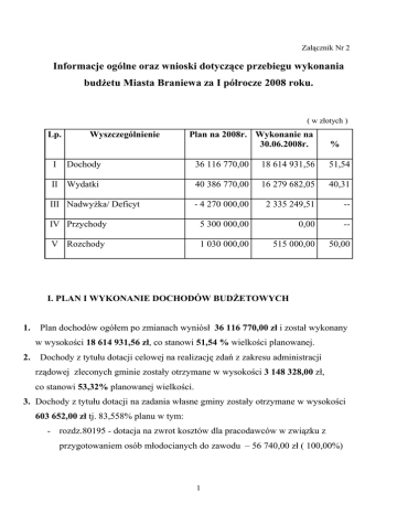 Załącznik Nr 2 Informacje ogólne oraz wnioski dotyczące przebiegu wykonania budżetu Miasta Braniewa za I półrocze 2008 roku. ( w złotych ) Lp. I Wyszczególnienie Plan na 2008r. Wykonanie na 30.06.2008r. % Dochody 36 116 770,00 18 614 931,56 51,54 II Wydatki 40 386 770,00 16 279 682,05 40,31 III Nadwyżka/ Deficyt - 4 270 000,00 2 335 249,51 -- IV Przychody 5 300 000,00 0,00 -- V Rozchody 1 030 000,00 515 000,00 50,00 I. PLAN I WYKONANIE DOCHODÓW BUDŻETOWYCH 1. Plan dochodów ogółem po zmianach wyniósł 36 116 770,00 zł i został wykonany w wysokości 18 614 931,56 zł, co stanowi 51,54 % wielkości planowanej. 2. Dochody z tytułu dotacji celowej na realizację zdań z zakresu administracji rządowej zleconych gminie zostały otrzymane w wysokości 3 148 328,00 zł, co stanowi 53,32% planowanej wielkości. 3. Dochody z tytułu dotacji na zadania własne gminy zostały otrzymane w wysokości 603 652,00 zł tj. 83,558% planu w tym: - rozdz.80195 - dotacja na zwrot kosztów dla pracodawców w związku z przygotowaniem osób młodocianych do zawodu – 56 740,00 zł ( 100,00%) 1 - rozdz.80101- dotacja na dofinansowanie nauki jez. angielskiego – 54 694,00 zł ( 87,50% ) - rozdz.85214-dotacja na zasiłki i pomoc w naturze –133 858,00 zł ( 92,96% ) - rozdz.85295 - dotacja na dożywianie dzieci – 158 509,00 zł ( 87,94% ) - rozdz.85219 - dotacja na utrzymanie MOPS – 107 162,00 zł ( 57,50% ) - rozdz.85415 - dotacja na stypendia dla uczniów – 92 689,00 zł (100,00%) 4. Dochody z tytułu dotacji w związku z realizacją zadań wykonywanych na podstawie zawartych porozumień między jednostkami samorządu terytorialnego zostały wykonane w wysokości 194 414,00 zł , co stanowi 54,60% planu w tym: - dotacja otrzymana od innych jednostek samorządu terytorialnego jako zwrot kosztów uczęszczania dzieci z terenu gminy do przedszkoli na terenie Miasta Braniewa ( rozdz. 80104 ): a) Gmina Braniewo - 69 738,00 zł ( 61,55 % planu ), b) Gmina Frombork – 5 888,00 zł ( 47,92% planu ), c) Gmina Płoskinia - 10 752,00 zł ( 50,00% planu), d) Gmina Pieniężno – 1 536,00 zł - dotacja z Powiatu Braniewskiego na utrzymanie dróg powiatowych (rozdz. 60014) – plan 205 000,00 zł , wykonanie 102 500 zł ( 50,00 % ) - dotacja z Powiatu Braniewskiego – wykonywanie zadań z zakresu biblioteki powiatowej - 4 000,00 zł ( 100,00 % ) 5. Dochody z tytułu dotacji otrzymanej w ramach zawartych porozumień z organami administracji rządowej: - dotacja od Wojewody Warmińsko- Mazurskiego na utrzymanie cmentarza wojennego ( rozdz.71035) - 15 000,00 zł (100,00%) 6. Subwencja ogólna została otrzymana w wysokości 6 946 218,00 zł tj. 60,00 % . 7. Udziały w podatkach stanowiących dochód budżetu gminy: a) w podatku dochodowym od osób fizycznych w wysokości 3 803 334,00 zł, co stanowi 46,47 % wielkości planowanej, 2 b) w podatku dochodowym od osób prawnych w wysokości 77 971,82 tj. 38,99% planu. 8. Dochody własne wykonane zostały w wysokości 7 468 135,80 zł, tj. 44,15 % planu. DOCHODY WEDŁUG DZIAŁÓW Dział 600 Transport i łączność W dziale tym występują dochody z tytułu dotacji od Powiatu Braniewskiego na podstawie zawartego porozumienia. Środki przeznaczone są na utrzymanie ulic powiatowych na terenie miasta. Dotacja planowana - 205 000 zł , wykonanie wynosi 102 500 zł. Dział 700 Gospodarka mieszkaniowa Ujęte są tu dochody budżetu związane z gospodarowaniem mieniem komunalnym. W stosunku do wielkości planowanej oszacowanej na kwotę 2 080 740 zł, wykonanie wyniosło 794 640,76 zł tj. 38,19 % , w tym: a) opłaty za wieczyste użytkowanie – 218 083,46 zł ( 54,68% ), b) dochody z najmu i dzierżawy – 125 141,00 zł ( 60,69% ), c) opłaty za przekształcenie prawa użytkowania wieczystego w prawo własności – 67 155,08 zł ( 51,69%), d) sprzedaż składników majątkowych 317 466,31 zł ( 27,02 % ), e) wpływy z czynszy lokali użytkowych – 66 070,91 ( 38,64%), f) zwrot kosztów sądowych przez firmę MIR Trade sp. z o.o dotyczących 2007r. – 724,00 zł. Dział 710 Działalność usługowa Na mocy porozumienia z Wojewodą Warmińsko - Mazurskim w sprawie powierzenia Gminie Miasto Braniewo prowadzenia spraw z zakresu administracji rządowej, dotyczących utrzymania grobów i cmentarzy wojennych 3 otrzymało dotację na utrzymanie Cmentarza Wojennego. Dotacja wpłynęła w 100% wielkości planowanej tj. 15 000 zł. Dział 750 Administracja publiczna Planowane dochody w tym dziale oszacowane były na kwotę 231 870,00 zł. Wykonanie wyniosło 124 346,60 zł tj. 53,64% w tym : - rozdział 75011 urzędy wojewódzkie – dotacja na zadania zlecone – 79 340 zł tj. 54,72% planu oraz wpływy w wysokości 5% za wydane dowody osobiste- plan – 1 500,00 zł, wykonanie 1 237,74 zł tj.82,52% ) - rozdział 75023 urząd miasta – dochody własne planowane są w wysokości 85 366 zł zł, wykonanie wyniosło 43 768,92 zł tj. 51,27 %. Dział 751 Urzędy naczelnych organów władzy państwowej, kontroli i ochrony prawa oraz sądownictwa Występuje tu dotacja na zadania zlecone tj. na aktualizację rejestru wyborców. Plan 2 602,00 zł , wykonanie – 1 366,66 zł tj. 52,50%. Dział 754 Bezpieczeństwo publiczne i ochrona przeciwpożarowa Na planowaną kwotę dochodów w wysokości 4 000,00 zł wykonanie na półrocze wyniosło 900,00 zł tj. 22,50% w tym: - rozdział 75414- obrona cywilna - plan 500 zł jako dotacja na zadania zlecone- wykonanie 0,00 zł - rozdział 75416 - straż miejska – grzywny , kary , mandaty – wykonanie 900,00 z tj. 25,71% ( plan 3 500 zł) Dział 756 Dochody od osób prawnych , od osób fizycznych i od innych jednostek nieposiadających osobowości prawnej oraz wydatki związane z ich poborem 4 Dochody ujęte w tym dziale dotyczą głównie dochodów podatkowych budżetu miasta tj. podatków i opłat lokalnych realizowanych bezpośrednio przez Urząd Miasta oraz podatków realizowanych przez urzędy skarbowe, takich jak podatek d