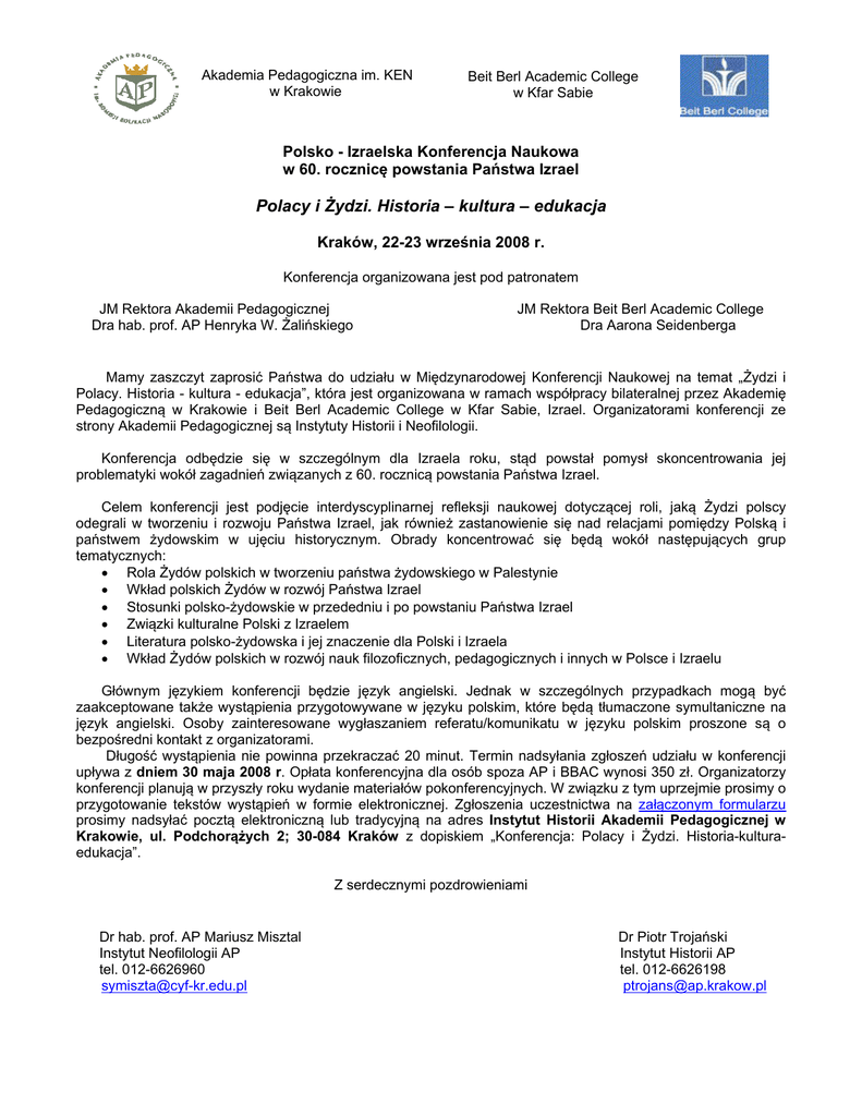 Akademia Pedagogiczna im. KEN w Krakowie Beit Berl Academic College w Kfar Sabie Polsko - Izraelska Konferencja Naukowa w 60. rocznicę powstania Państwa Izrael Polacy i Żydzi. Historia – kultura – edukacja Kraków, 22-23 września 2008 r. Konferencja organizowana jest pod patronatem JM Rektora Akademii Pedagogicznej Dra hab. prof. AP Henryka W. Żalińskiego JM Rektora Beit Berl Academic College Dra Aarona Seidenberga Mamy zaszczyt zaprosić Państwa do udziału w Międzynarodowej Konferencji Naukowej na temat „Żydzi i Polacy. Historia - kultura - edukacja”, która jest organizowana w ramach współpracy bilateralnej przez Akademię Pedagogiczną w Krakowie i Beit Berl Academic College w Kfar Sabie, Izrael. Organizatorami konferencji ze strony Akademii Pedagogicznej są Instytuty Historii i Neofilologii. Konferencja odbędzie się w szczególnym dla Izraela roku, stąd powstał pomysł skoncentrowania jej problematyki wokół zagadnień związanych z 60. rocznicą powstania Państwa Izrael. Celem konferencji jest podjęcie interdyscyplinarnej refleksji naukowej dotyczącej roli, jaką Żydzi polscy odegrali w tworzeniu i rozwoju Państwa Izrael, jak również zastanowienie się nad relacjami pomiędzy Polską i państwem żydowskim w ujęciu historycznym. Obrady koncentrować się będą wokół następujących grup tematycznych: • Rola Żydów polskich w tworzeniu państwa żydowskiego w Palestynie • Wkład polskich Żydów w rozwój Państwa Izrael • Stosunki polsko-żydowskie w przededniu i po powstaniu Państwa Izrael • Związki kulturalne Polski z Izraelem • Literatura polsko-żydowska i jej znaczenie dla Polski i Izraela • Wkład Żydów polskich w rozwój nauk filozoficznych, pedagogicznych i innych w Polsce i Izraelu Głównym językiem konferencji będzie język angielski. Jednak w szczególnych przypadkach mogą być zaakceptowane także wystąpienia przygotowywane w języku polskim, które będą tłumaczone symultaniczne na język angielski. Osoby zainteresowane wygłaszaniem referatu/komunikatu w języku polskim proszone są o bezpośredni kontakt z organizatorami. Długość wystąpienia nie powinna przekraczać 20 minut. Termin nadsyłania zgłoszeń udziału w konferencji upływa z dniem 30 maja 2008 r. Opłata konferencyjna dla osób spoza AP i BBAC wynosi 350 zł. Organizatorzy konferencji planują w przyszły roku wydanie materiałów pokonferencyjnych. W związku z tym uprzejmie prosimy o przygotowanie tekstów wystąpień w formie elektronicznej. Zgłoszenia uczestnictwa na załączonym formularzu prosimy nadsyłać pocztą elektroniczną lub tradycyjną na adres Instytut Historii Akademii Pedagogicznej w Krakowie, ul. Podchorążych 2; 30-084 Kraków z dopiskiem „Konferencja: Polacy i Żydzi. Historia-kulturaedukacja”. Z serdecznymi pozdrowieniami Dr hab. prof. AP Mariusz Misztal Instytut Neofilologii AP tel. 012-6626960 [email protected] Dr Piotr Trojański Instytut Historii AP tel. 012-6626198 [email protected]