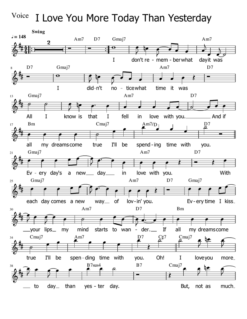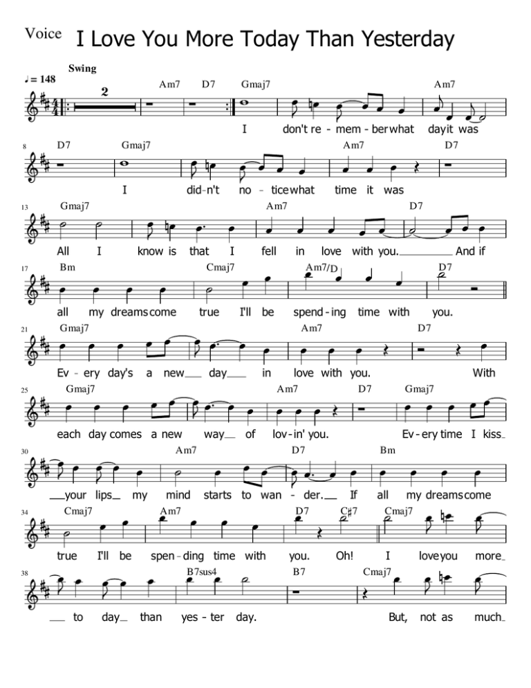 Voice I Love You More Today Than Yesterday Swing = 148 Am7 2 4 4 D7 8 D7 All I don't re know is no tice what that I fell in time it was a love with you. D7 I'll be new spend ing time with D7 in way of your lips my mind Cmaj7 Ev ery time I kiss der. If I'll be spen ding time with B7sus4 38 to day you. B7 all C♯7 Gmaj7 Bm D7 D7 D7 starts to wan Am7 Oh! ter day. Cmaj7 I more Cmaj7 love you But, not as yes my dreams come than With lov in' you. Am7 love with you. Am7 30 true you. day each day comes a new And if Gmaj7 true ery day's Am7 Am7/ D Gmaj7 Ev my dreams come D7 D7 Cmaj7 dayit was all mem ber what did n't Bm 34 I Am7 25 Gmaj7 21 Am7 I 17 Am7 Gmaj7 13 Gmaj7 much Am B7sus4 42 as to mor to day A7 50 mor row. a day now. Be like ours a way on your way. that grows ev er strong feel 70 to day er and I as to to day the same way, ter mor too! Oh! I love you B7 than yes ter day. But, more But, not as much I love you be row day. D7 B7 78 yes for love al ways will 74 than thank the Lord I know you don't need we true. Cu pid D7 row's date means I much 66 Am7 not as D7 62 D7 Am7 you mor To Gmaj7 more dar ling spring time's just 2 But, Am7 love you to I yes ter day. 54 58 than as row Em7 46 B7 on ly half as more much A7 82 as to day, Gmaj7 Gmaj7 Ev ery time I love day, Gmaj7 day, ery day's Ev Ev ery time I love Ev ery time I kiss ery way's ya. a new a new Ev ery day's a new D7 ya. Ev ery way's a new D7 How I love ya. Ev ery day's a new D7 Ev ery time I love ya. Am7 ya. Am7 D7 Gmaj7 D7 Oh! Ev way. row Am7 98 106 Am7 day, 102 mor Am7 way, 94 Am7 86 90 Ev ery day's D7 Rit Ev ery time I kiss a new G ya. 3