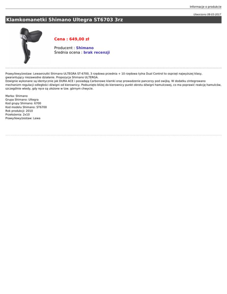 Informacje o produkcie Utworzono 08-03-2017 Klamkomanetki Shimano Ultegra ST6703 3rz Cena : 649,00 zł Producent : Shimano Średnia ocena : brak recenzji Prawy/lewy/zestaw: Lewaerzutki Shimano ULTEGRA ST-6700, 3 rzędowa przednia + 10 rzędowa tylna Dual Control to osprzęt najwyższej klasy, gwarantujący niezawodne działanie. Propozycja Shimano ULTERGA. Dzwignie wykonane są identycznie jak DURA ACE i posiadają Carbonowe klamki oraz prowadzenie pancerzy pod owijką. W dodatku zintegrowano mechanizm regulacji odległości dźwigni od kierownicy. Podsunięto bliżej do kierownicy punkt obrotu dźwigni hamulcowej, co ma poprawić reakcję hamulców, szczególnie wtedy, gdy ręce są ułożone w tzw. górnym chwycie. Marka: Shimano Grupa Shimano: Ultegra Kod grupy Shimano: 6700 Kod modelu Shimano: ST6700 Rok produkcji: 2010 Przełożenia: 2x10 Prawy/lewy/zestaw: Lewa