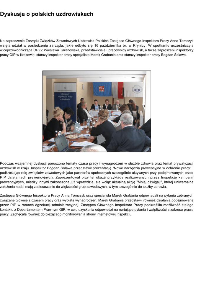 Dyskusja o polskich uzdrowiskach Na zaproszenie Zarządu Związków Zawodowych Uzdrowisk Polskich Zastępca Głównego Inspektora Pracy Anna Tomczyk wzięła udział w posiedzeniu zarządu, jakie odbyło się 16 października br. w Krynicy. W spotkaniu uczestniczyła wiceprzewodnicząca OPZZ Wiesława Taranowska, przedstawiciele i pracownicy uzdrowisk, a także zaproszeni inspektorzy pracy OIP w Krakowie: starszy inspektor pracy specjalista Marek Grabania oraz starszy inspektor pracy Bogdan Solawa. Podczas wzajemnej dyskusji poruszono tematy czasu pracy i wynagrodzeń w służbie zdrowia oraz temat prywatyzacji uzdrowisk w kraju. Inspektor Bogdan Solawa przedstawił prezentację "Nowe narzędzia prewencyjne w ochronie pracy” , podkreślając rolę związków zawodowych jako partnerów społecznych szczególnie aktywnych przy podejmowanych przez PIP działaniach prewencyjnych. Zaprezentował przy tej okazji przykłady realizowanych przez Inspekcję kampanii prewencyjnych, między innymi zakończoną już wprawdzie, ale wciąż aktualną akcję "Mniej dźwigaj!", której uniwersalne założenia nadal mają zastosowanie do większości grup zawodowych, w tym szczególnie do służby zdrowia. Zastępca Głównego Inspektora Pracy Anna Tomczyk oraz specjalista Marek Grabania odpowiadali na pytania zebranych związane głównie z czasem pracy oraz wypłatą wynagrodzeń. Marek Grabania przedstawił również działania podejmowane przez PIP w ramach egzekucji administracyjnej. Zastępca Głównego Inspektora Pracy podkreśliła możliwość stałego kontaktu z Departamentem Prawnym GIP, w celu uzyskania odpowiedzi na nurtujące pytania i wątpliwości z zakresu prawa pracy. Zachęcała również do bieżącego monitorowania strony internetowej Inspekcji.