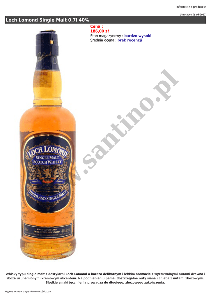 Informacje o produkcie Utworzono 08-03-2017 Loch Lomond Single Malt 0.7l 40% Cena : 186,00 zł w w w .s an t in o. pl Stan magazynowy : bardzo wysoki Średnia ocena : brak recenzji Whisky typu single malt z destylarni Loch Lomond o bardzo delikatnym i lekkim aromacie z wyczuwalnymi nutami drewna i zboża uzupełnionymi kremowym akcentem. Na podniebieniu pełna, dostrzegalne nuty siana i chleba z nutami zbożowymi. Słodkie smaki jęczmienia prowadzą do długiego, zbożowego zakończenia. Wygenerowano w programie www.oscGold.com Ciekawostką dotyczącą whisky Loch Lomond jest fakt, iż była ona ulubionym trunkiem kapitana Baryłki oraz Milusia-wiernego psa Tintina, bohaterów komiksowej serii autorstwa belgijskiego artysty Georges'a Remi - "Przygody Tintina". Destylarnia Loch Lomond znajduje się w reginie Highland w mieście Alexandria w hrabstwie West Dunbartonshire niedaleko jednego z najpiękniejszych jezior w Szkocji - Loch Lomond. Została założona w 1965 roku, więc jest stosunkowo młoda. Przez pewien czas używała nazwy Inchmurrin. w w w .s an t in o. pl Wyróżniającym elementem destylarni jest posiadanie różnej wielkości oraz różnych kształtów alembików, dzięki czemu wytwórnia ma możliwość otrzymania wielu odmiennych destylatów poprzez różnorodne łączenie alembików.