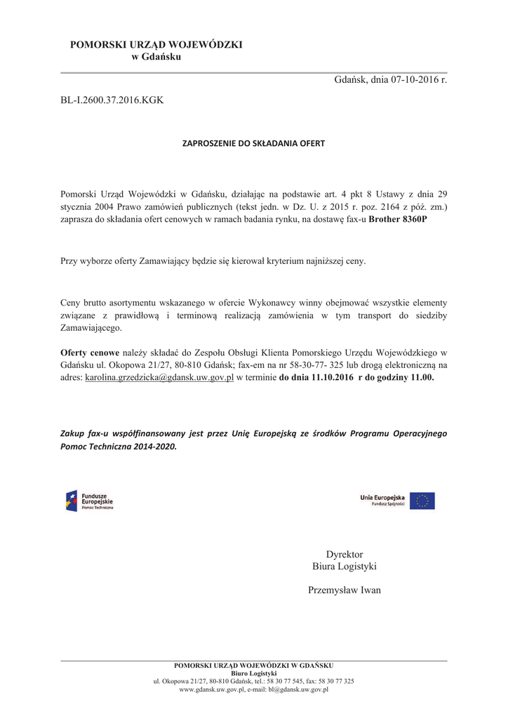 POMORSKI URZĄD WOJEWÓDZKI w Gdańsku Gdańsk, dnia 07-10-2016 r. BL-I.2600.37.2016.KGK ZAPROSZENIE DO SKŁADANIA OFERT Pomorski Urząd Wojewódzki w Gdańsku, działając na podstawie art. 4 pkt 8 Ustawy z dnia 29 stycznia 2004 Prawo zamówień publicznych (tekst jedn. w Dz. U. z 2015 r. poz. 2164 z póź. zm.) zaprasza do składania ofert cenowych w ramach badania rynku, na dostawę fax-u Brother 8360P Przy wyborze oferty Zamawiający będzie się kierował kryterium najniższej ceny. Ceny brutto asortymentu wskazanego w ofercie Wykonawcy winny obejmować wszystkie elementy związane z prawidłową i terminową realizacją zamówienia w tym transport do siedziby Zamawiającego. Oferty cenowe należy składać do Zespołu Obsługi Klienta Pomorskiego Urzędu Wojewódzkiego w Gdańsku ul. Okopowa 21/27, 80-810 Gdańsk; fax-em na nr 58-30-77- 325 lub drogą elektroniczną na adres: [email protected] w terminie do dnia 11.10.2016 r do godziny 11.00. Zakup fax-u współfinansowany jest przez Unię Europejską ze środków Programu Operacyjnego Pomoc Techniczna 2014-2020. Dyrektor Biura Logistyki Przemysław Iwan POMORSKI URZĄD WOJEWÓDZKI W GDAŃSKU Biuro Logistyki ul. Okopowa 21/27, 80-810 Gdańsk, tel.: 58 30 77 545, fax: 58 30 77 325 www.gdansk.uw.gov.pl, e-mail: [email protected]