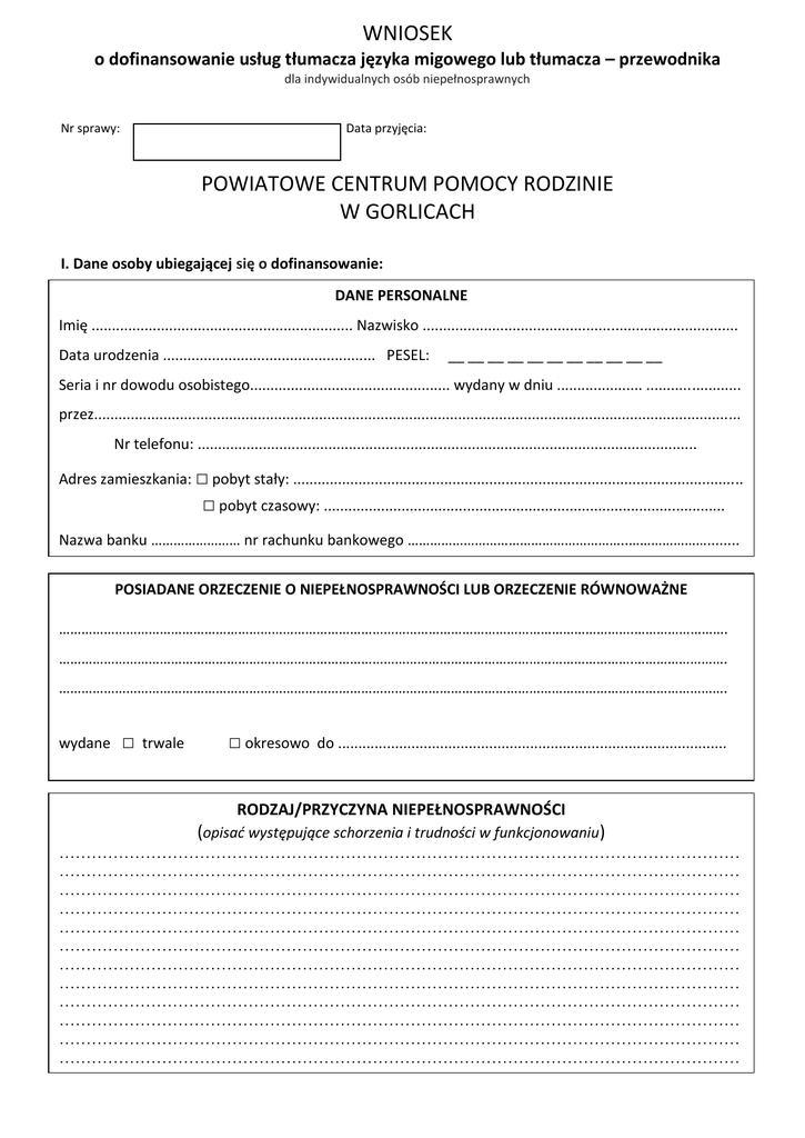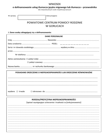 WNIOSEK o dofinansowanie usług tłumacza języka migowego lub tłumacza – przewodnika dla indywidualnych osób niepełnosprawnych Nr sprawy: Data przyjęcia: POWIATOWE CENTRUM POMOCY RODZINIE W GORLICACH I. Dane osoby ubiegającej się o dofinansowanie: DANE PERSONALNE Imię ................................................................ Nazwisko ............................................................................. Data urodzenia .................................................... PESEL: __ __ __ __ __ __ __ __ __ __ __ Seria i nr dowodu osobistego................................................. wydany w dniu ..................... ....................... przez.............................................................................................................................................................. Nr telefonu: .......................................................................................................................... Adres zamieszkania: □ pobyt stały: .............................................................................................................. □ pobyt czasowy: .................................................................................................. Nazwa banku …………………… nr rachunku bankowego …………………………………………………..…………………........ POSIADANE ORZECZENIE O NIEPEŁNOSPRAWNOŚCI LUB ORZECZENIE RÓWNOWAŻNE ……………………………………………………………………………………………………………………………………….……………………. ………. ……………………………………………………………………………………………………………………………………….……………………. ……………………………………………………………………………………………………………………………………….……………………. wydane □ trwale □ okresowo do ............................................................................................... RODZAJ/PRZYCZYNA NIEPEŁNOSPRAWNOŚCI (opisać występujące schorzenia i trudności w funkcjonowaniu) ……………………………………………………………………………………………………………… ……………………………………………………………………………………………………………… ……………………………………………………………………………………………………………… ……………………………………………………………………………………………………………… ……………………………………………………………………………………………………………… ……………………………………………………………………………………………………………… ……………………………………………………………………………………………………………… ……………………………………………………………………………………………………………… ……………………………………………………………………………………………………………… ……………………………………………………………………………………………………………… ……………………………………………………………………………………………………………… ……………………………………………………………………………………………………………… Dane: □ rodzica / opiekuna prawnego dziecka niepełnosprawnego □ opiekuna prawnego dorosłej osoby niepełnosprawnej: Imię ….........…….............................................……… Nazwisko …………………………………………………………………...... PESEL: __ __ __ __ __ __ __ __ __ __ __ seria i nr dowodu osobistego ...........……………………….......... wydany przez ……............................................. .......................……………… …………………………… nr telefonu: ……......................................................................... Miejsce zamieszkania: ..........…………………….................................……............................................................... ustanowiony Opiekunem/Pełnomocnikiem ...............................................................……................................ postanowieniem Sądu Rejonowego ............................. z dn. ........................sygn.akt ...............…… na mocy pełnomocnictwa potwierdzonego przez Notariusza .....................................................................................… z dn. .................................................. repet. nr ................................................................................................ II. Cel dofinansowania: L.p. Opis usługi Ilość godzin Koszt za godzinę Łączny koszt usługi* Razem całkowity koszt Słownie całkowity koszt:................................................................................. *) Wysokość dofinansowania usług tłumacza języka migowego lub tłumacza– przewodnika nie może być wyższa niż 2% przeciętnego wynagrodzenia za godzinę jej świadczenia Przewidywany termin realizacji zadania....................................................................................................... Miejsce realizacji zadania ……………......................................................................................................... Uzasadnienie wniosku.................................................................................................................................... 