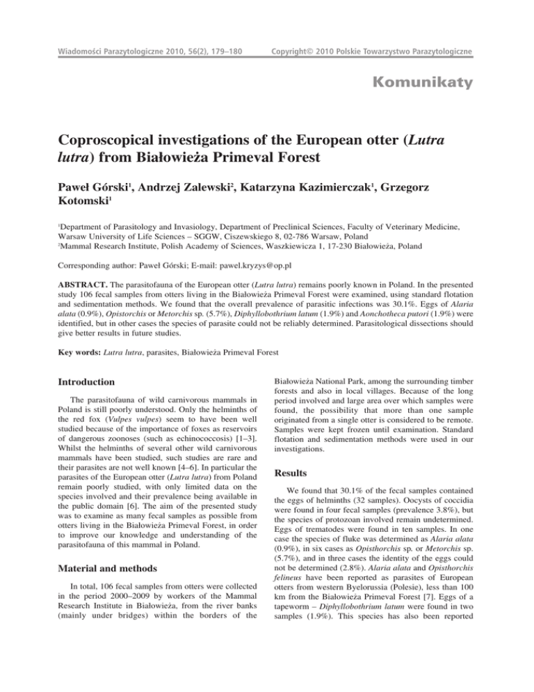 Wiadomoœci Parazytologiczne 2010, 56(2), 179–180 Copyright© 2010 Polskie Towarzystwo Parazytologiczne Komunikaty Coproscopical investigations of the European otter (Lutra lutra) from Białowieża Primeval Forest Paweł Górski1, Andrzej Zalewski2, Katarzyna Kazimierczak1, Grzegorz Kotomski1 Department of Parasitology and Invasiology, Department of Preclinical Sciences, Faculty of Veterinary Medicine, Warsaw University of Life Sciences – SGGW, Ciszewskiego 8, 02-786 Warsaw, Poland 2 Mammal Research Institute, Polish Academy of Sciences, Waszkiewicza 1, 17-230 Białowieża, Poland 1 Corresponding author: Paweł Górski; E-mail: [email protected] ABSTRACT. The parasitofauna of the European otter (Lutra lutra) remains poorly known in Poland. In the presented study 106 fecal samples from otters living in the Białowieża Primeval Forest were examined, using standard flotation and sedimentation methods. We found that the overall prevalence of parasitic infections was 30.1%. Eggs of Alaria alata (0.9%), Opistorchis or Metorchis sp. (5.7%), Diphyllobothrium latum (1.9%) and Aonchotheca putori (1.9%) were identified, but in other cases the species of parasite could not be reliably determined. Parasitological dissections should give better results in future studies. Key words: Lutra lutra, parasites, Białowieża Primeval Forest Introduction The parasitofauna of wild carnivorous mammals in Poland is still poorly understood. Only the helminths of the red fox (Vulpes vulpes) seem to have been well studied because of the importance of foxes as reservoirs of dangerous zoonoses (such as echinococcosis) [1–3]. Whilst the helminths of several other wild carnivorous mammals have been studied, such studies are rare and their parasites are not well known [4–6]. In particular the parasites of the European otter (Lutra lutra) from Poland remain poorly studied, with only limited data on the species involved and their prevalence being available in the public domain [6]. The aim of the presented study was to examine as many fecal samples as possible from otters living in the Białowieża Primeval Forest, in order to improve our knowledge and understanding of the parasitofauna of this mammal in Poland. Material and methods In total, 106 fecal samples from otters were collected in the period 2000–2009 by workers of the Mammal Research Institute in Białowieża, from the river banks (mainly under bridges) within the borders of the Białowieża National Park, among the surrounding timber forests and also in local villages. Because of the long period involved and large area over which samples were found, the possibility that more than one sample originated from a single otter is considered to be remote. Samples were kept frozen until examination. Standard flotation and sedimentation methods were used in our investigations. Results We found that 30.1% of the fecal samples contained the eggs of helminths (32 samples). Oocysts of coccidia were found in four fecal samples (prevalence 3.8%), but the species of protozoan involved remain undetermined. Eggs of trematodes were found in ten samples. In one case the species of fluke was determined as Alaria alata (0.9%), in six cases as Opisthorchis sp. or Metorchis sp. (5.7%), and in three cases the identity of the eggs could not be determined (2.8%). Alaria alata and Opisthorchis felineus have been reported as parasites of European otters from western Byelorussia (Polesie), less than 100 km from the Białowieża Primeval Forest [7]. Eggs of a tapeworm – Diphyllobothrium latum were found in two samples (1.9%). This species has also been reported 180 previously from otters [8,6]. The intermediate hosts of all the identified trematodes and tapeworms are fish or amphibians – all important components of otter’s diet [9]. Nematode infections showed the highest prevalence (15% – sixteen cases) in the examined material, but only one species – Aonchotheca (syn. Capillaria) putorii was identified in a single sample, and the rest remain unidentified (there are several possibilities as to the species that may be involved). However some of these parasitic helminths were found for the first time from otters in Poland. In order to improve further our knowledge and understanding of the parasites of this host, the next step must be to dissect freshly killed animals to recover the adult worms. References [1] Ramisz A., Eckert J., Balicka-Ramisz A., Grupiński T., Pilarczyk B., Król-Pośpieszny A., Słowikowski P. 1997. Występowanie Echinococcus multilocularis u lisów w zachodniej Polsce. Medycyna Weterynaryjna 53: 340-342. [2] Balicka-Ramisz A., Ramisz A., Pilarczyk B., Bieńko R. 2003. Parazytofauna przewodu pokarmowego lisów wolno żyjących na terenie Polski zachodniej. Medycyna Weterynaryjna 59: 922-925. P. Górski et al. [3] Gawor J., Malczewski A., Rocki B., Malczewska M., Borecka A. 2004. Badania nad występowaniem tasiemca Echinococcus multilocularis u lisów rudych w Polsce. Medycyna Weterynaryjna 60: 489-491. [4] Malczewski A. 1964. Przyczynek do znajomości helmintofauny Mustelidae w Polsce. Wiadomości Parazytologiczne 10: 565-567. [5] Miniuk M. 1996. Przegląd pasożytów wybranych gatunków ssaków łownych i chronionych Puszczy Białowieskiej. Sylwan 2: 87-95. [6] Górski P., Zalewski A., Łakomy M. 2006. Parasites of carnivorous mammals in Białowieża Primeval Forest. Wiadomości Parazytologiczne 52: 49-53. [7] Shimalov V.V., Shimalov V.T., Shimalov A.V. 2000. Helminth fauna of otter (Lutra lutra Linnaeus, 1758) in Belorussian Polesie. Parasitology Research 86: 528. [8] Kontrimavichus V.L. 1985. Helminths of mustelids and trends in their evolution. Amerind Publishing Co. Pvt. Ltd. New Dehli Bombay Calcutta New York. [9] Jędrzejewska B., Jędrzejewski W. 2001. Ekologia zwierząt drapieżnych Puszczy Białowieskiej. Wydawnictwo Naukowe PWN, Warszawa. Wpłynęło 20 marca 2010 Zaakceptowano 30 kwietnia 2010