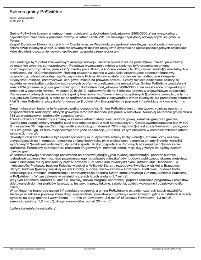 wzglêdu na wysoko¶æ dochodów bud¿etowych ogó³em w przeliczeniu na mieszkañca. Gmina Po¶wiêtne znalaz³a siê