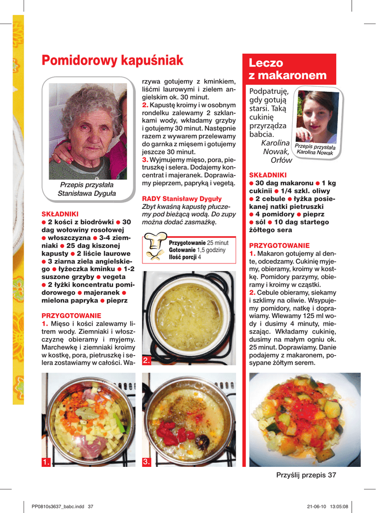 Pomidorowy kapuśniak Przepis przysłała Stanisława Dyguła SKŁADNIKI ● 2 kości z biodrówki ● 30 dag wołowiny rosołowej ● włoszczyzna ● 3-4 ziemniaki ● 25 dag kiszonej kapusty ● 2 liście laurowe ● 3 ziarna ziela angielskiego ● łyżeczka kminku ● 1-2 suszone grzyby ● vegeta ● 2 łyżki koncentratu pomidorowego ● majeranek ● mielona papryka ● pieprz rzywa gotujemy z kminkiem, liśćmi laurowymi i zielem angielskim ok. 30 minut. 2. Kapustę kroimy i w osobnym rondelku zalewamy 2 szklankami wody, wkładamy grzyby i gotujemy 30 minut. Następnie razem z wywarem przelewamy do garnka z mięsem i gotujemy jeszcze 30 minut. 3. Wyjmujemy mięso, pora, pietruszkę i selera. Dodajemy koncentrat i majeranek. Doprawiamy pieprzem, papryką i vegetą. RADY Stanisławy Dyguły Zbyt kwaśną kapustę płuczemy pod bieżącą wodą. Do zupy można dodać zasmażkę. Przygotowanie 25 minut Gotowanie 1,5 godziny Ilość porcji 4 PRZYGOTOWANIE 1. Mięso i kości zalewamy litrem wody. Ziemniaki i włoszczyznę obieramy i myjemy. Marchewkę i ziemniaki kroimy w kostkę, pora, pietruszkę i selera zostawiamy w całości. Wa- 2. 1. 3. Leczo z makaronem Podpatruję, gdy gotują starsi. Taką cukinię przyrządza babcia. Karolina Nowak, Orłów w Przepis przysłała Karolina Nowak SKŁADNIKI ● 30 dag makaronu ● 1 kg cukinii ● 1/4 szkl. oliwy ● 2 cebule ● łyżka posiekanej natki pietruszki ● 4 pomidory ● pieprz ● sól ● 10 dag startego żółtego sera PRZYGOTOWANIE 1. Makaron gotujemy al dente, odcedzamy. Cukinię myjemy, obieramy, kroimy w kostkę. Pomidory parzymy, obieramy i kroimy w cząstki. 2. Cebule obieramy, siekamy i szklimy na oliwie. Wsypujemy pomidory, natkę i doprawiamy. Wlewamy 125 ml wody i dusimy 4 minuty, mieszając. Wkładamy cukinię, dusimy na małym ogniu ok. 25 minut. Doprawiamy. Danie podajemy z makaronem, posypane żółtym serem. Przyślij przepis 37 PP0810s3637_babc.indd 37 21-06-10 13:05:08