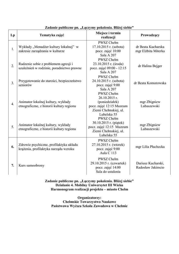 Zadanie publiczne pn. „Łączymy pokolenia. Bliżej siebie” Lp Tematyka zajęć 1. Wykłady „Menadżer kultury lokalnej” w zakresie zarządzania w kulturze 2. Radzenie sobie z problemem agresji i uzależnień w rodzinie, poradnictwo prawne 3. Przygotowanie do starości, bezpieczeństwo seniorów 4. Animator lokalnej kultury, wykłady etnograficzne, z historii kultury regionu 5. Animator lokalnej kultury, wykłady etnograficzne, z historii kultury regionu 6. Zdrowie psychiczne, profilaktyka układu krążenia, profilaktyka narządu wzroku 7. Kurs samoobrony Miejsce i termin realizacji PWSZ Chełm 17.10.2015 r. (sobota) pocz. zajęć 10:00 Sala A 207 PWSZ Chełm 23.10.2015 r. (środa) pocz. zajęć 09:00 - 12:15 Sala A 207 PWSZ Chełm 24.10.2015 r. (sobota) pocz. zajęć 9:00 Sala A 207 PWSZ Chełm 26.10.2015 r. (poniedziałek) pocz. zajęć 12:15 Muzeum Ziemi Chełmskiej, ul. Lubelska 55 PWSZ Chełm 30.10.2015 r. (piątek) pocz. zajęć 12:15 Muzeum Ziemi Chełmskiej, ul. Lubelska 55 PWSZ Chełm 27.10.2015 r. (wtorek) pocz. zajęć 9:00 Aula C 113 PWSZ Chełm 29.10.2015 r. (czwartek) pocz. zajęć 14:00 Sala do ustalenia Zadanie publiczne pn. „Łączymy pokolenia. Bliżej siebie” Działanie 4. Mobilny Uniwersytet III Wieku Harmonogram realizacji projektu – miasto Chełm Organizatorzy: Chełmskie Towarzystwo Naukowe Państwowa Wyższa Szkoła Zawodowa w Chełmie Prowadzący dr Beata Kucharska mgr Elżbita Miterka dr Halina Bejger dr Beata Komorowska mgr Zbigniew Lubaszewski mgr Zbigniew Lubaszewski mgr Lilia Płachecka Dariusz Kucharski, Radosław Jakimcio