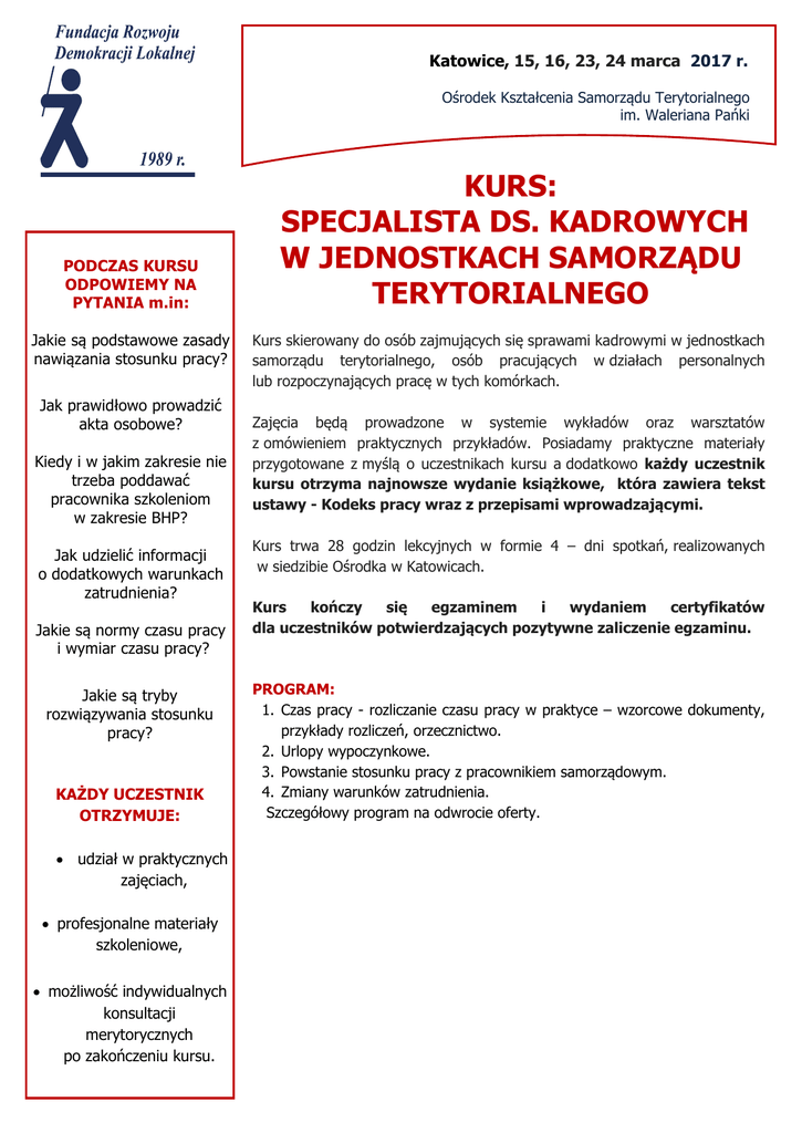 Rozwiązania informatyczne Katowice, 15, 16, 23, 24 marca 2017 r. Ośrodek Kształcenia Samorządu Terytorialnego im. Waleriana Pańki PODCZAS KURSU ODPOWIEMY NA PYTANIA m.in: Jakie są podstawowe zasady nawiązania stosunku pracy? Jak prawidłowo prowadzić akta osobowe? Kiedy i w jakim zakresie nie trzeba poddawać pracownika szkoleniom w zakresie BHP? Jak udzielić informacji o dodatkowych warunkach zatrudnienia? Jakie są normy czasu pracy i wymiar czasu pracy? Jakie są tryby rozwiązywania stosunku pracy? KAŻDY UCZESTNIK OTRZYMUJE: udział w praktycznych zajęciach, profesjonalne materiały szkoleniowe, możliwość indywidualnych konsultacji merytorycznych po zakończeniu kursu. KURS: SPECJALISTA DS. KADROWYCH W JEDNOSTKACH SAMORZĄDU TERYTORIALNEGO Kurs skierowany do osób zajmujących się sprawami kadrowymi w jednostkach samorządu terytorialnego, osób pracujących w działach personalnych lub rozpoczynających pracę w tych komórkach. Zajęcia będą prowadzone w systemie wykładów oraz warsztatów z omówieniem praktycznych przykładów. Posiadamy praktyczne materiały przygotowane z myślą o uczestnikach kursu a dodatkowo każdy uczestnik kursu otrzyma najnowsze wydanie książkowe, która zawiera tekst ustawy - Kodeks pracy wraz z przepisami wprowadzającymi. Kurs trwa 28 godzin lekcyjnych w formie 4 – dni spotkań, realizowanych w siedzibie Ośrodka w Katowicach. Kurs kończy się egzaminem i wydaniem certyfikatów dla uczestników potwierdzających pozytywne zaliczenie egzaminu. PROGRAM: 1. Czas pracy - rozliczanie czasu pracy w praktyce – wzorcowe dokumenty, przykłady rozliczeń, orzecznictwo. 2. Urlopy wypoczynkowe. 3. Powstanie stosunku pracy z pracownikiem samorządowym. 4. Zmiany warunków zatrudnienia. Szczegółowy program na odwrocie oferty. SZCZEGÓŁOWY PROGRAM KURSU Lp. DZIEŃ PIERWSZY Moduł Czas pracy rozliczanie czasu pracy w praktyce – wzorcowe dokumenty, przykłady rozliczeń, orzecznictwo Zagadnienia szczegółowe 1. Definicja czasu pracy -normy i wymiar czasu pracy. 2. Pozostawanie w dyspozycji pracodawcy – dyżur, czas podróży służbowej, czas trwania szkoleń, czas pracy pracowników mobilnych. 3. Stosowanie poszczególnych systemów i rozkładów czasu pracy oraz dopuszczalne okresy rozliczeniowe. 4. Zasady prawidłowego rozliczania czasu pracy w zależności od zastosowanego systemu, długości okresu zatrudnienia oraz wymiaru etatu pracy pracownika. 5. Praca w godzinach nadliczbowych w różnych systemach czasu pracy – ustalanie i rozliczanie z przykładami. 6. Godziny nadliczbowe pracowników zarządzających. 7. Dopuszczalność i zasady rekompensowania pracy w niedziele i święta. 8. Praca w dniach wolnych od pracy wynikających z przeciętnie pięciodniowego tygodnia pracy. 9. Zasady udzielania odpoczynku - dobowego i tygodniowego. 10. Nadgodziny i praca ponadwymiarowa pracowników niepełnoetatowych. 11. Zasady rekompensowania pracy w dni wolne od pracy. 12. Przerwy w pracy. 13. Prowadzenie dokumentacji dotyczącej czasu pracy pracowników. 14. Wzory pism dotyczących czasu pracy. 15. Tworzenie rozkładów czasu pracy. 16. Rozliczanie czasu pracy na wybranych przykładach – ćwiczenia. 17. Treść regulaminu pracy. 18. Orzecznictwo Sądu Najwyższego, stanowiska Państwowej Inspekcji Pracy oraz Ministerstwa Rodziny, Pracy i Polityki Społecznej. 19. Wykroczenia kwalifikowane przeciwko przepisom prawa pracy, w szczególności odpowiedzialność pracodawcy i osób kierujących pracownikami za naruszenie przepisów o czasie pracy. 20. Czas pracy w aspekcie kontroli organów Państwowej Inspekcji Pracy – wskazówki praktyczne jak nie popełnić błędu. 1. 2. 3. 4. 5. 6. DZIEŃ DRUGI Urlopy wypoczynkowe 7. 8. 9. 10. 11. 12. 13. 14. 15. 16. 17. 18. 19. 20. Prawo do urlopu. Nabycie prawa do urlopu. Prawo do pierwszego urlopu – liczenie terminów. Wymiar urlopu wypoczynkowego w zależności od systemu i wymiaru czasu pracy. Udzielanie urlopów w roku kalendarzowym, w którym pracownicy nabyli do nich prawo. Udzielanie urlopów nie później niż do 30 września następnego roku kalendarzowego. Urlop w wymiarze proporcjonalnym. Urlop proporcjonalny po urlopie bezpłatnym. Prawidłowość udzielenia pracownikowi urlopu wypoczynkowego. Urlop uzupełniający. Przesunięcie terminu urlopu. Udzielanie urlopu wypoczynkowego na żądanie pracownika. Dodatkowe urlopy wypoczynkowe. Termin realizacji prawa do urlopu. Przedawnienie roszczeń. Praktyczne przykłady obliczania urlopów wypoczynkowych. Dokumentacja urlopowa. Urlop wypoczynkowy w świadectwie pracy. Wynagrodzenie za urlop wypoczynkowy. Ekwiwalent pieniężny za niewykorzystany urlop wypoczynkowy. 1. Definicja pracownika i pracodawcy samorządowego – praktyczne problemy. 2. Podstawy nawiązania stosunku pracy z pracownikiem samorządowym. 3. Stosowanie przez pracodawcę samorządowego ustawy o minimalnym wynagrodzeniu za pracę w zakresie minimalnej stawki godzinowej dla przyjmującego zlecenie, wykonującego usługi – 13 zł za godzinę 4. Umowa o pracę i rodzaje umów, które mogą być zawarte przez pracownika i pracodawcę samorządowego – praktyczne problemy z określaniem dat w umowie o pracę oraz wyborem rodzaju umowy o pracę. 5. Prowadzenie dokumentacji ze stosunku pracy. 6. Dane, których wolno żądać od pracownika oraz od osoby ubiegającej się̨ o zatrudnienie – wybrane wyjaśnienia Generalnego Inspektora Ochrony Danych osobowych w tym zakresie. DZIEŃ TRZECI Powstanie stosunku pracy z pracownikiem samorządowym oraz podstawowe obowiązki pracodawcy samorządowego 7. Jakich dokumentów nie można przechowywać w aktach osobowych ze względu na przepisy gwarantujące ochronę danych osobowych pracownika? 8. Jak należy archiwizować dokumenty doniesione przez pracownika w trakcie zatrudnienia? 9. W jaki sposób należy usuwać dokumenty z akt osobowych? 10. Badania profilaktyczne osób przyjmowanych do pracy oraz pracowników, procedura odwołania od o