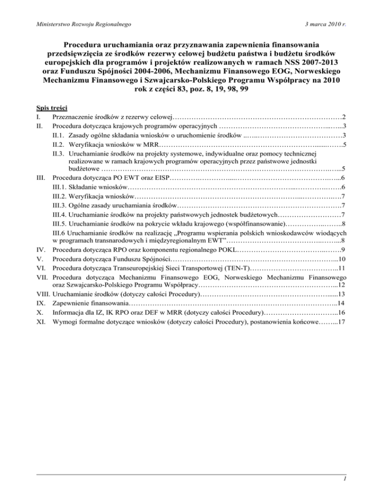 Ministerstwo Rozwoju Regionalnego 3 marca 2010 r. Procedura uruchamiania oraz przyznawania zapewnienia finansowania przedsięwzięcia ze środków rezerwy celowej budŜetu państwa i budŜetu środków europejskich dla programów i projektów realizowanych w ramach NSS 2007-2013 oraz Funduszu Spójności 2004-2006, Mechanizmu Finansowego EOG, Norweskiego Mechanizmu Finansowego i Szwajcarsko-Polskiego Programu Współpracy na 2010 rok z części 83, poz. 8, 19, 98, 99 Spis treści I. Przeznaczenie środków z rezerwy celowej………………………………………………………………2 II. Procedura dotycząca krajowych programów operacyjnych ………………………………………...…...3 II.1. Zasady ogólne składania wniosków o uruchomienie środków ..…..………………………………3 II.2. Weryfikacja wniosków w MRR………………………………………………………….......…….5 II.3. Uruchamianie środków na projekty systemowe, indywidualne oraz pomocy technicznej realizowane w ramach krajowych programów operacyjnych przez państwowe jednostki budŜetowe …………………………………………………………………………………….…...5 III. Procedura dotycząca PO EWT oraz EISP………….…………....………………………………….…...6 III.1. Składanie wniosków……………………………………………………………...………….…….6 III.2. Weryfikacja wniosków……………………………………………………………...………….….7 III.3. Ogólne zasady uruchamiania środków…………………………………………………………….7 III.4. Uruchamianie środków na projekty państwowych jednostek budŜetowych………………………7 III.5. Uruchamianie środków na pokrycie wkładu krajowego (współfinansowanie)……………..……..8 III.6 Uruchamianie środków na realizację „Programu wspierania polskich wnioskodawców wiodących w programach transnarodowych i międzyregionalnym EWT”…………………………………..……...8 IV. Procedura dotycząca RPO oraz komponentu regionalnego POKL………………………………..…….9 V. Procedura dotycząca Funduszu Spójności……………………………………………………………...10 VI. Procedura dotycząca Transeuropejskiej Sieci Transportowej (TEN-T)………………………………..11 VII. Procedura dotycząca Mechanizmu Finansowego EOG, Norweskiego Mechanizmu Finansowego oraz Szwajcarsko-Polskiego Programu Współpracy…………………………………………………...12 VIII. Uruchamianie środków (dotyczy całości Procedury)………………………………………………......13 IX. Zapewnienie finansowania……………………………………………………………………………..14 X. Informacja dla IZ, IK RPO oraz DEF w MRR (dotyczy całości Procedury)…………………………..16 XI. Wymogi formalne dotyczące wniosków (dotyczy całości Procedury), postanowienia końcowe……...17 1 Ministerstwo Rozwoju Regionalnego 3 marca 2010 r. I. Przeznaczenie środków z rezerwy celowej 2010 r. 1. W ustawie budŜetowej na 2010 rok środki rezerwy celowej na realizację programów ujęto w: a) budŜecie państwa, w tym: a) CZĘŚĆ 83, POZYCJA 8 - „Współfinansowanie projektów realizowanych z udziałem środków europejskich, finansowanie projektów z udziałem środków otrzymywanych od państw członkowskich Europejskiego Porozumienia o Wolnym Handlu (EFTA), projektów z udziałem innych środków pochodzących z budŜetu Unii Europejskiej nie ujętych w budŜecie środków europejskich, finansowanie projektów pomocy technicznej, finansowanie Wspólnej Polityki Rolnej, a takŜe na pokrycie potrzeb wynikających z róŜnic kursowych przy realizacji programów finansowanych z UE”, b) CZĘŚĆ 83, POZYCJA 19 - „Rezerwa płacowa na zmiany organizacyjne i nowe zadania (w tym na skutki przechodzące z 2009 r.) oraz na wynagrodzenia osób zajmujących się programami finansowanymi z budŜetu UE”; b) budŜecie środków europejskich, w tym: a) CZĘŚĆ 83, POZYCJA 98 - „Finansowanie programów z budŜetu środków europejskich”, b) CZĘŚĆ 83, POZYCJA 99 - „Finansowanie wynagrodzeń w ramach budŜetu środków europejskich”. 2. Finansowaniu z poszczególnych rezerw celowych, określonych w pkt 1 mogą podlegać następujące rodzaje wydatków: a) Finansowanie programów: − PO Kapitał Ludzki (dalej PO KL), − PO Innowacyjna Gospodarka (dalej PO IG), − PO Infrastruktura i Środowisko (dalej PO IiŚ), − PO Rozwój Polski Wschodniej (dalej PO RPW), − Programów Operacyjnych Europejskiej Współpracy Terytorialnej i Europejskiego Instrumentu Sąsiedztwa i Partnerstwa (dalej PO EWT i EISP), − PO Pomoc Techniczna (dalej PO PT), − Regionalnych Programów Operacyjnych (dalej RPO), − Mechanizmu Finansowego Europejskiego Obszaru Gospodarczego, Norweskiego Mechanizmu Finansowego (dalej MF EOG, NMF), − Szwajcarsko-Polskiego Programu Współpracy (dalej SPPW). b) W wyjątkowych uzasadnionych przypadkach moŜliwe jest finansowanie ze środków rezerwy celowej kosztów operacyjnych związanych z zamykaniem projektów w ramach MF EOG i NMF oraz na wydatki związane z kontrolą I stopnia w ramach Programu Współpracy Transgranicznej Południowy Bałtyk 2007-2013 oraz programów współpracy transnarodowej i międzyregionalnej a takŜe kontrolą trwałości mikroprojektów zrealizowanych w ramach Programów IW INTERREG III A w sytuacji, gdy wykorzystane zostały wszelkie inne moŜliwości otrzymania środków na finansowanie tych kosztów z innych źródeł. O zasadności przyznania finansowania rozstrzyga IZ/KK właściwego programu. c) Wydatki związane z realizacją projektów finansowanych z grantów Komisji Europejskiej w ramach środków funduszy strukturalnych i Funduszu Spójności. d) Wyda