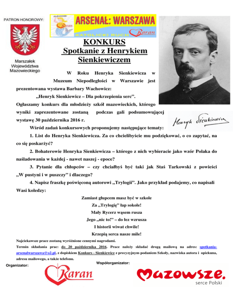 KONKURS Spotkanie z Henrykiem Sienkiewiczem W Roku Henryka Sienkiewicza w Muzeum Niepodległości w Warszawie jest prezentowana wystawa Barbary Wachowicz: „Henryk Sienkiewicz – Dla pokrzepienia serc”. Ogłaszamy konkurs dla młodzieży szkół mazowieckich, którego wyniki zaprezentowane zostaną podczas gali podsumowującej wystawę 30 października 2016 r. Wśród zadań konkursowych proponujemy następujące tematy: 1. List do Henryka Sienkiewicza. Za co chcielibyście mu podziękować, o co zapytać, na co się poskarżyć? 2. Bohaterowie Henryka Sienkiewicza – którego z nich wybieracie jako wzór Polaka do naśladowania w każdej - nawet naszej - epoce? 3. Pytanie dla chłopców – czy chciałbyś być taki jak Staś Tarkowski z powieści „W pustyni i w puszczy” i dlaczego? 4. Napisz fraszkę poświęconą autorowi „Trylogii”. Jako przykład podajemy, co napisali Wasi koledzy: Zamiast głupcem masz być w szkole Za „Trylogię” łap sokole! Mały Rycerz wąsem rusza Jego „nic to!” – do łez wzrusza I historii wiwat chwile! Krzepią serca nasze mile! Najciekawsze prace zostaną wyróżnione cennymi nagrodami. Termin składania prac: do 20 października 2016. Prace należy składać drogą mailową na adres: [email protected], z dopiskiem Konkurs - Sienkiewicz z precyzyjnym podaniem Szkoły, nazwiska autora i opiekuna, adresu mailowego, a także telefonu. Organizator: Współorganizator: