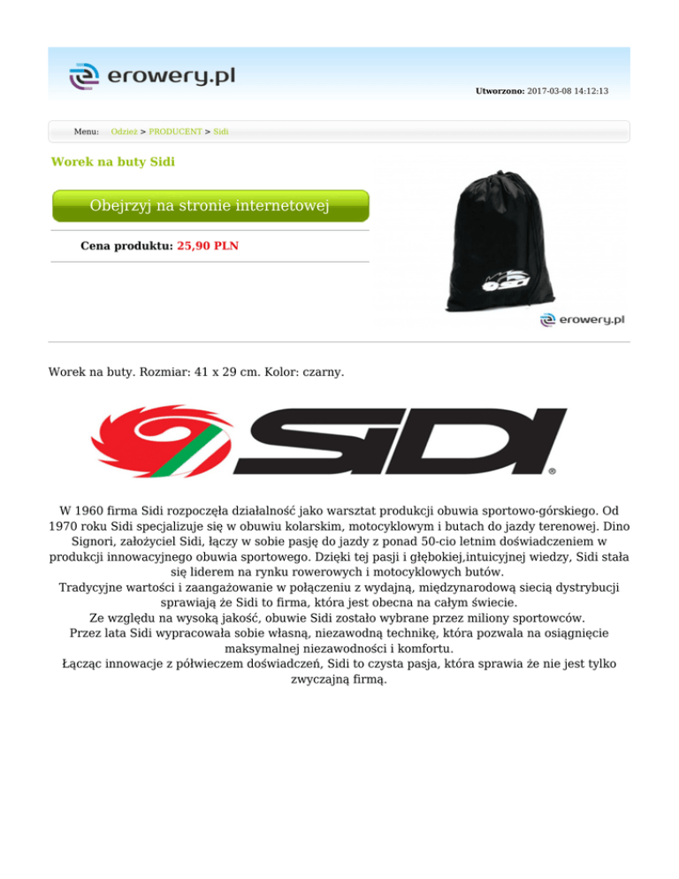 Utworzono: 2017-03-08 14:12:13 Menu: Odzież > PRODUCENT > Sidi Worek na buty Sidi Obejrzyj na stronie internetowej Cena produktu: 25,90 PLN Worek na buty. Rozmiar: 41 x 29 cm. Kolor: czarny. W 1960 firma Sidi rozpoczęła działalność jako warsztat produkcji obuwia sportowo-górskiego. Od 1970 roku Sidi specjalizuje się w obuwiu kolarskim, motocyklowym i butach do jazdy terenowej. Dino Signori, założyciel Sidi, łączy w sobie pasję do jazdy z ponad 50-cio letnim doświadczeniem w produkcji innowacyjnego obuwia sportowego. Dzięki tej pasji i głębokiej,intuicyjnej wiedzy, Sidi stała się liderem na rynku rowerowych i motocyklowych butów. Tradycyjne wartości i zaangażowanie w połączeniu z wydajną, międzynarodową siecią dystrybucji sprawiają że Sidi to firma, która jest obecna na całym świecie. Ze względu na wysoką jakość, obuwie Sidi zostało wybrane przez miliony sportowców. Przez lata Sidi wypracowała sobie własną, niezawodną technikę, która pozwala na osiągnięcie maksymalnej niezawodności i komfortu. Łącząc innowacje z półwieczem doświadczeń, Sidi to czysta pasja, która sprawia że nie jest tylko zwyczajną firmą. Kolor Czarny_#000000 Mimo dołożenia wszelkich starań nie gwarantujemy, że publikowane opisy i specyfikacje techniczne niezawierają uchybień lub błędów, które nie mogą jednak być podstawą do roszczeń. W przypadku jakichkolwiek wątpliwości, przed podjęciem decyzji prosimy o kontakt. Adres: www.erowery.pl Telefon: 605 515 185, 34 361 16 71 Email: [email protected]
