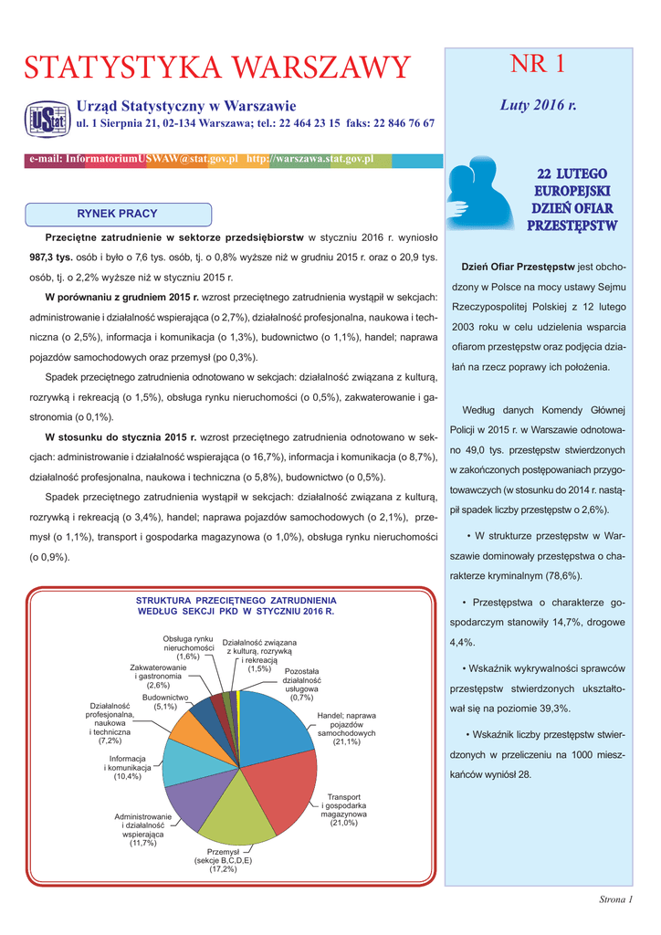 NR 1 STATYSTYKA WARSZAWY Urząd Statystyczny w Warszawie Luty 2016 r. ul. 1 Sierpnia 21, 02-134 Warszawa; tel.: 22 464 23 15 faks: 22 846 76 67 e-mail: [email protected] http://warszawa.stat.gov.pl 22 LUTEGO EUROPEJSKI DZIEŃ OFIAR PRZESTĘPSTW RYNEK PRACY Przeciętne zatrudnienie w sektorze przedsiębiorstw w styczniu 2016 r. wyniosło 987,3 tys. osób i było o 7,6 tys. osób, tj. o 0,8% wyższe niż w grudniu 2015 r. oraz o 20,9 tys. osób, tj. o 2,2% wyższe niż w styczniu 2015 r. W porównaniu z grudniem 2015 r. wzrost przeciętnego zatrudnienia wystąpił w sekcjach: administrowanie i działalność wspierająca (o 2,7%), działalność profesjonalna, naukowa i techniczna (o 2,5%), informacja i komunikacja (o 1,3%), budownictwo (o 1,1%), handel; naprawa pojazdów samochodowych oraz przemysł (po 0,3%). Spadek przeciętnego zatrudnienia odnotowano w sekcjach: działalność związana z kulturą, Dzień Ofiar Przestępstw jest obchodzony w Polsce na mocy ustawy Sejmu Rzeczypospolitej Polskiej z 12 lutego 2003 roku w celu udzielenia wsparcia ofiarom przestępstw oraz podjęcia działań na rzecz poprawy ich położenia. rozrywką i rekreacją (o 1,5%), obsługa rynku nieruchomości (o 0,5%), zakwaterowanie i gaWedług danych Komendy Głównej stronomia (o 0,1%). W stosunku do stycznia 2015 r. wzrost przeciętnego zatrudnienia odnotowano w sekcjach: administrowanie i działalność wspierająca (o 16,7%), informacja i komunikacja (o 8,7%), działalność profesjonalna, naukowa i techniczna (o 5,8%), budownictwo (o 0,5%). Spadek przeciętnego zatrudnienia wystąpił w sekcjach: działalność związana z kulturą, rozrywką i rekreacją (o 3,4%), handel; naprawa pojazdów samochodowych (o 2,1%), przemysł (o 1,1%), transport i gospodarka magazynowa (o 1,0%), obsługa rynku nieruchomości Policji w 2015 r. w Warszawie odnotowano 49,0 tys. przestępstw stwierdzonych w zakończonych postępowaniach przygotowawczych (w stosunku do 2014 r. nastąpił spadek liczby przestępstw o 2,6%). • W strukturze przestępstw w Warszawie dominowały przestępstwa o cha- (o 0,9%). rakterze kryminalnym (78,6%). STRUKTURA PRZECIĘTNEGO ZATRUDNIENIA WEDŁUG SEKCJI PKD W STYCZNIU 2016 R. • Przestępstwa o charakterze gospodarczym stanowiły 14,7%, drogowe Obsługa rynku nieruchomości (1,6%) Zakwaterowanie i gastronomia (2,6%) Działalność profesjonalna, naukowa i techniczna (7,2%) Budownictwo (5,1%) 4,4%. Działalność związana z kulturą, rozrywką i rekreacją (1,5%) Pozostała działalność usługowa (0,7%) • Wskaźnik wykrywalności sprawców przestępstw stwierdzonych ukształto- Handel; naprawa pojazdów samochodowych (21,1%) wał się na poziomie 39,3%. • Wskaźnik liczby przestępstw stwierdzonych w przeliczeniu na 1000 miesz- Informacja i komunikacja (10,4%) kańców wyniósł 28. Transport i gospodarka magazynowa (21,0%) Administrowanie i działalność wspierająca (11,7%) Przemysł (sekcje B,C,D,E) (17,2%) Strona 1 RYNEK PRACY (dok.) Podstawowe dane o m.st. Warszawie W końcu stycznia 2016 r. liczba zarejestrowanych bezrobotnych wyniosła 40893 osoby, była o 1169 osób, tj. o 2,9% większa niż w końcu grudnia 2015 r. i o 9113 osób, Przeciętne zatrudnienie w sektorze przedsiębiorstw w styczniu 2016 r. wyniosło 987,3 tys. osób i było o 2,2% wyższe niż przed rokiem. Przeciętne miesięczne wynagrodzenie brutto w sektorze przedsiębiorstw tj. o 18,2% mniejsza niż w analogicznym okresie 2015 r. Liczba zarejestrowanych bezrobotnych kobiet wyniosła 19710, co stanowiło 48,2% ogółu bezrobotnych (przed miesiącem 48,4%, przed rokiem 48,1%) i 18,2% bezrobotnych kobiet w województwie mazowieckim. W stosunku do grudnia 2015 r. liczba bezrobotnych kobiet zwiększyła się o 498 osób, tj. o 2,6%, a w stosunku do stycznia 2015 r. zmniejszyła się o 4330 osób, tj. o 18,0%. w styczniu 2016 r. wyniosło 5366,41 zł Stopa bezrobocia rejestrowanego wynosiła 3,5% (w grudniu 2015 r. wynosiła 3,4%, i było o 4,5% wyższe niż w styczniu 2015 r. a w styczniu 2015 r. 4,3%), średnia w województwie mazowieckim kształtowała się na poziomie 8,7% (przed miesiącem 8,4%, a przed rokiem 10,0%), natomiast w kraju na poziomie W końcu stycznia 2016 r. liczba zarejestrowanych bezrobotnych wyniosła 40893 osoby i była o 18,2% mniejsza niż przed rokiem, a stopa bezrobocia ukształtowała się na poziomie 3,5%. 10,3% (przed miesiącem 9,8%, a przed rokiem 11,9%). W styczniu 2016 r. w urzędach pracy zarejestrowano 4625 osób bezrobotnych (3785 w grudniu 2015 r., a 5375 w styczniu 2015 r.). Bezrobotni zarejestrowani stanowili 18,0% ogółu zarejestrowanych bezrobotnych w województwie. Liczba osób rejestrujących się po raz pierwszy wyniosła 1425 (przed miesiącem 1043), W końcu stycznia 2016 r. liczba kobiet, które nie podjęły zatrudnienia po urodzeniu dziecka wyniosła 3400, tj. 17,3% ogółu zarejestrowanych bezrobotnych kobiet. co stanowiło 30,8% ogółu zarejestrowanych bezrobotnych w miesiącu sprawozdawczym oraz 29,8% zarejestrowanych po raz pierwszy w województwie. Udział osób zwolnionych z przyczyn dotyczących zakładu pracy wśród bezrobotnych zarejestrowanych w styczniu 2016 r. wyniósł 4,6% (w województwie mazowieckim 5,5%), przed miesiącem 3,5%, a przed rokiem 5,7%. Produkcja sprzedana przemysłu (w cenach stałych) w styczniu 2016 r. była o 4,1% mniejsza niż przed rokiem. W styczniu 2016 r. wyrejestrowano z ewidencji bezrobotnych 3456 osób (4973 w grudniu 2015 r., a 4209 w styczniu 2015 r.), co stanowiło 21,6% wyrejestrowanych z ewidencji bezrobotnych w województwie mazowieckim. Spośród wyrejestrowanych bezrobotnych 1979 osób podjęło pracę. Ponadto 994 osoby utraciły status bezrobotnego w wyniku Produkcja budowlano-montażowa (w cenach bieżących) w styczniu 2016 r. była o 30,6% większa niż przed rokiem. niepotwierdzenia gotowości do podjęcia pracy. Przyczyną skreślenia z ewidencji było również dobrowolne zrezygnowanie ze statusu bezrobotneg