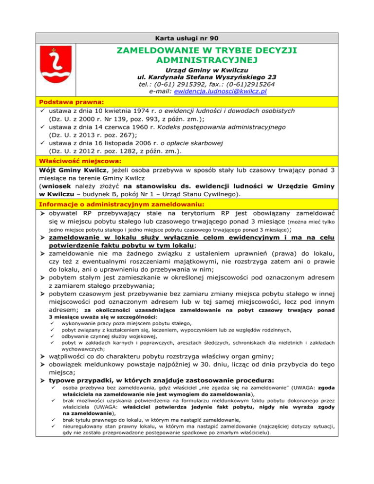 Karta usługi nr 90 ZAMELDOWANIE W TRYBIE DECYZJI ADMINISTRACYJNEJ Urząd Gminy w Kwilczu ul. Kardynała Stefana Wyszyńskiego 23 tel.: (0-61) 2915392, fax.: (0-61)2915264 e-mail: [email protected] Podstawa prawna: ustawa (Dz. U. ustawa (Dz. U. ustawa (Dz. U. z z z z z z dnia 10 kwietnia 1974 r. o ewidencji ludności i dowodach osobistych 2000 r. Nr 139, poz. 993, z późn. zm.); dnia 14 czerwca 1960 r. Kodeks postępowania administracyjnego 2013 r. poz. 267); dnia 16 listopada 2006 r. o opłacie skarbowej 2012 r. poz. 1282, z późn. zm.). Właściwość miejscowa: Wójt Gminy Kwilcz, jeżeli osoba przebywa w sposób stały lub czasowy trwający ponad 3 miesiące na terenie Gminy Kwilcz (wniosek należy złożyć na stanowisku ds. ewidencji ludności w Urzędzie Gminy w Kwilczu – budynek B, pokój Nr 1 – Urząd Stanu Cywilnego). Informacje o administracyjnym zameldowaniu: obywatel RP przebywający stale na terytorium RP jest obowiązany zameldować się w miejscu pobytu stałego lub czasowego trwającego ponad 3 miesiące (można mieć tylko jedno miejsce pobytu stałego i jedno miejsce pobytu czasowego trwającego ponad 3 miesiące); zameldowanie w lokalu służy wyłącznie celom ewidencyjnym i ma na celu potwierdzenie faktu pobytu w tym lokalu; zameldowanie nie ma żadnego związku z ustaleniem uprawnień (prawa) do lokalu, czy też z ewentualnymi roszczeniami majątkowymi, nie rozstrzyga zatem ani o prawie do lokalu, ani o uprawnieniu do przebywania w nim; pobytem stałym jest zamieszkanie w określonej miejscowości pod oznaczonym adresem z zamiarem stałego przebywania; pobytem czasowym jest przebywanie bez zamiaru zmiany miejsca pobytu stałego w innej miejscowości pod oznaczonym adresem lub w tej samej miejscowości, lecz pod innym adresem; za okoliczności uzasadniające zameldowanie na pobyt czasowy trwający ponad 3 miesiące uważa się w szczególności: wykonywanie pracy poza miejscem pobytu stałego, pobyt związany z kształceniem się, leczeniem, wypoczynkiem lub ze względów rodzinnych, odbywanie czynnej służby wojskowej, pobyt w zakładach karnych i poprawczych, aresztach śledczych, schroniskach dla nieletnich i zakładach wychowawczych; wątpliwości co do charakteru pobytu rozstrzyga właściwy organ gminy; obowiązek meldunkowy powstaje najpóźniej w 30. dniu, licząc od dnia przybycia do tego miejsca; typowe przypadki, w których znajduje zastosowanie procedura: osoba przebywa bez zameldowania, gdyż właściciel „nie zgadza się na zameldowanie” (UWAGA: zgoda właściciela na zameldowanie nie jest wymogiem do zameldowania), brak możliwości uzyskania potwierdzenia na formularzu meldunkowym faktu pobytu dokonanego przez właściciela (UWAGA: właściciel potwierdza jedynie fakt pobytu, nigdy nie wyraża zgody na zameldowanie), brak tytułu prawnego do lokalu, w którym ma nastąpić zameldowanie, nieuregulowany stan prawny lokalu, w którym ma nastąpić zameldowanie (najczęściej dotyczy sytuacji, gdy nie zostało przeprowadzone postępowanie spadkowe po zmarłym właścicielu). Wymagane dokumenty: wniosek o zameldowanie (wniosek do pobrania); wypełniony i podpisany formularz meldunkowy (odpowiednio do pobrania: zgłoszenie pobytu stałego lub zgłoszenie pobytu czasowego trwającego ponad 3 miesiące); zaświadczenie potwierdzające wymeldowanie z dotychczasowego miejsca pobytu stałego (dołącza się w sytuacji, gdy dotychczasowe miejsce pobytu stałego było poza terenem Gminy Kwilcz; nie dotyczy sytuacji, gdy osoba ubiega się o zameldowanie na pobyt czasowy); dokument uiszczenia opłaty skarbowej w wysokości 10 zł; inne dokumenty (jeśli są konieczne do potwierdzenia faktu pobytu). Postępowanie przed organem: przyjęcie wniosku do realizacji; weryfikacja pod względem formalnym złożonego wniosku wraz z załącznikami (jeśli wniosek jest niekompletny lub brakuje wymaganych załączników – następuje wezwanie do uzupełnienia braków formalnych); zawiadomienie o wszczęciu postępowania; przeprowadzenie postępowania wyjaśniającego i dowodowego (zbadanie, czy zachodzą przesłanki prawne do wydania decyzji o zameldowaniu; dowodami w sprawie mogą być: zeznania świadków i stron, oględziny lokalu, wywiad meldunkowy dokonany przez funkcjonariuszy Policji, dokumenty urzędowe oraz prywatne, rachunki potwierdzające uiszczanie opłat za lokal, itp.); wydanie decyzji administracyjnej o zameldowaniu lub o odmowie zameldowania osoby (następuje w terminie miesiąca, a w sprawach szczególnie skomplikowanych nie później niż w ciągu 2 miesięcy od daty wszczęcia postępowania; z uwagi na złożoność określonej sprawy terminy powyższe mogą ulec przedłużeniu); odwołanie od decyzji (jeśli strona/strony nie zgadza/ją się z jej treścią): wnoszone do Wojewody Wielkopolskiego za pośrednictwem Wójta Gminy Kwilcz w terminie 14 dni od dnia jej doręczenia stronie, wójt przekazuje odwołanie wraz z aktami sprawy w terminie 7 dni od dnia jego otrzymania, wojewoda rozpatruje odwołanie w terminie miesiąca od otrzymania odwołania (rozstrzygnięcie wojewody jest ostateczne w administracyjnym toku instancji); wykonanie decyzji (zameldowanie osoby; zawiadomienie właściwych organów o dokonanej czynności). Opłata skarbowa: Opłata skarbowa za wydanie decyzji administracyjnej o zameldowaniu osoby wynosi 10,00 zł. Opłatę można uiścić w kasie Urzędu Gminy w Kwilczu lub na rachunek bankowy Urzędu Gminy w Kwilczu nr 13 9082 0005 4200 0114 2000 0050. Przegląd orzeczeń sądów administracyjnych w sprawach o zameldowanie: O kwalifikacji pobytu przesądza możliwość ustalenia, że osoba tam mieszka, nocuje, przygotowuje posiłki, przyjmuje wizyty członków rodziny lub znajomych, utrzymuje chociażby okazjonalne kontakty z sąsiadami, przyjmuje i nadaje korespondencję. Sprawy meldunkowe należące do kategorii zagadnień ze sfery prawa administracyjnego służą tym samym wyłącznie rejestracji stanu faktycznego, a nie pra