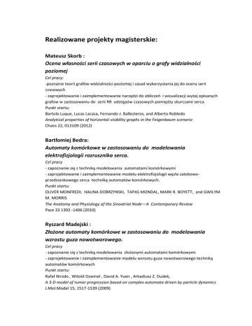 Realizowane projekty magisterskie: Mateusz Skorb : Ocena własności serii czasowych w oparciu o grafy widzialności poziomej Cel pracy: -poznanie teorii grafów widzialności poziomej i zasad wykorzystania jej do oceny serii czasowych - zaprojektowanie i zaimplementowanie narzędzi do obliczeń i wizualizacji wyżej opisanych grafow w zastosowaniu do serii RR odstępów czasowych pomiędzy skurczami serca. Punkt startu: Bartolo Luque, Lucas Lacasa, Fernando J. Ballesteros, and Alberto Robledo Analytical properties of horizontal visibility graphs in the Feigenbaum scenario Chaos 22, 013109 (2012) Bartłomiej Bedra: Automaty komórkowe w zastosowaniu do modelowania elektrofizjologii rozrusznika serca. Cel pracy - zapoznanie się z techniką modelowania automatami komórkowymi - zaprojektowanie i zaimplementowanie modelu elektrofizjologii węzła zatokowoprzedsionkowego serca techniką automatów komórkowych. Punkt startu: OLIVER MONFREDI, HALINA DOBRZYNSKI, TAPAS MONDAL, MARK R. BOYETT, and GWILYM M. MORRIS The Anatomy and Physiology of the Sinoatrial Node—A Contemporary Review Pace 33 1392 -1406 (2010) Ryszard Madejski : Złożone automaty komórkowe w zastosowaniu do modelowania wzrostu guza nowotworowego. Cel pracy - zapoznanie się z techniką modelowania złożonymi automatami komórkowymi - zaprojektowanie i zaimplementowanie modelu wzrostu guza nowotworowego techniką automatów komórkowych Punkt startu: Rafał Wcisło , Witold Dzwinel , David A. Yuen , Arkadiusz Z. Dudek, A 3-D model of tumor progression based on complex automata driven by particle dynamics J.Mol.Model 15, 1517-1539 (2009)